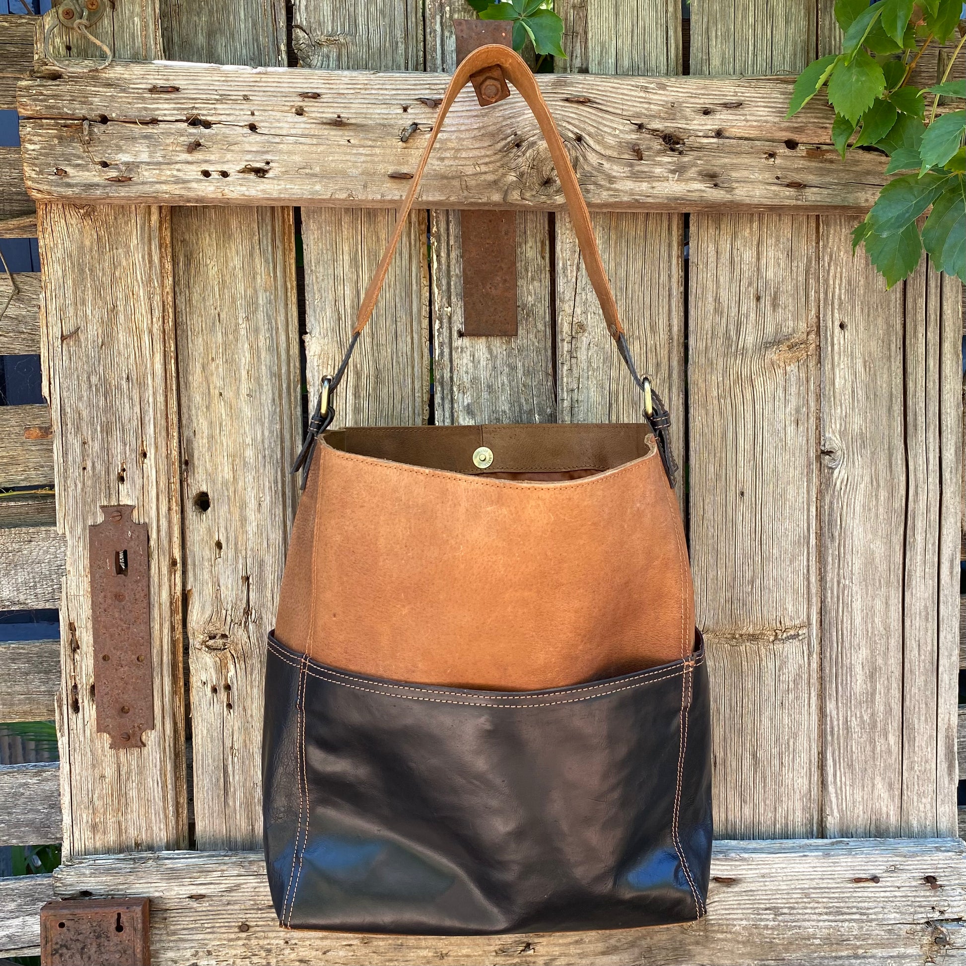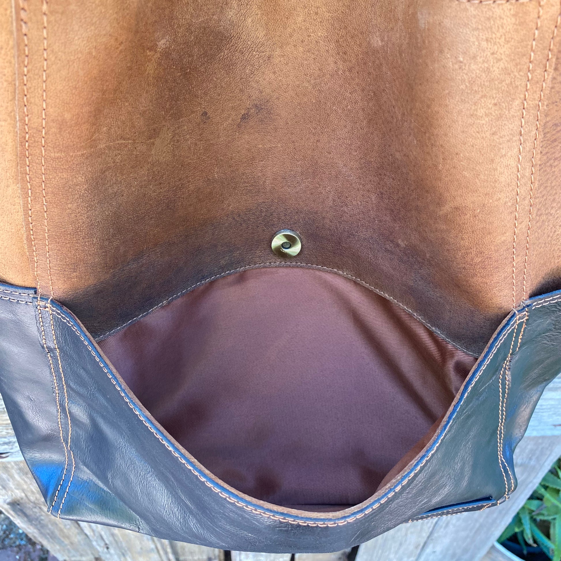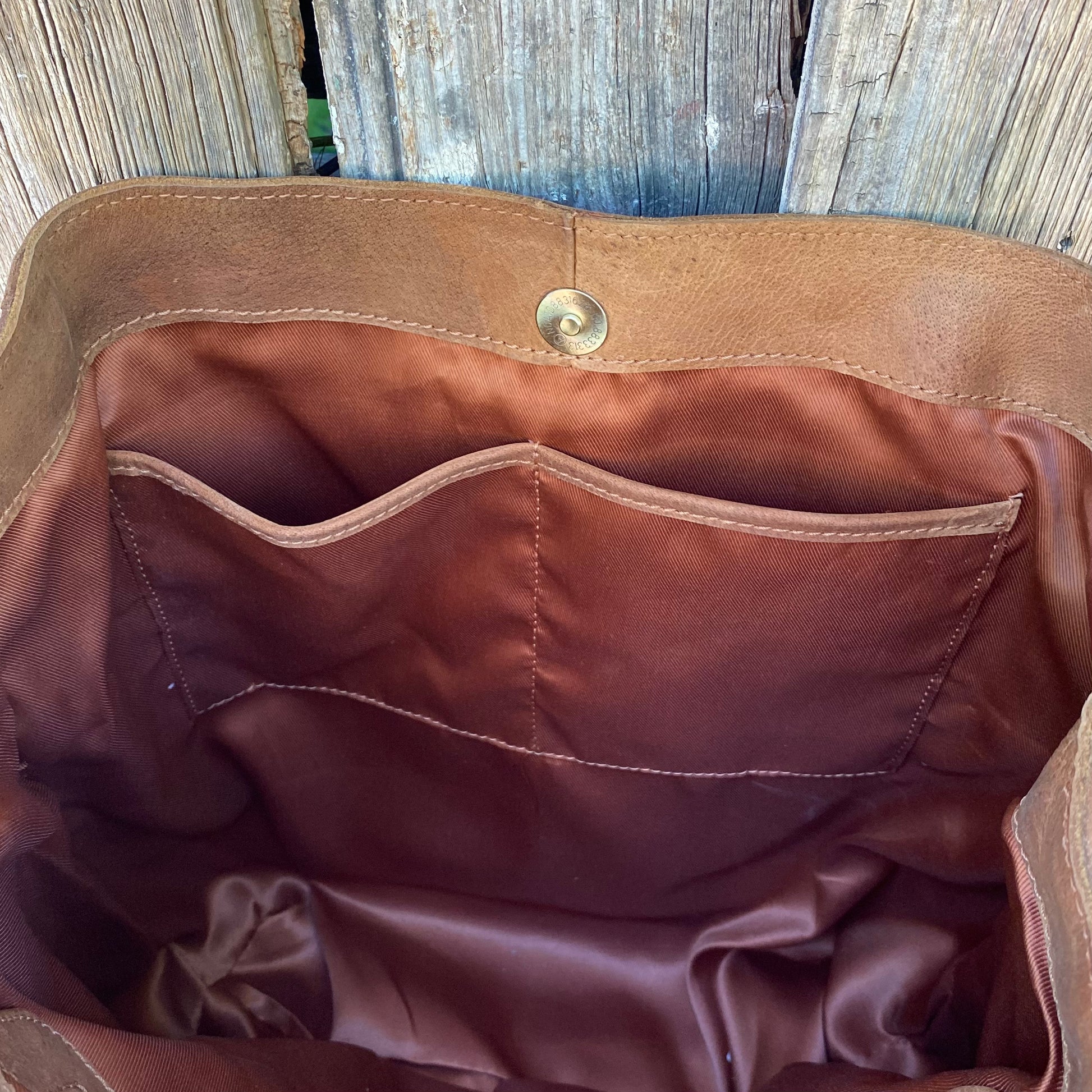 1. A large leather strong tote style bag used for every day with four pockets as the feature.