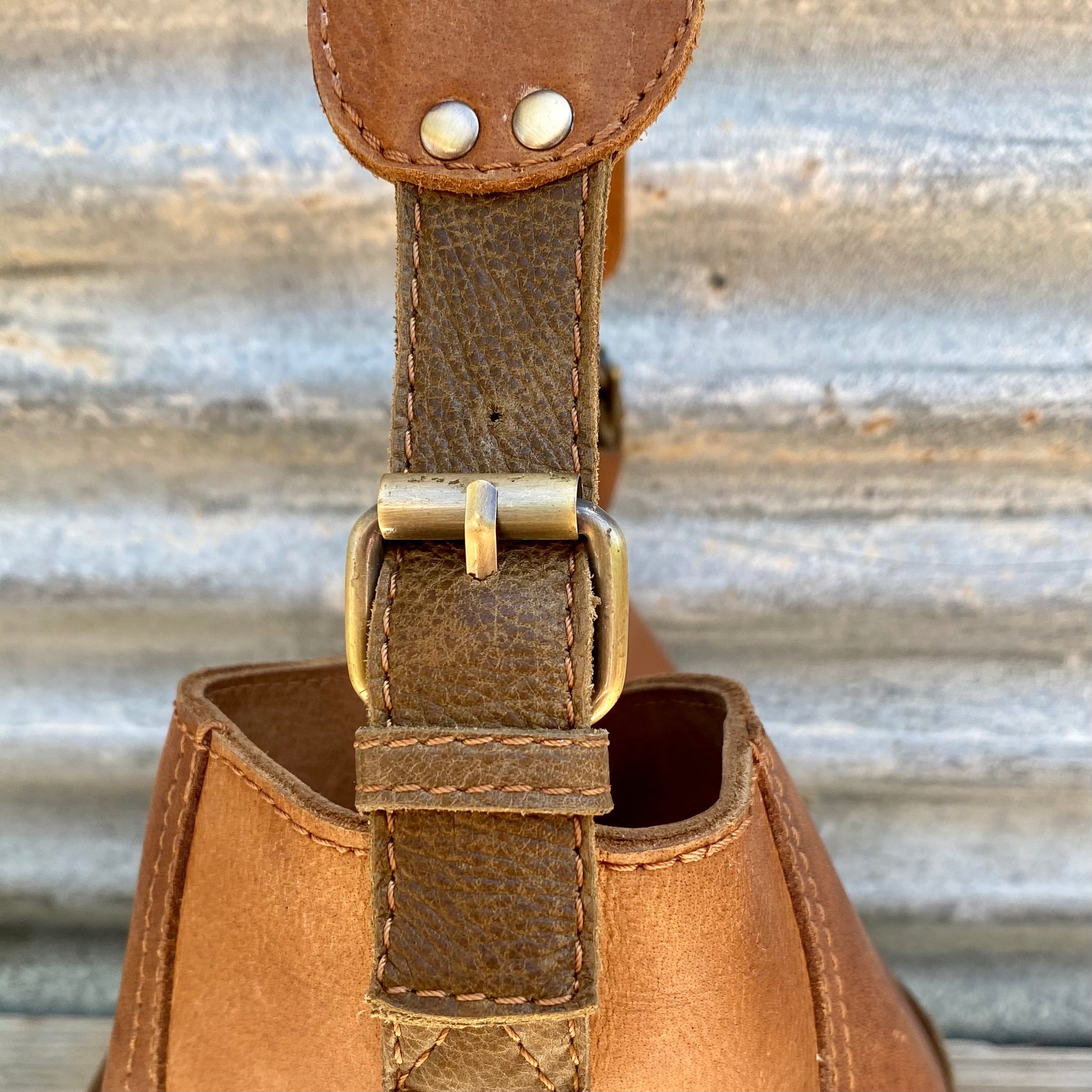 Strap - 5.3cm wide adjustable with antique brass buckles each side. Shortest - 56cm to longest 65cm shortest