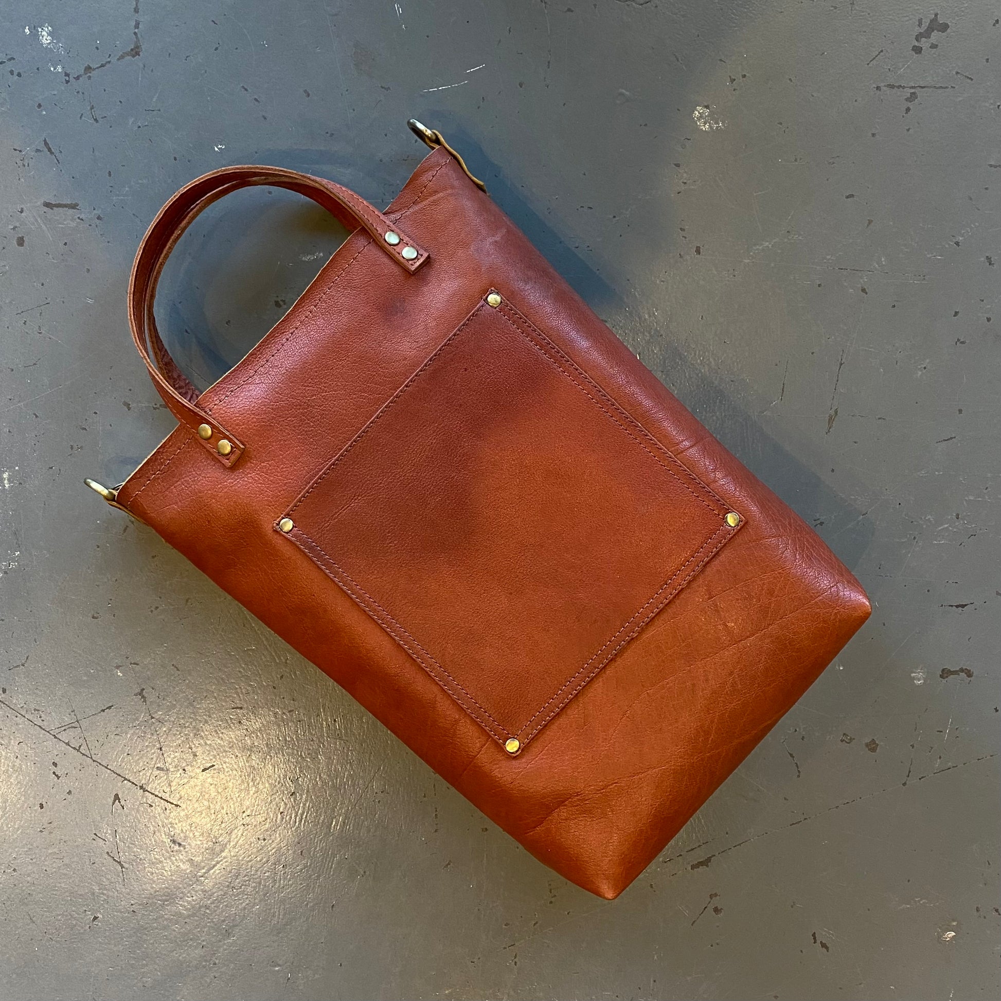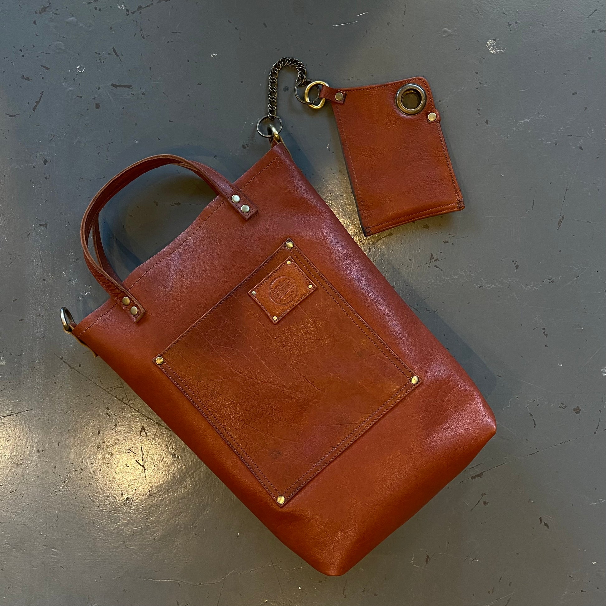 1. a sleek tote style bag crafted from an aged rust tan leather. the bag has a slender design which is stylish and the vintage leather is both beautiful and cool, with pockets which can carry your supplies. accompanying the bag is a small leather pouch connected by a chain which can hold small items such as coins or lip balm, making a unique and interesting addition to an already gorgeous tote.