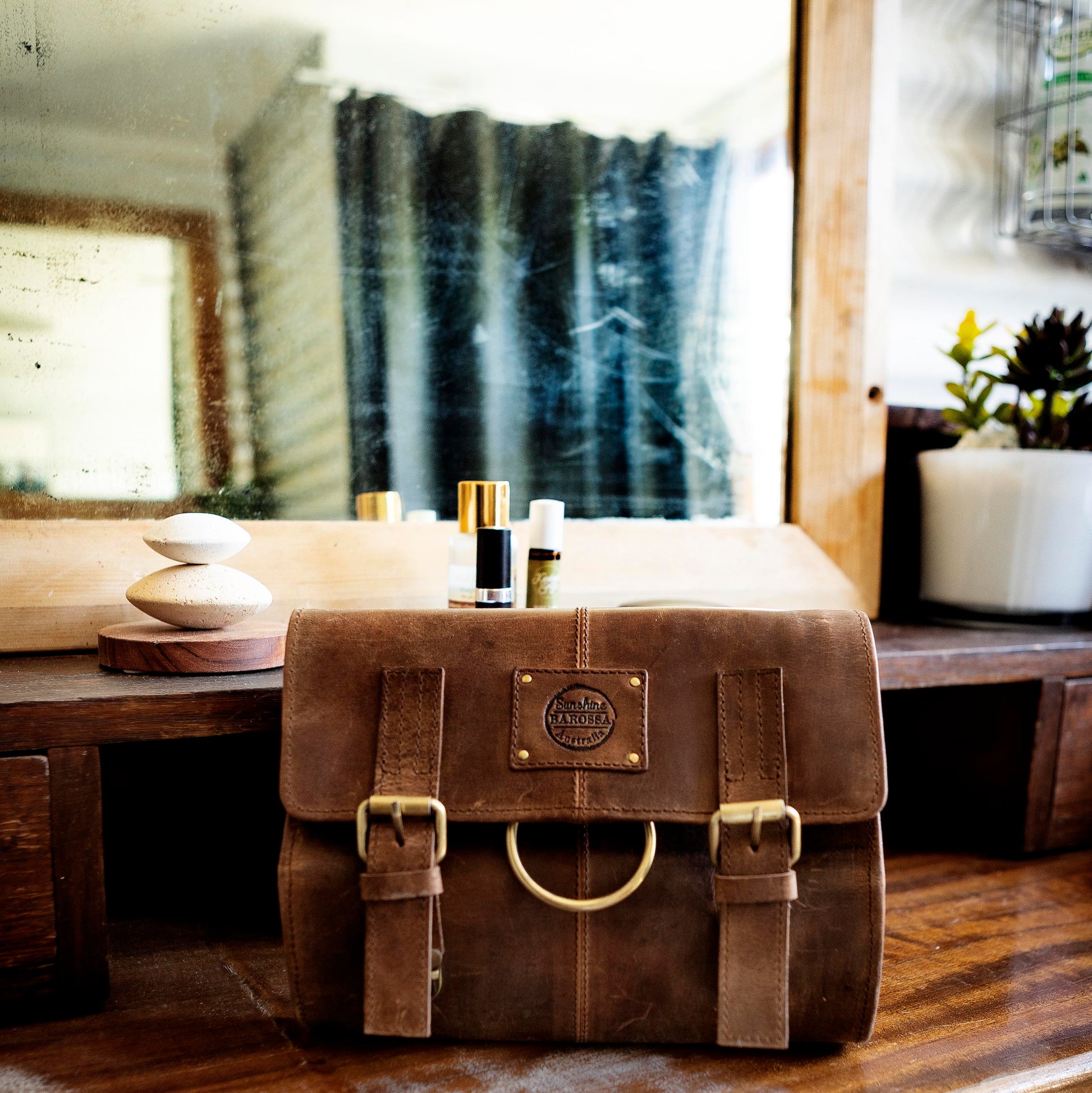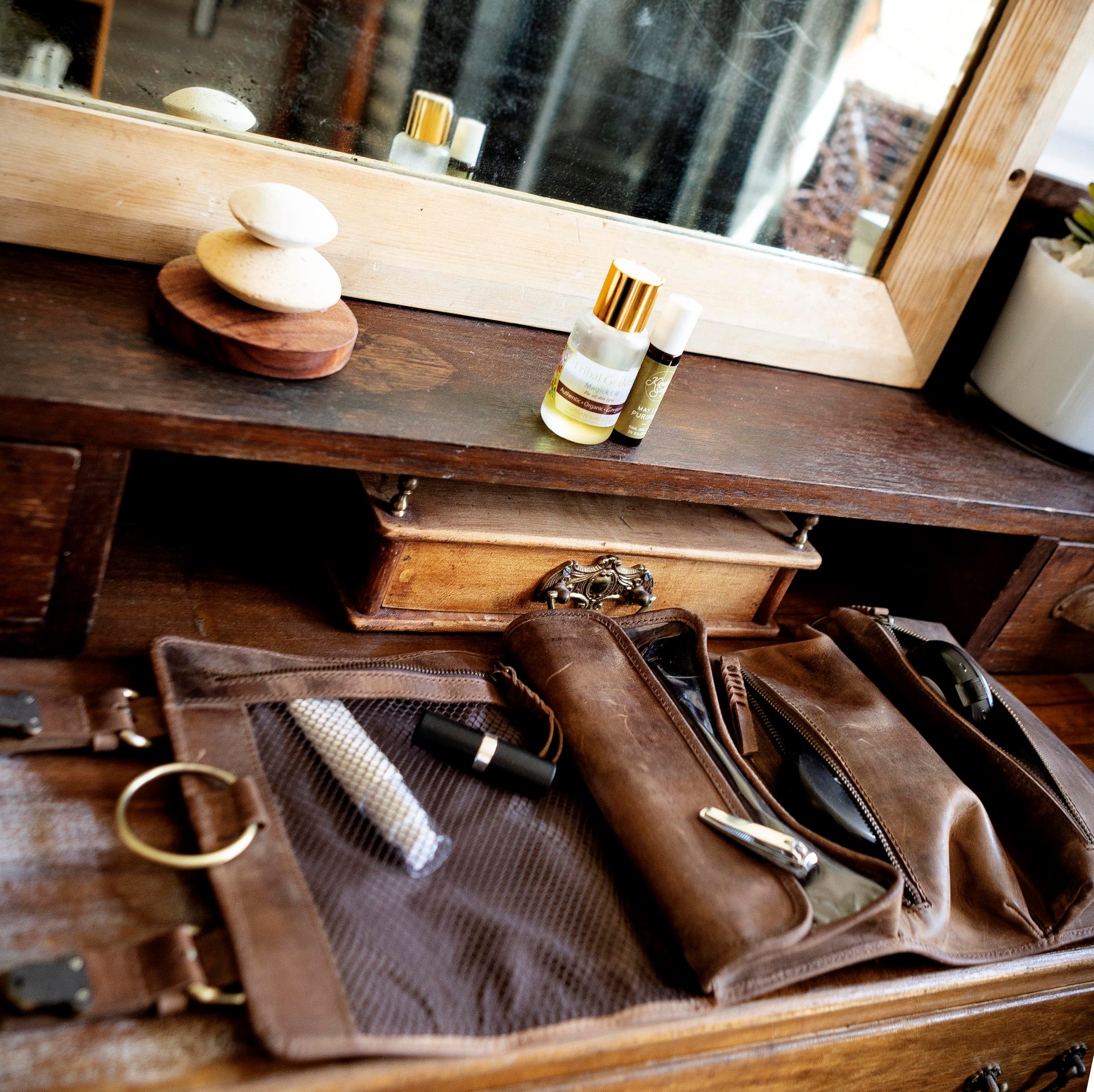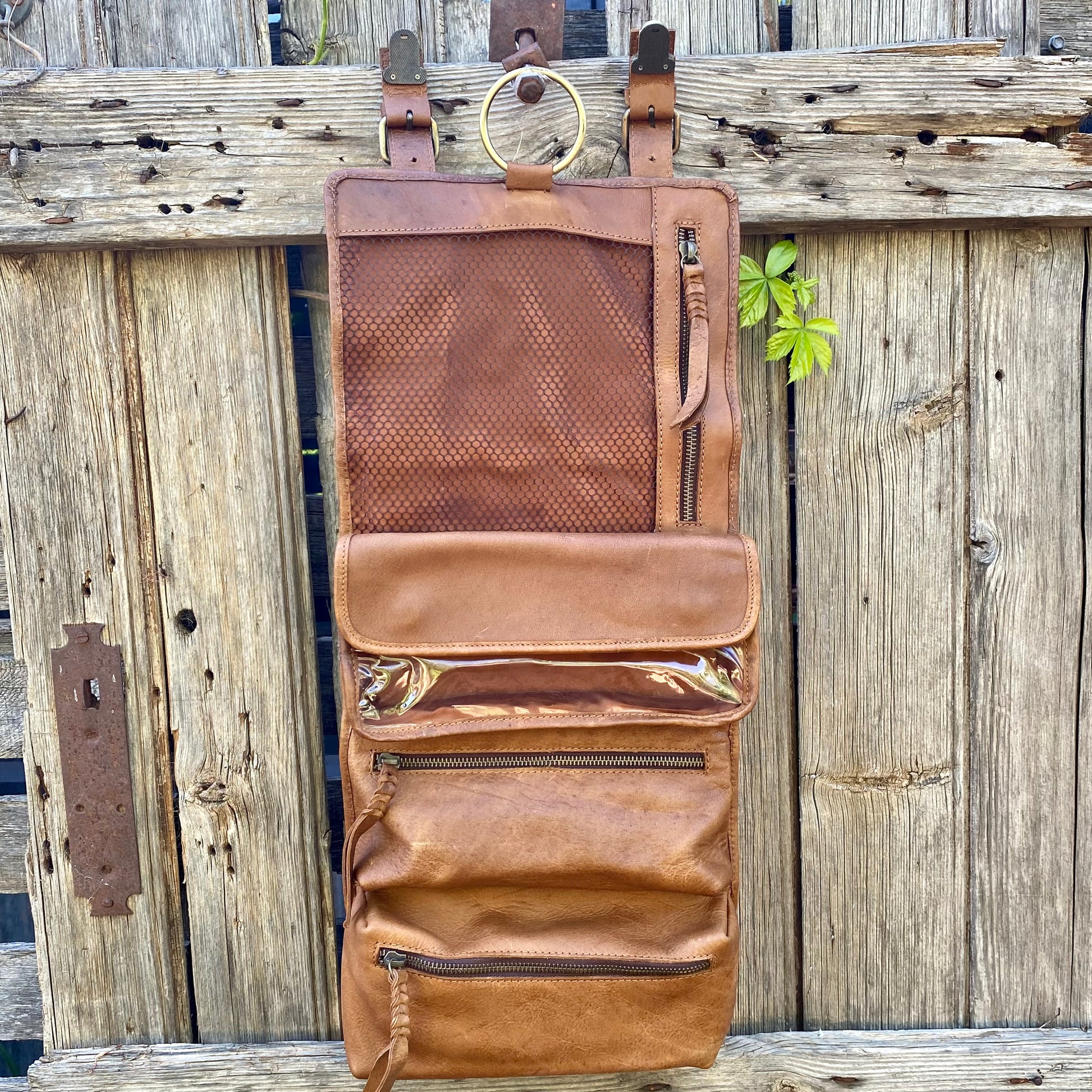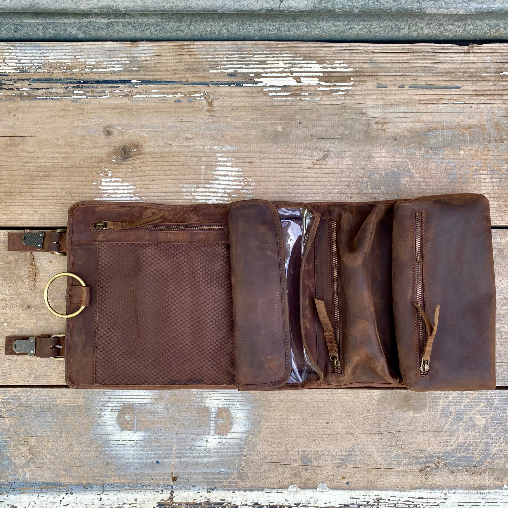 1. a leather bag with compartments that rolls up for travel or hangs when open, used for holding personal bathroom/ toilet items.