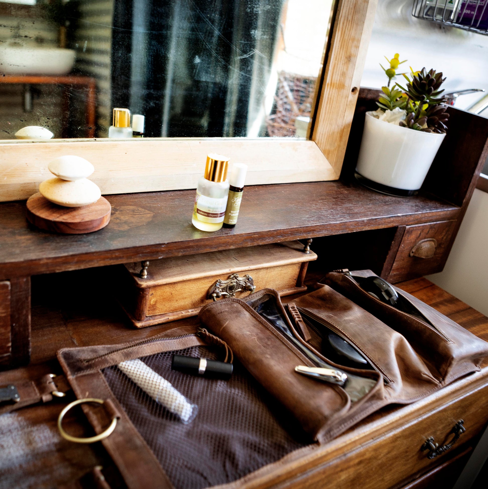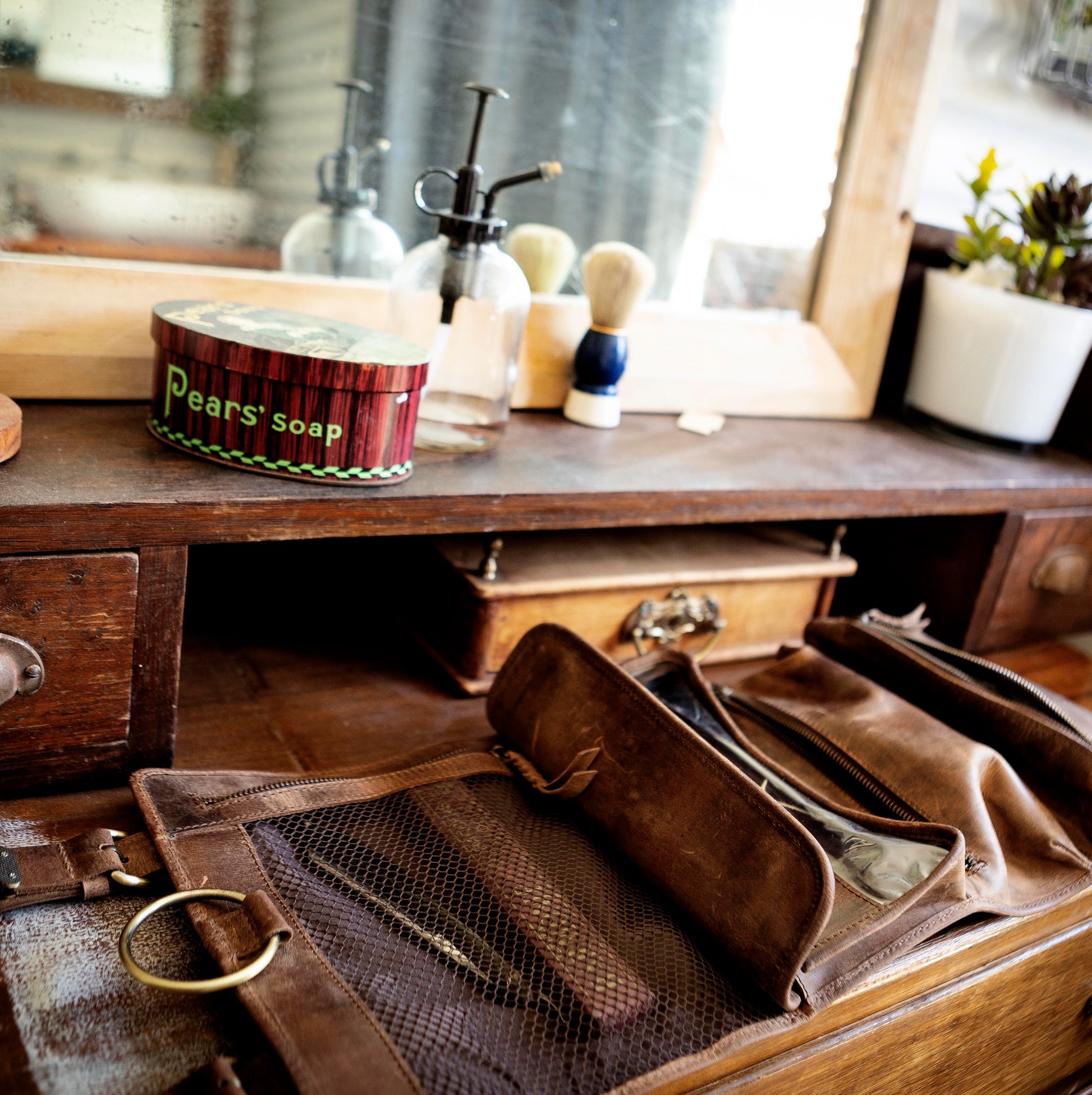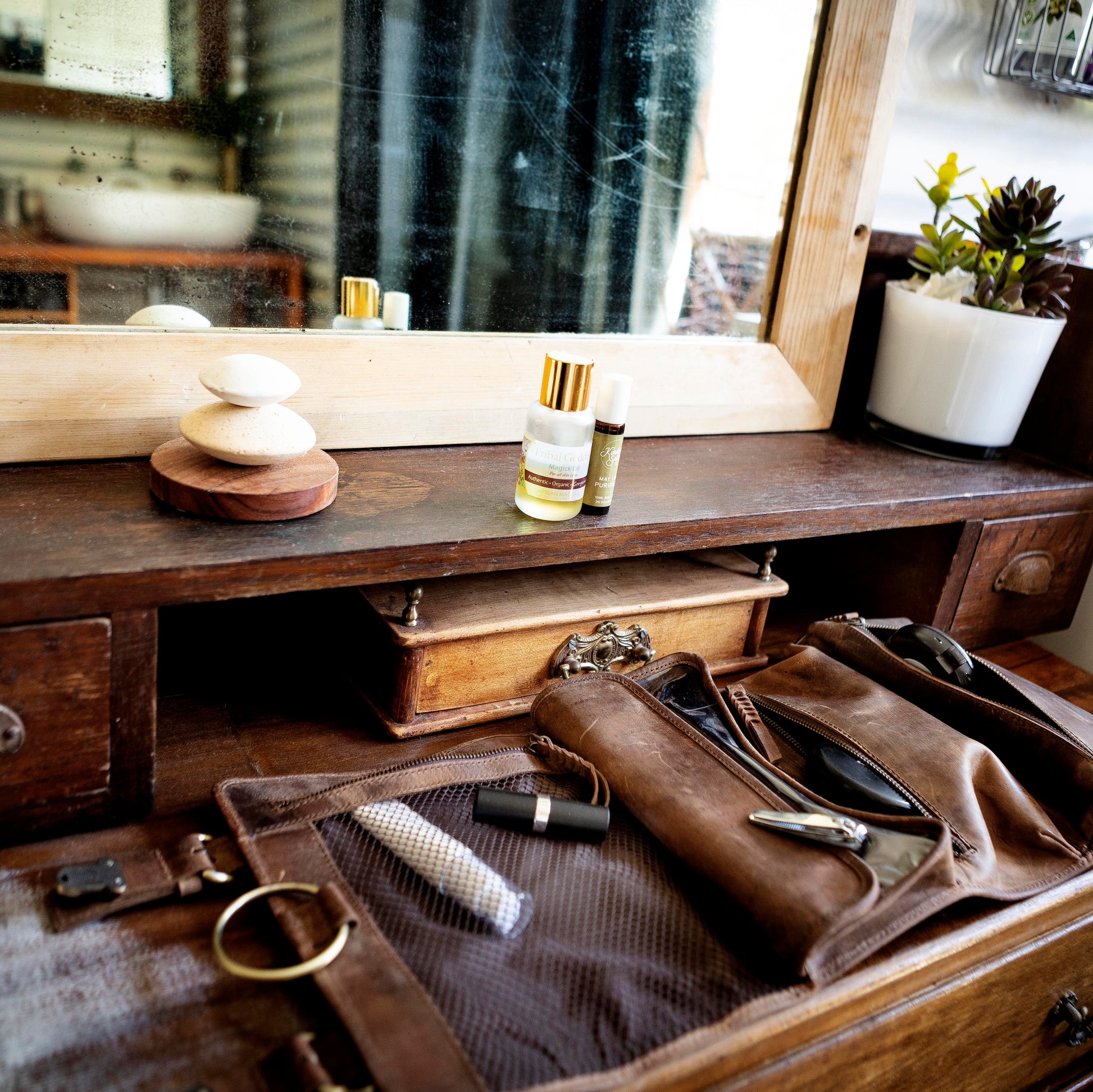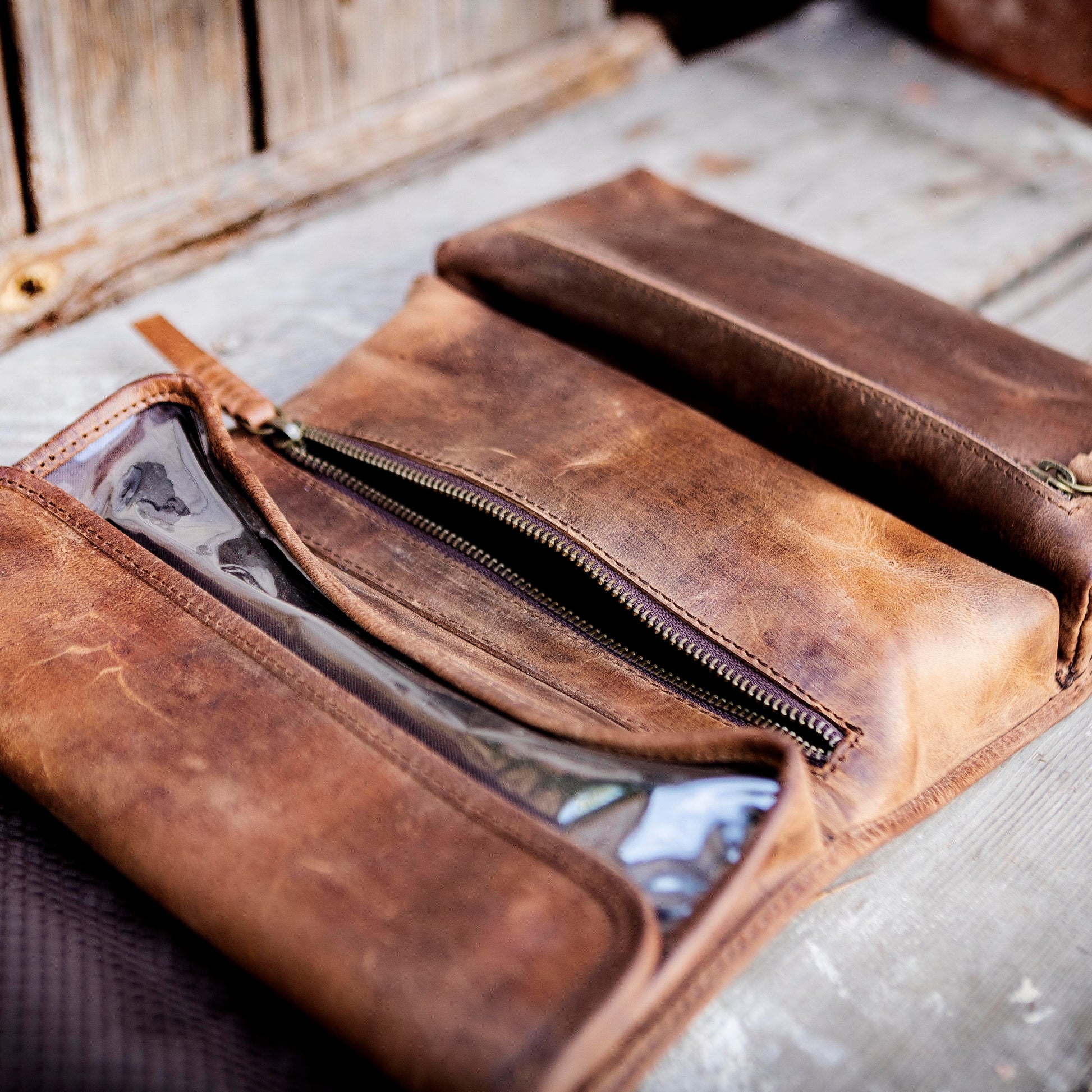 1. a leather bag with compartments that rolls up for travel or hangs when open, used for holding personal bathroom/ toilet items.