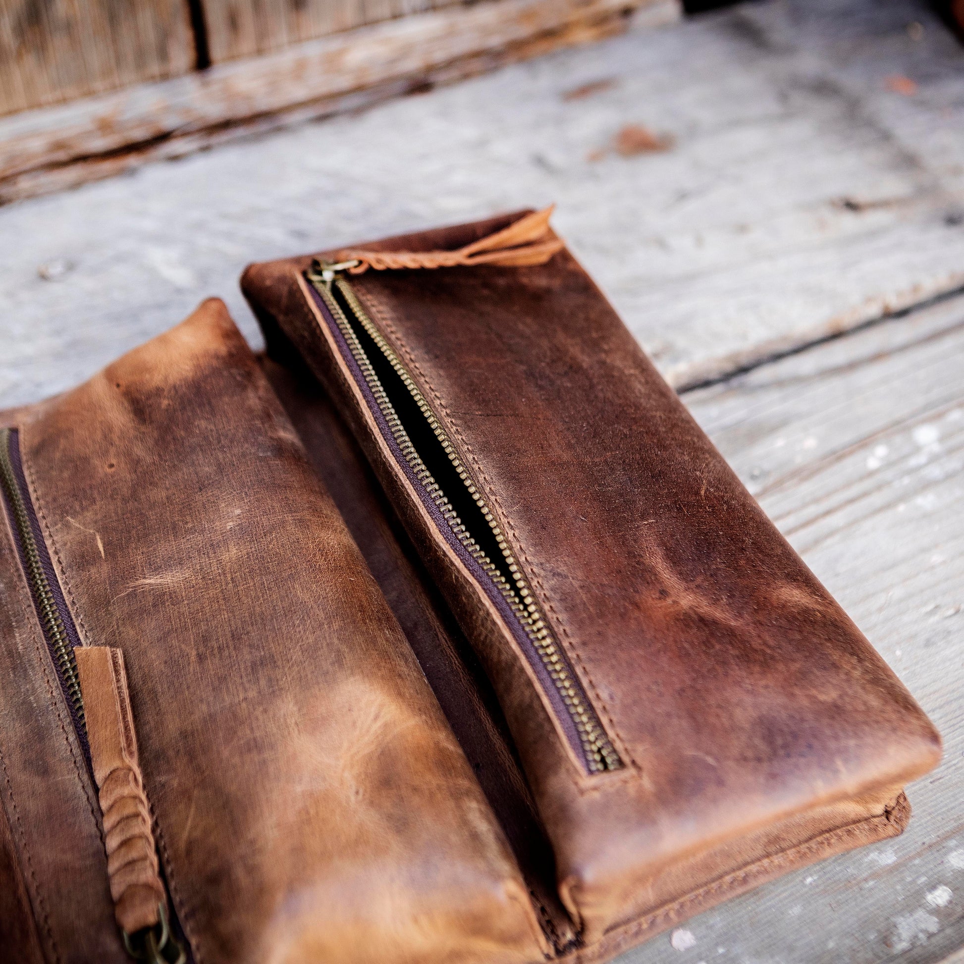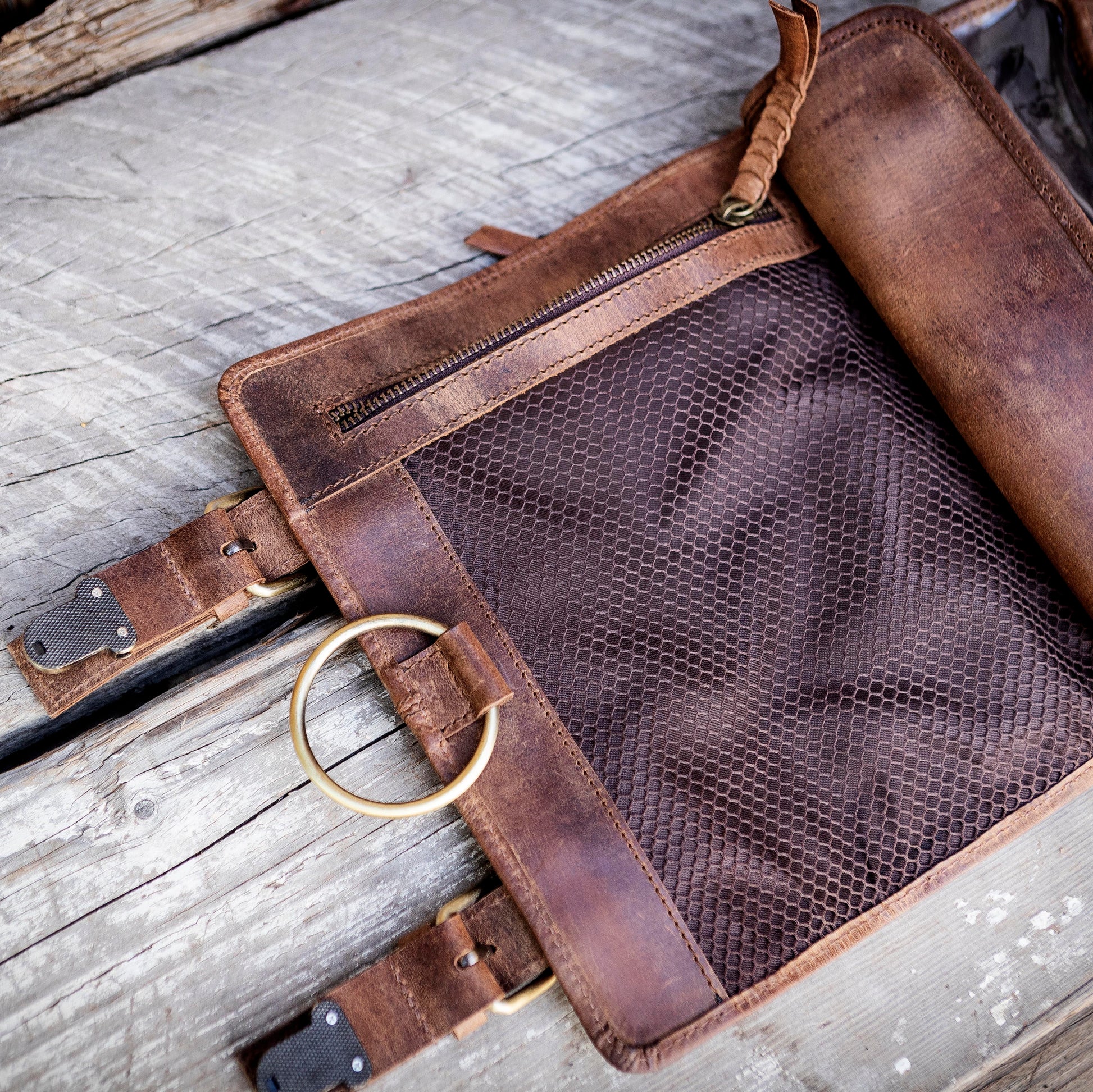 Featuring two straps with antique brass buckles on the front the roll opens with quick-release metal lock tuck clasps concealed by the buckles. This clever bag has a handle on the exterior to make carrying it comfortable and easy as well as a handy zippered pocket on the back.