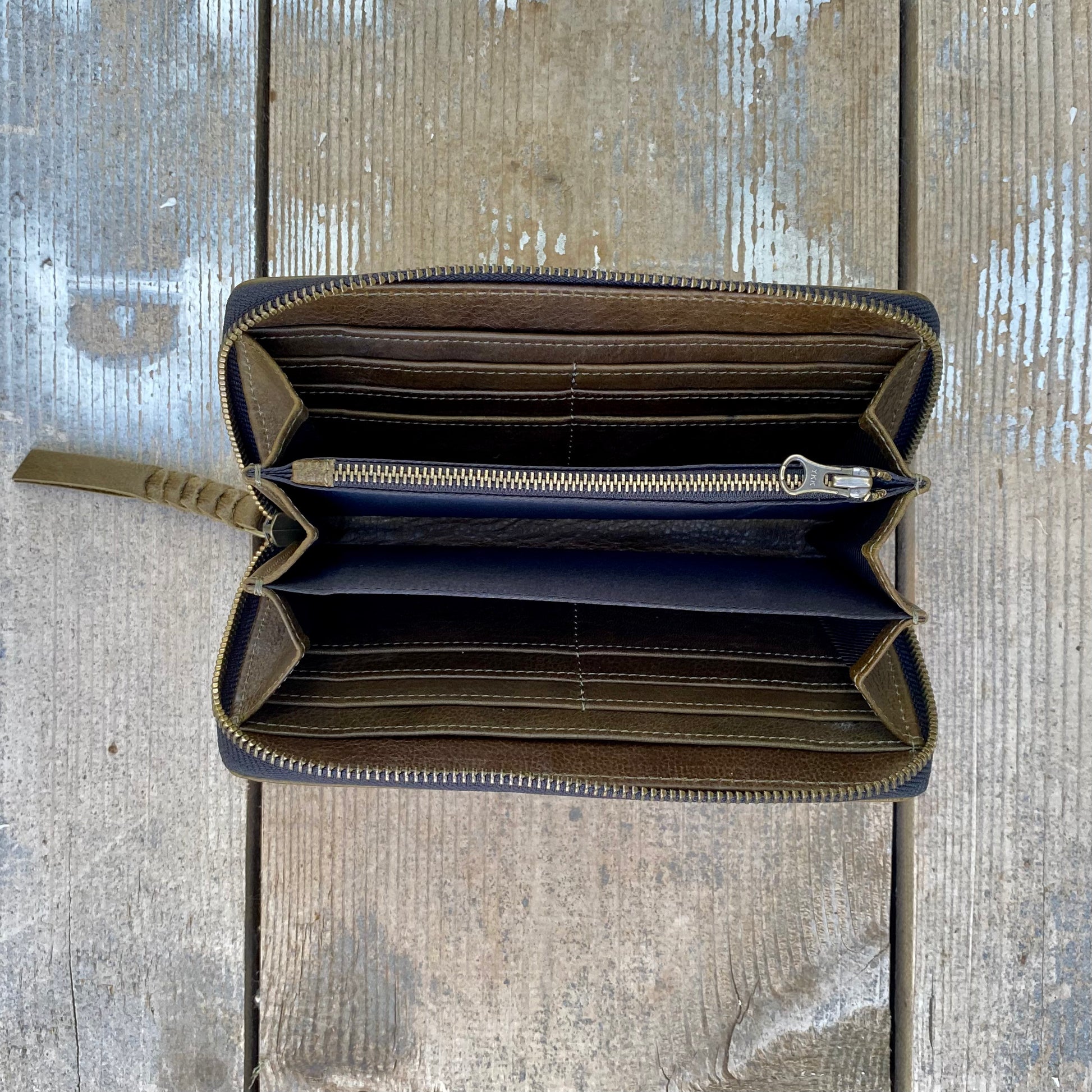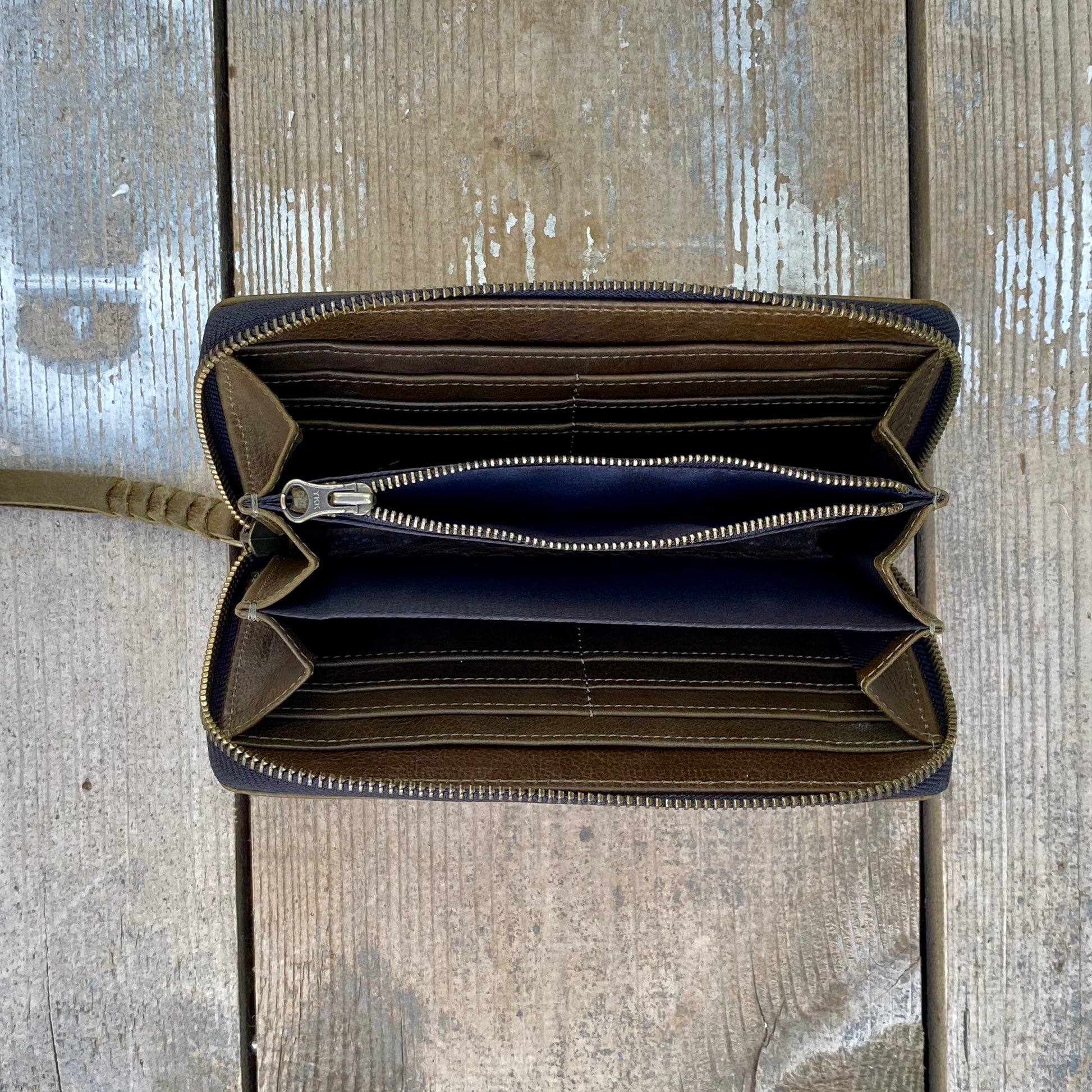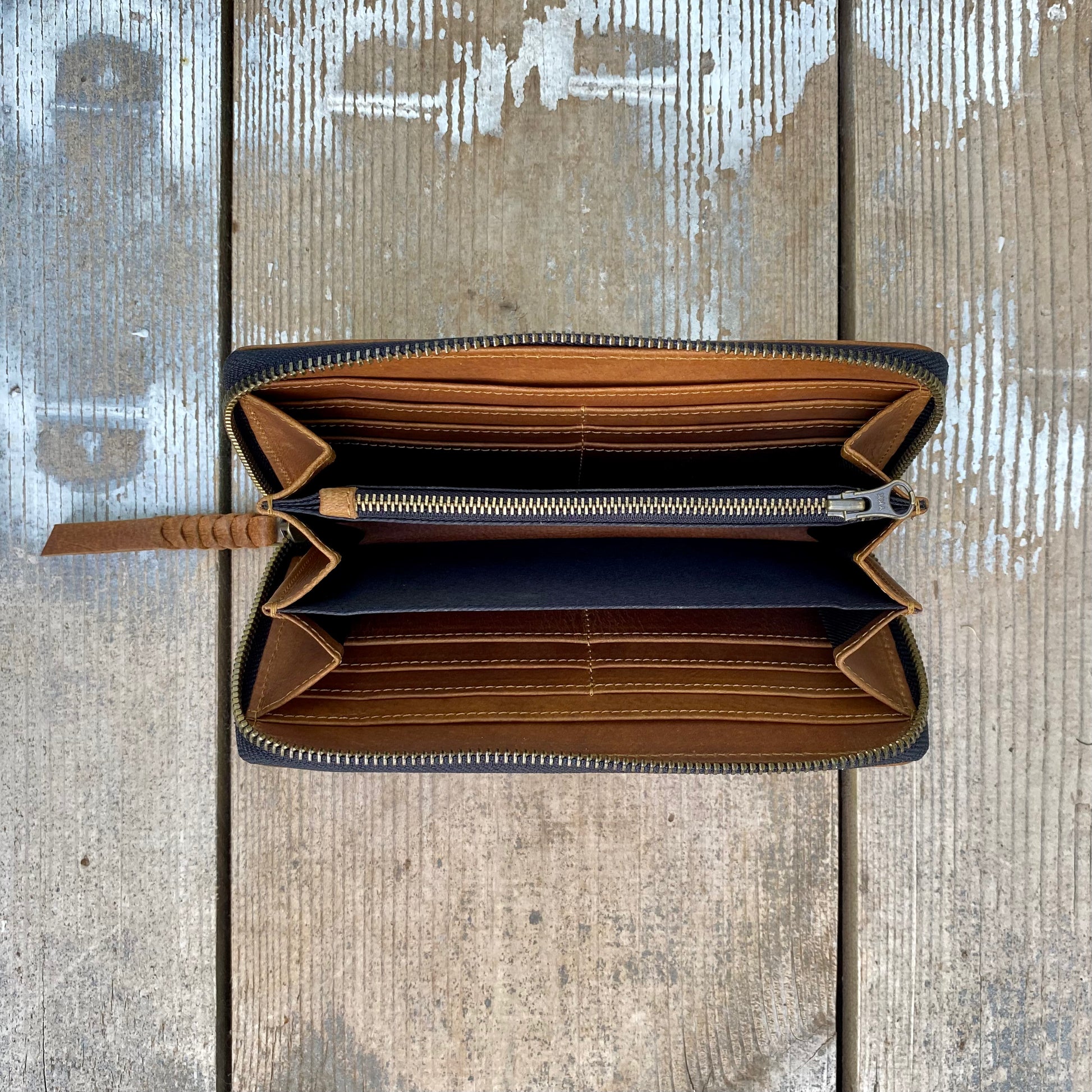 37cm antique brass metal zipper opening right around 3 sides of the purse with plaited leather pull