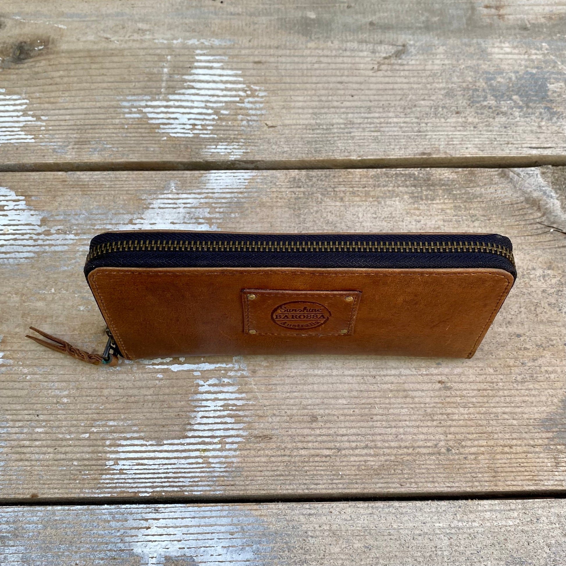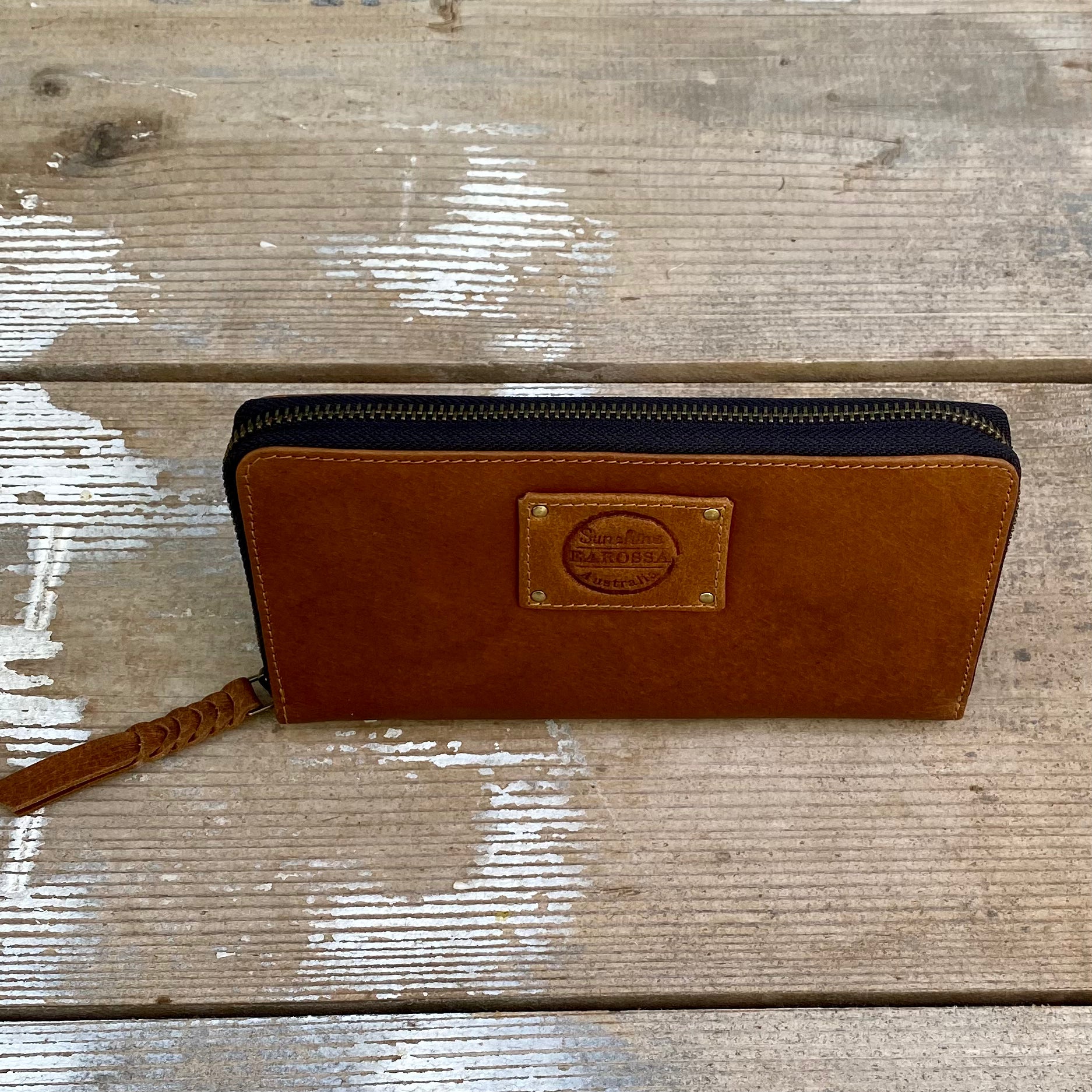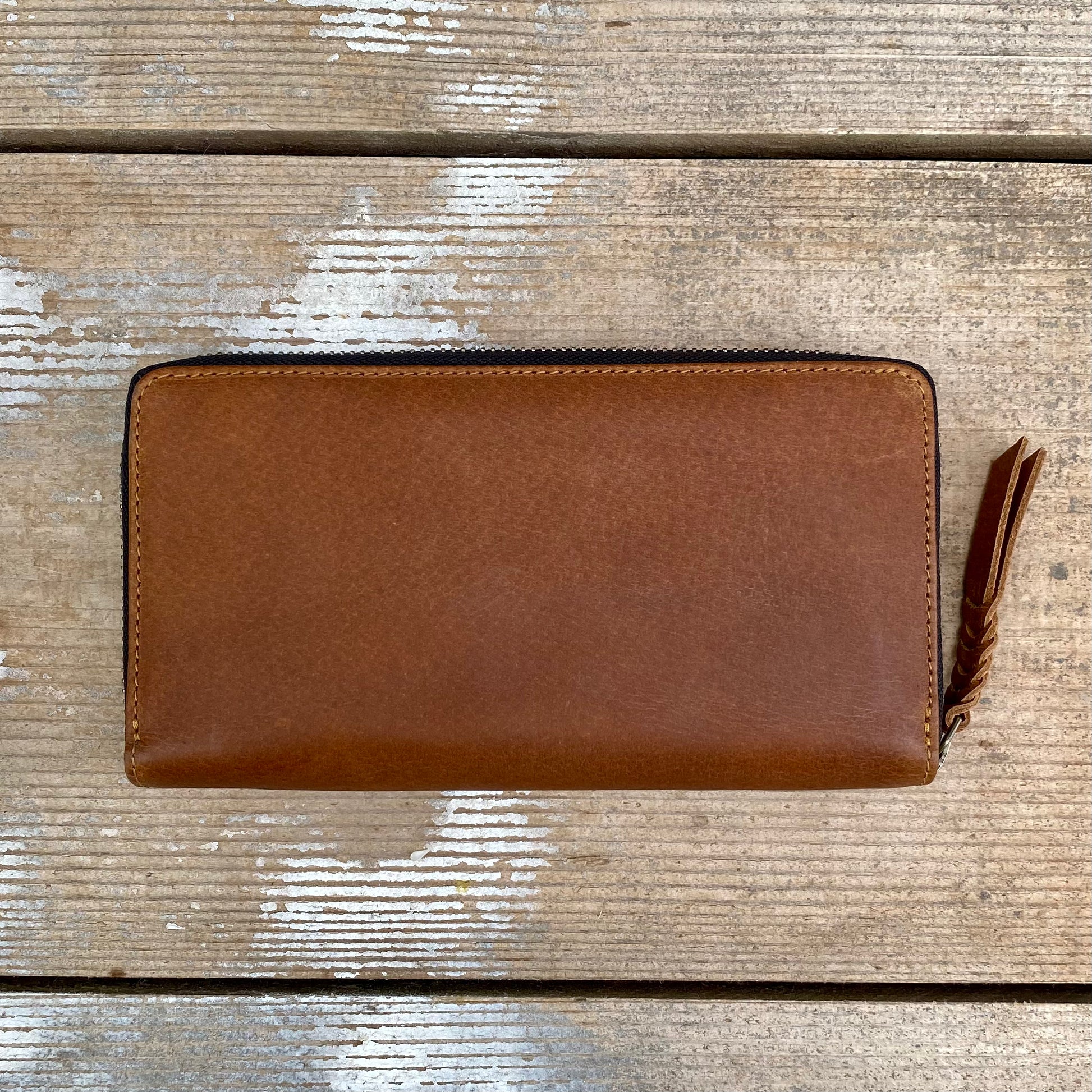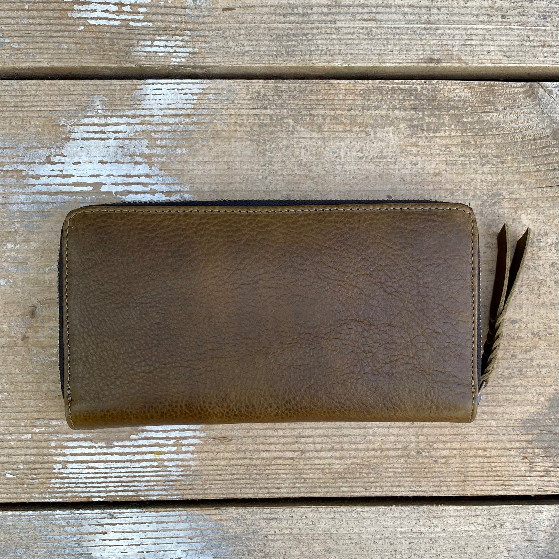 37cm antique brass metal zipper opening right around 3 sides of the purse with plaited leather pull