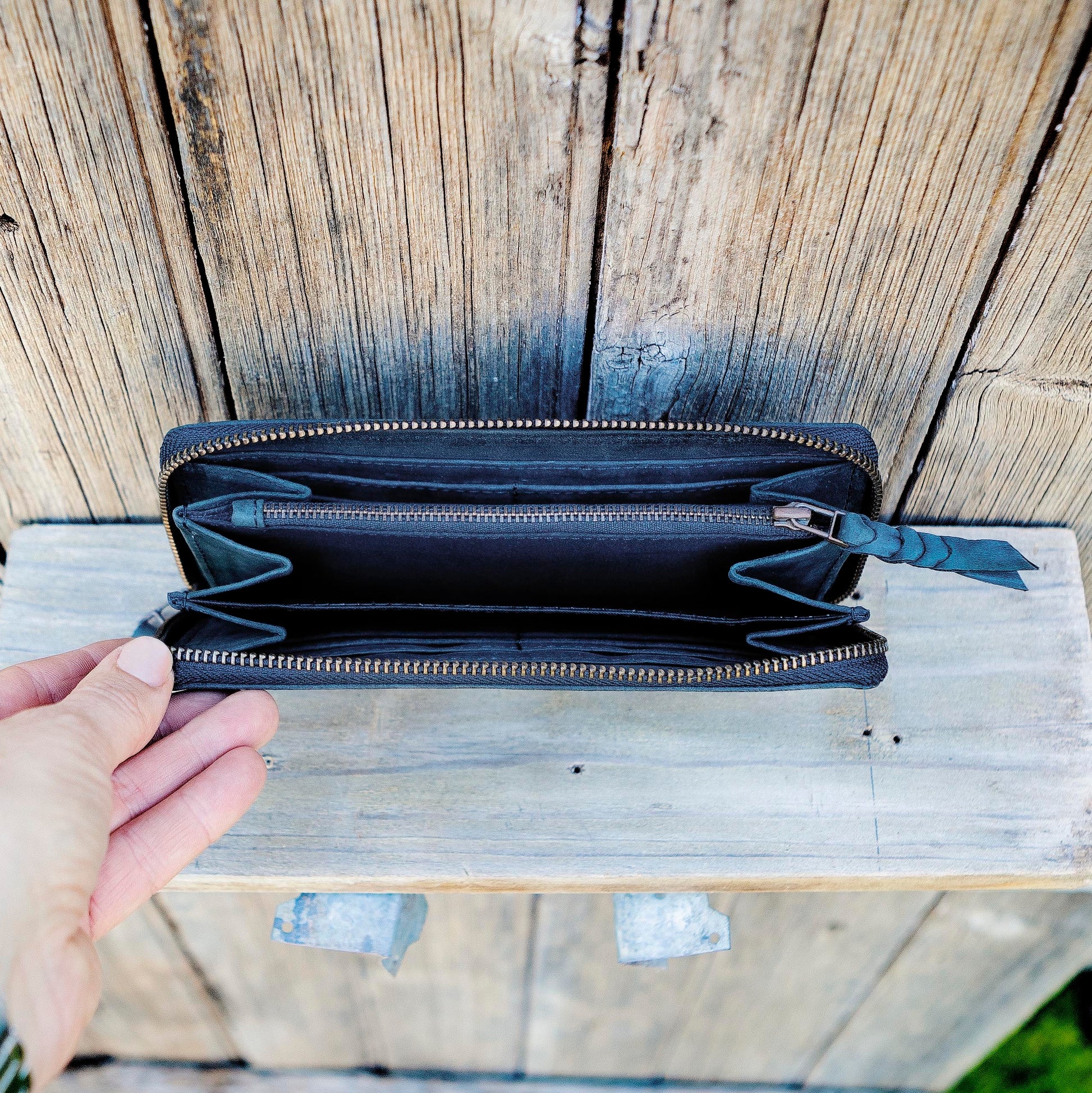 Pick it up and you’ll immediately notice how rustic and sturdy the leather is in your hand. It will be around for a while if looked after. Unzip the wraparound zip with the practical leather pull and this purse opens to reveal a place for all your cash and cards. There is a zippered area for coins, two full-width open sections for notes and receipts and 12 card slots. The colour choices are simple and will go with any wardrobe.