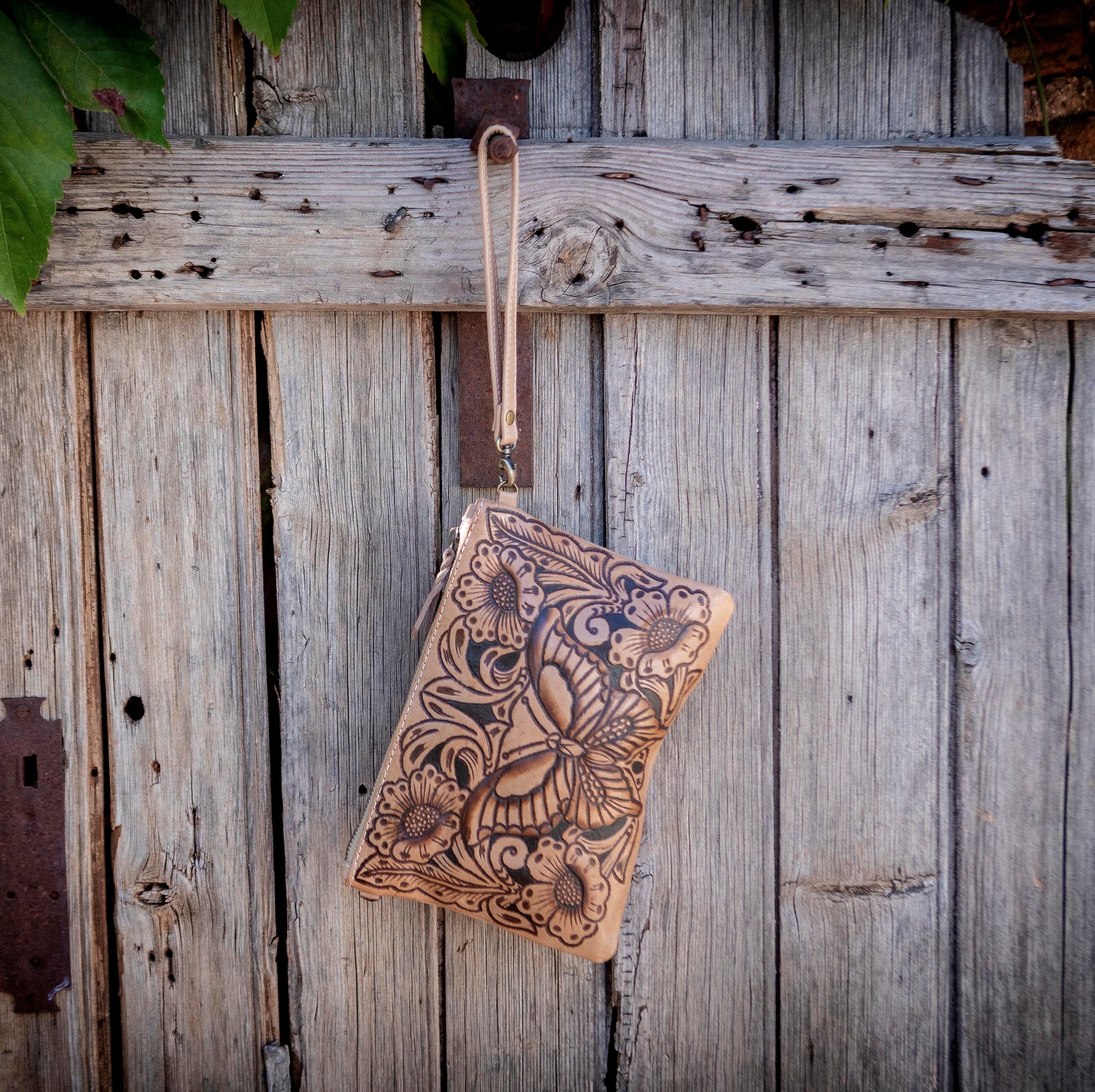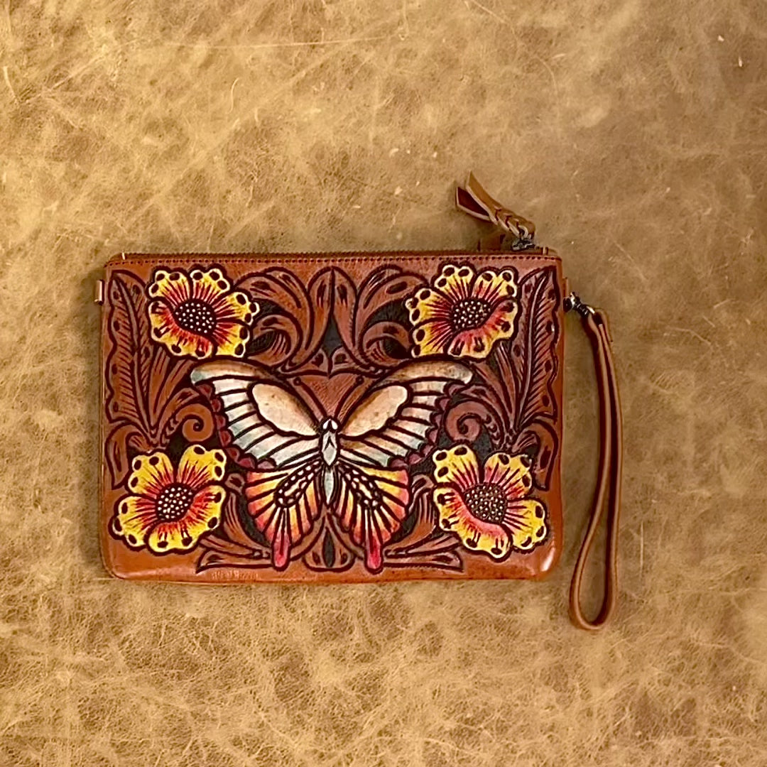 Carved Leather Butterfly Boho Clutch