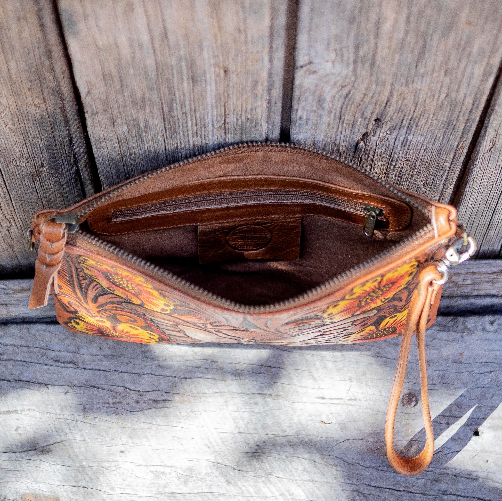 Sunshine Barossa's range of stunning leather handcrafted clutches has become a fast trending item loved by many. The decorative carved butterfly and flower detailing featured on the front of this clutch is exquisite with the subtle hand-dyed colour palette added, catching your eye from every angle.