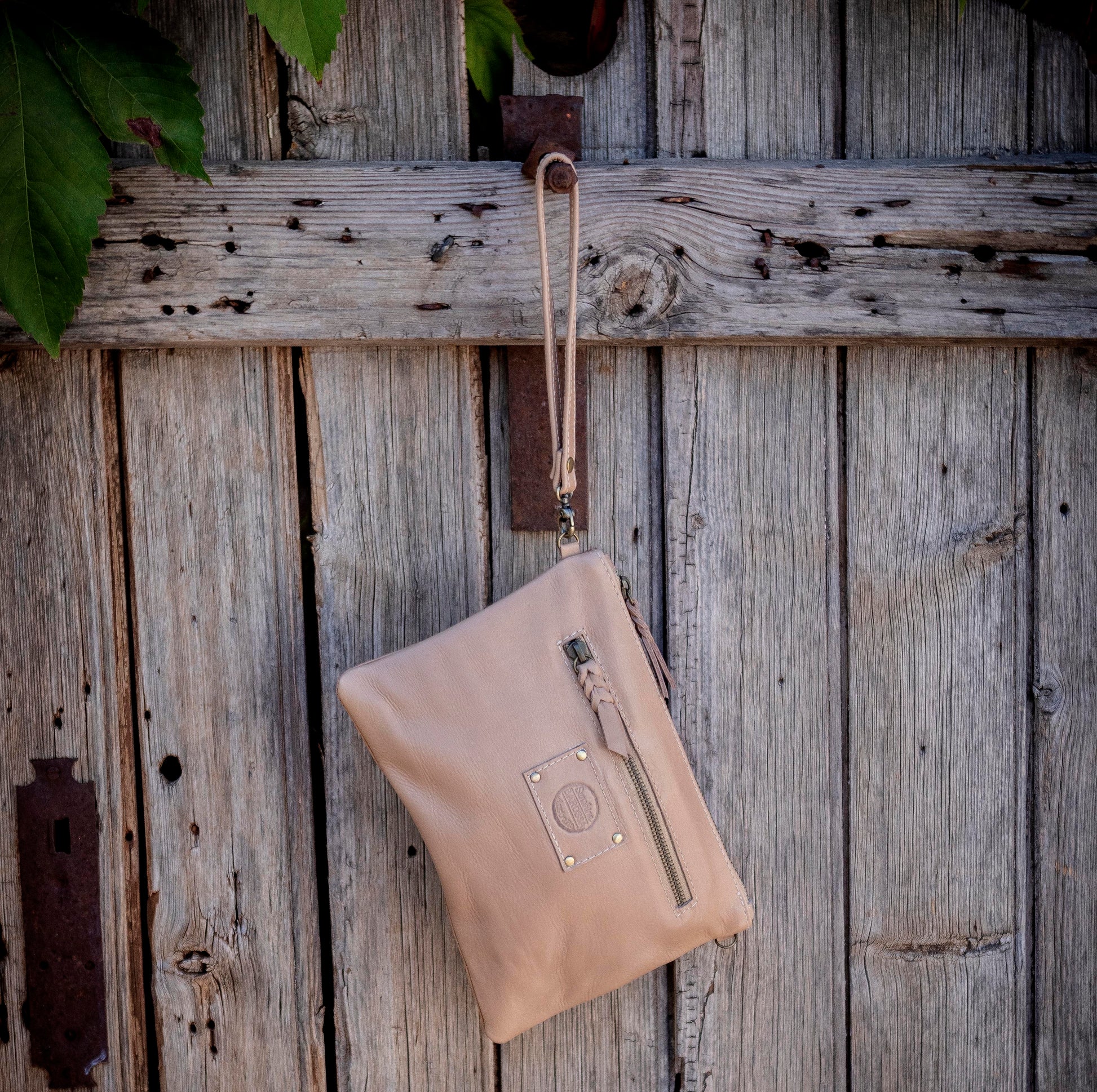17cm wide external pocket with antique brass metal zipper and leather plaited pull