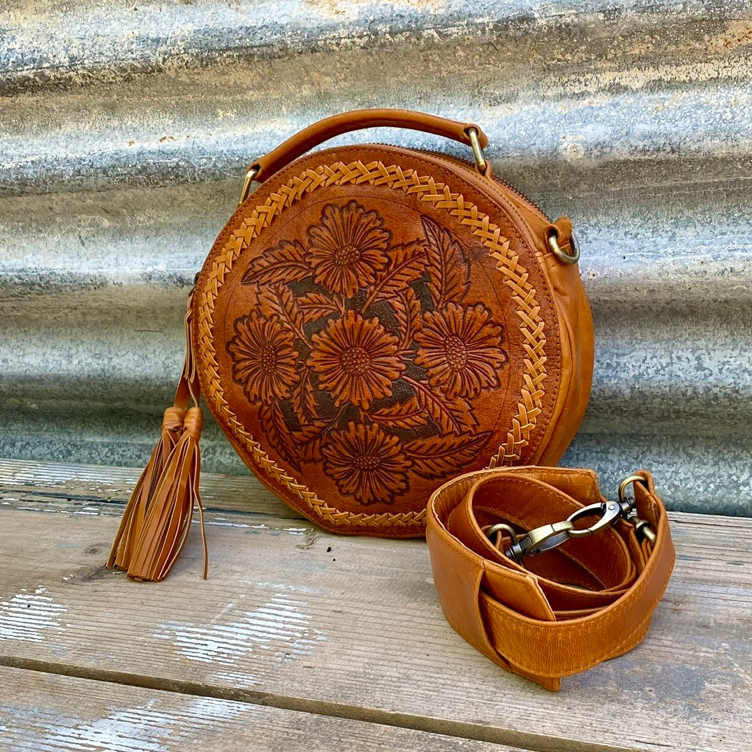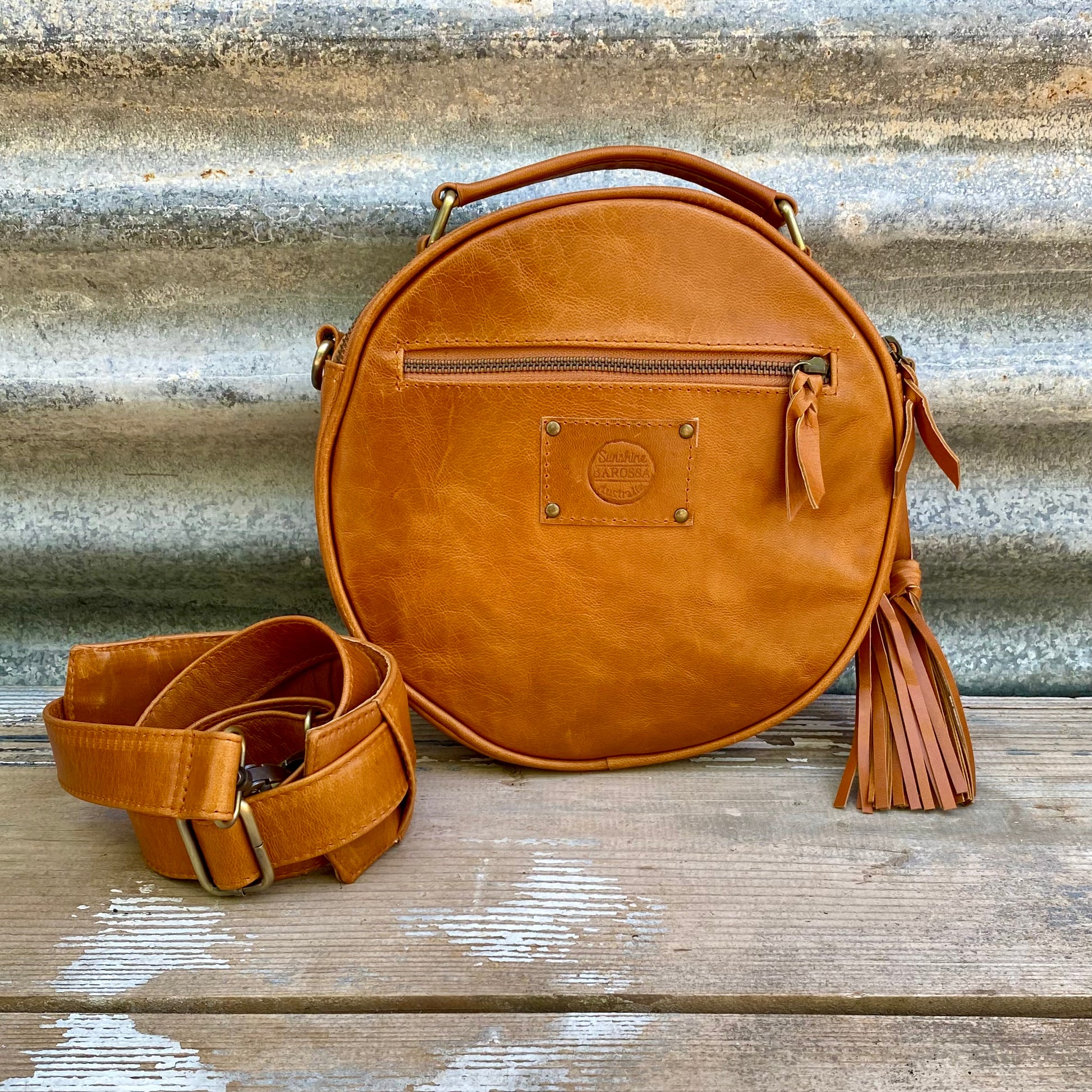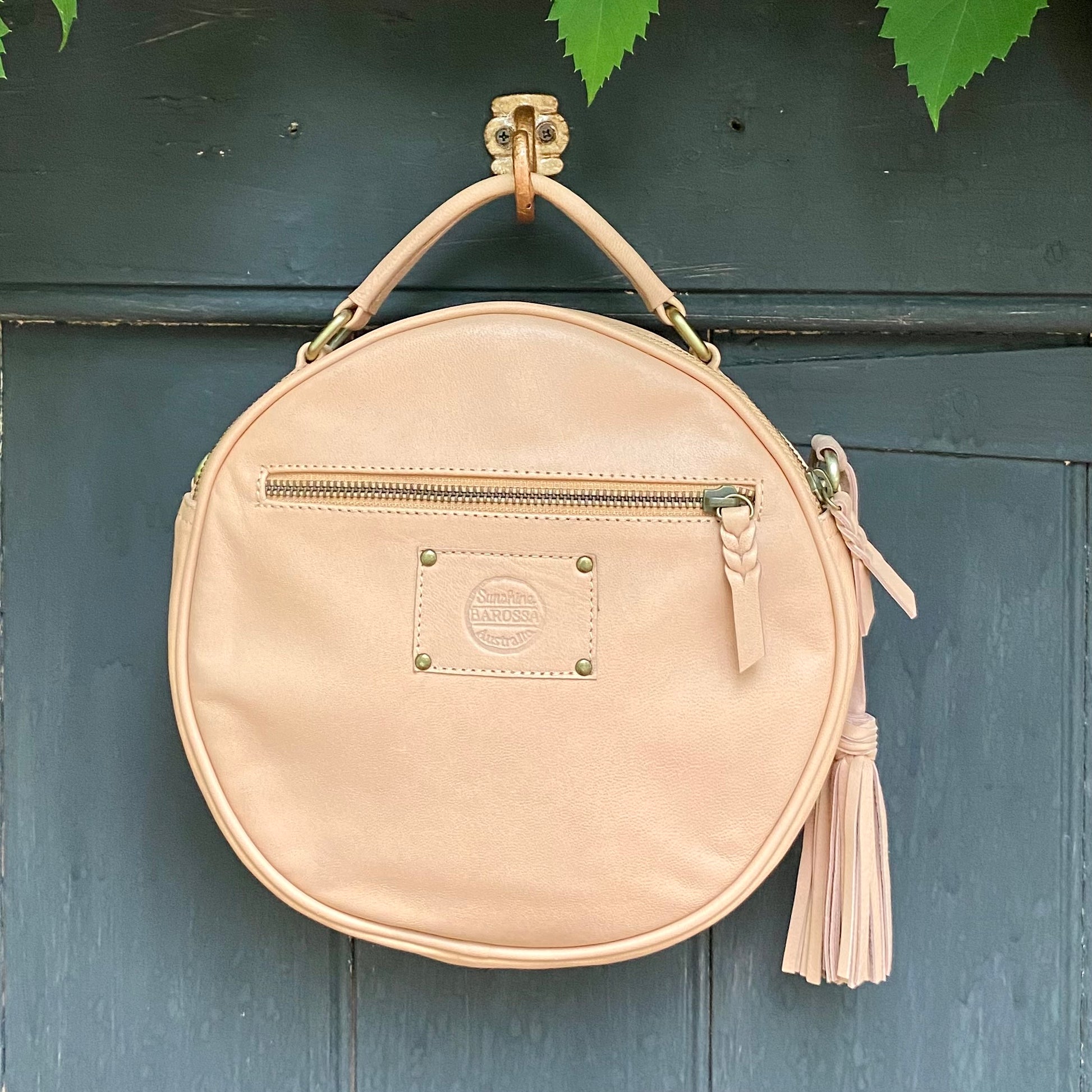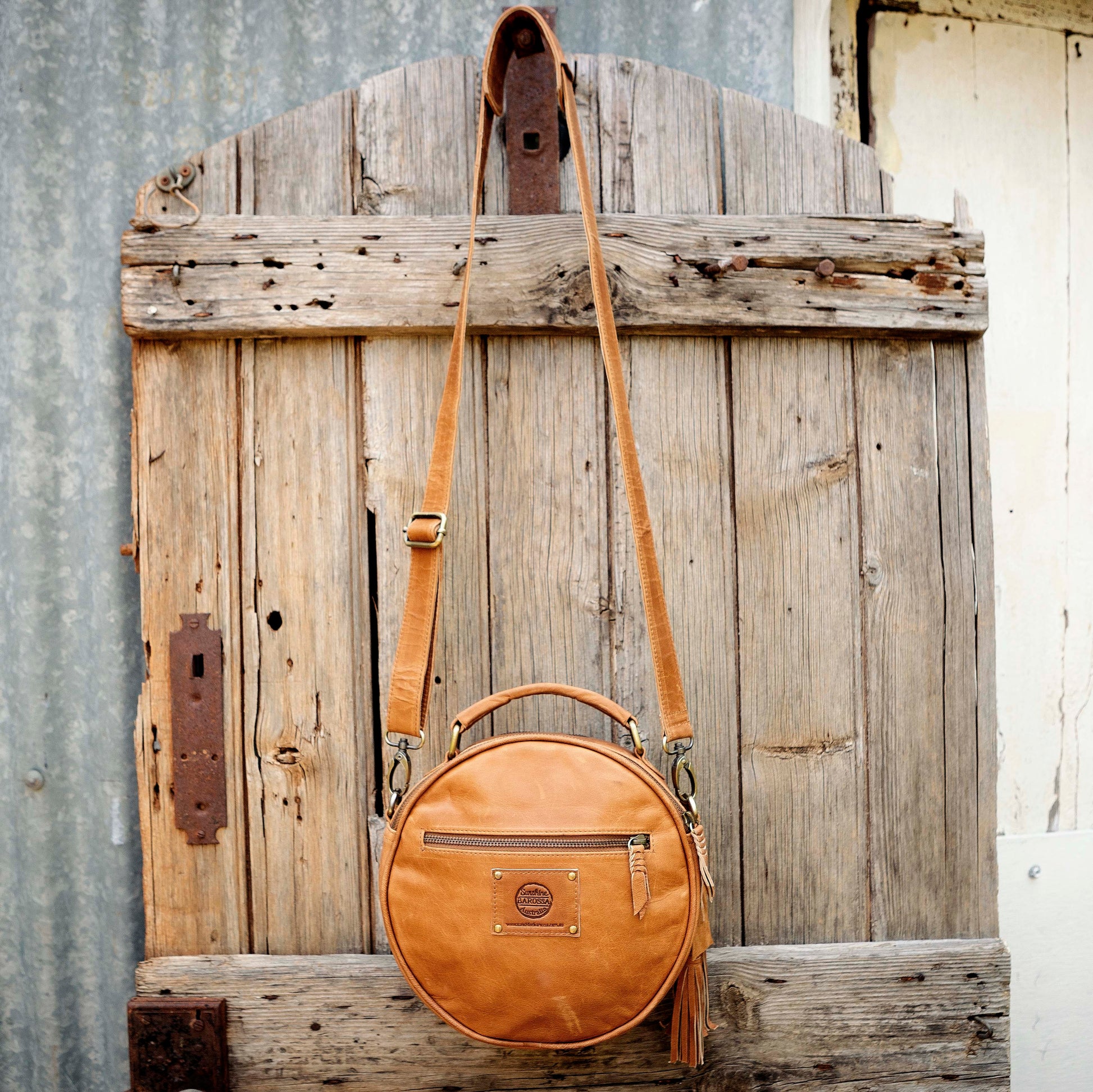 Welcome to the head-turner of the Sunshine Barossa Range. The Carved Leather Round bag is a stunning, elegant yet classic design. It is perfectly used with the little hand strap for evening time or with the adjustable long strap with shoulder protector for the lunch date and a spot of shopping. The inside is very deceivingly roomy with 2 x separate zippered compartments. One with an internal zipper and the other side with an open pocket. It can fit the Soft Wallet with no trouble.