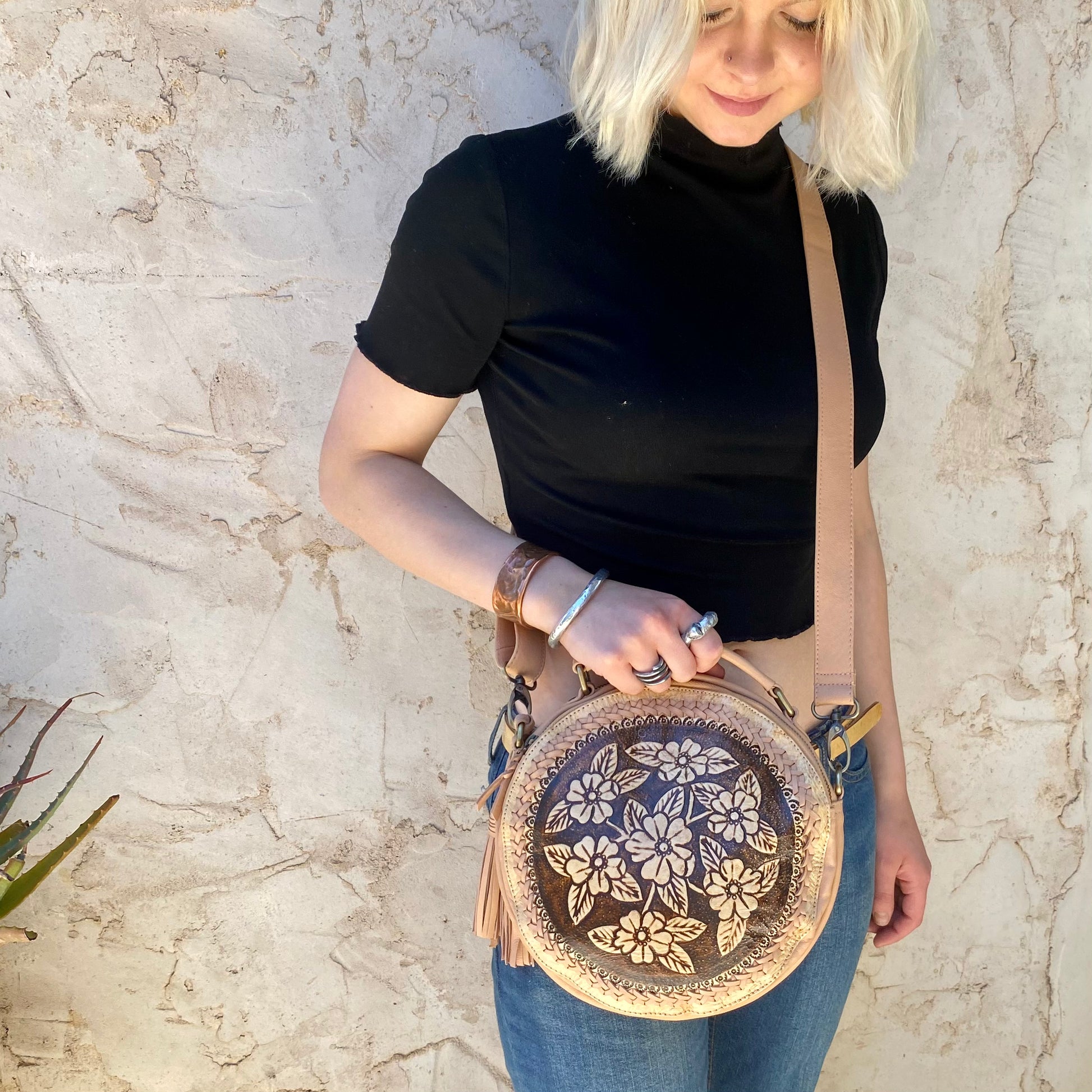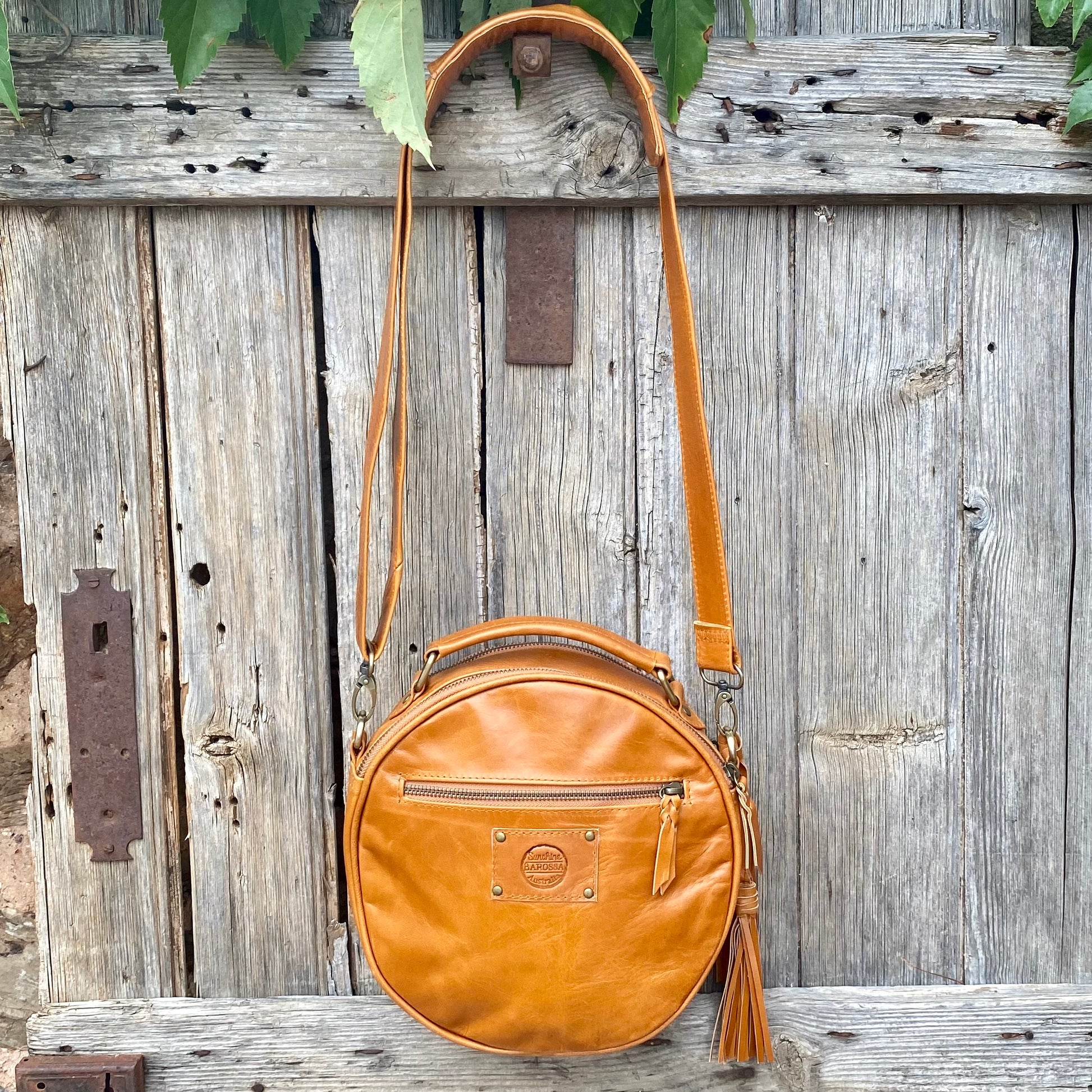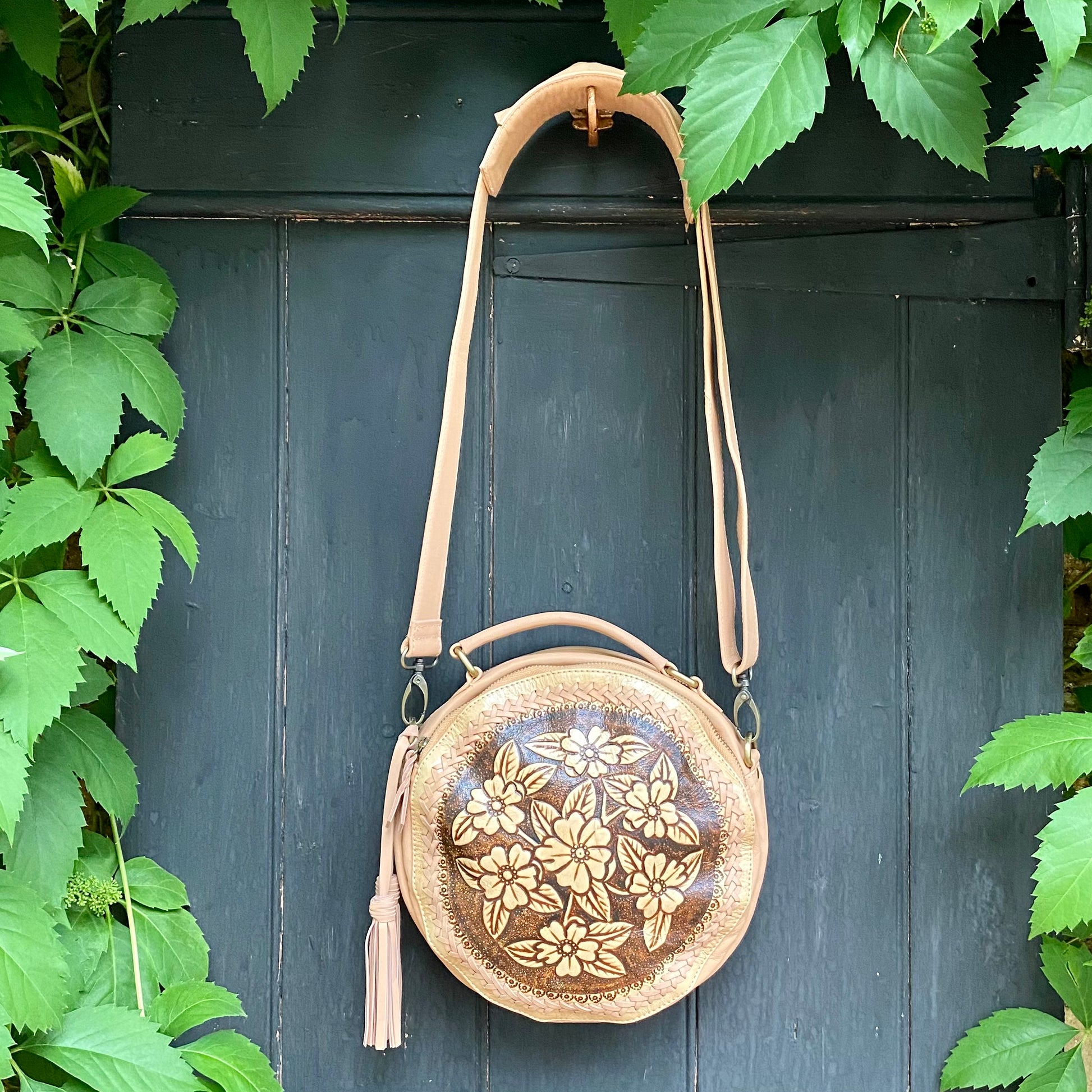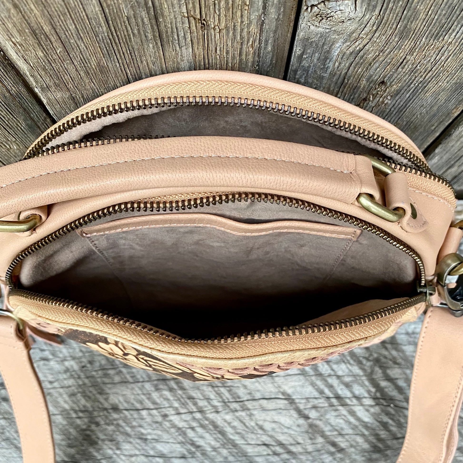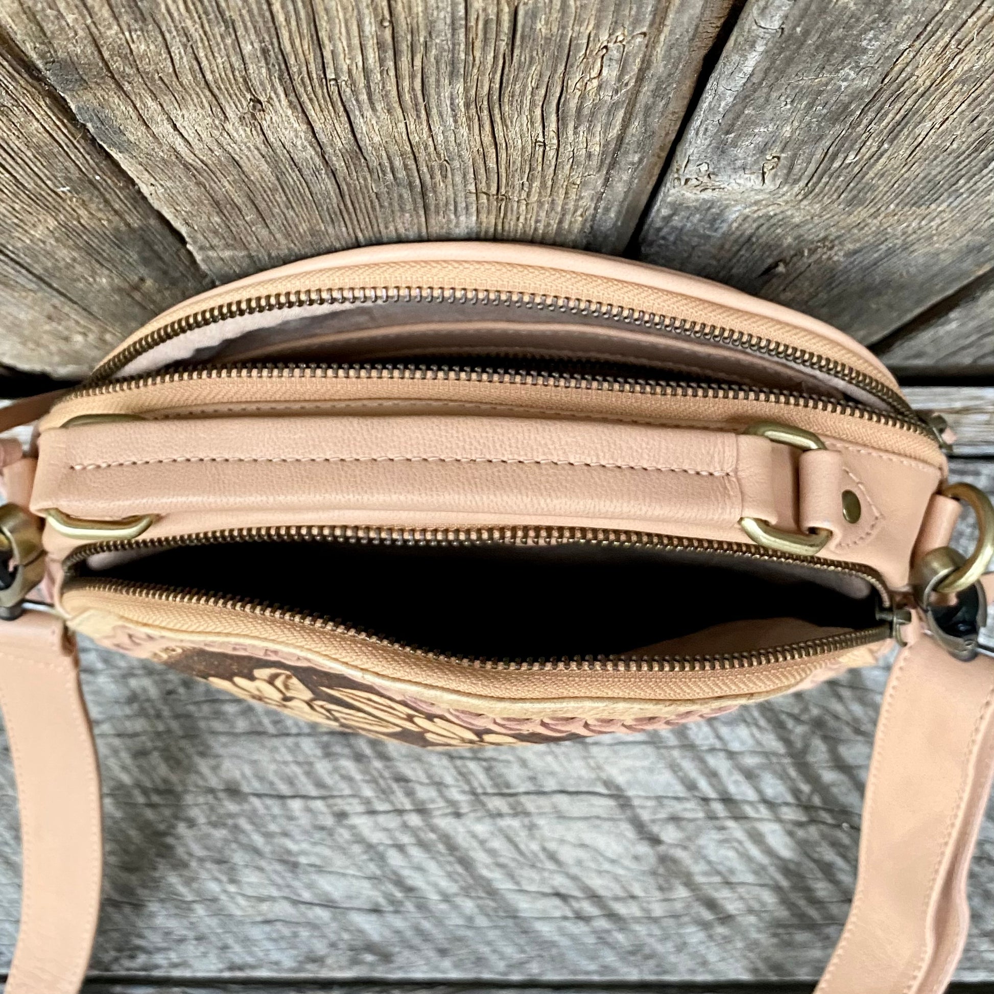 Welcome to the head-turner of the Sunshine Barossa Range. The Carved Leather Round bag is a stunning, elegant yet classic design. It is perfectly used with the little hand strap for evening time or with the adjustable long strap with shoulder protector for the lunch date and a spot of shopping. The inside is very deceivingly roomy with 2 x separate zippered compartments. One with an internal zipper and the other side with an open pocket. It can fit the Soft Wallet with no trouble.