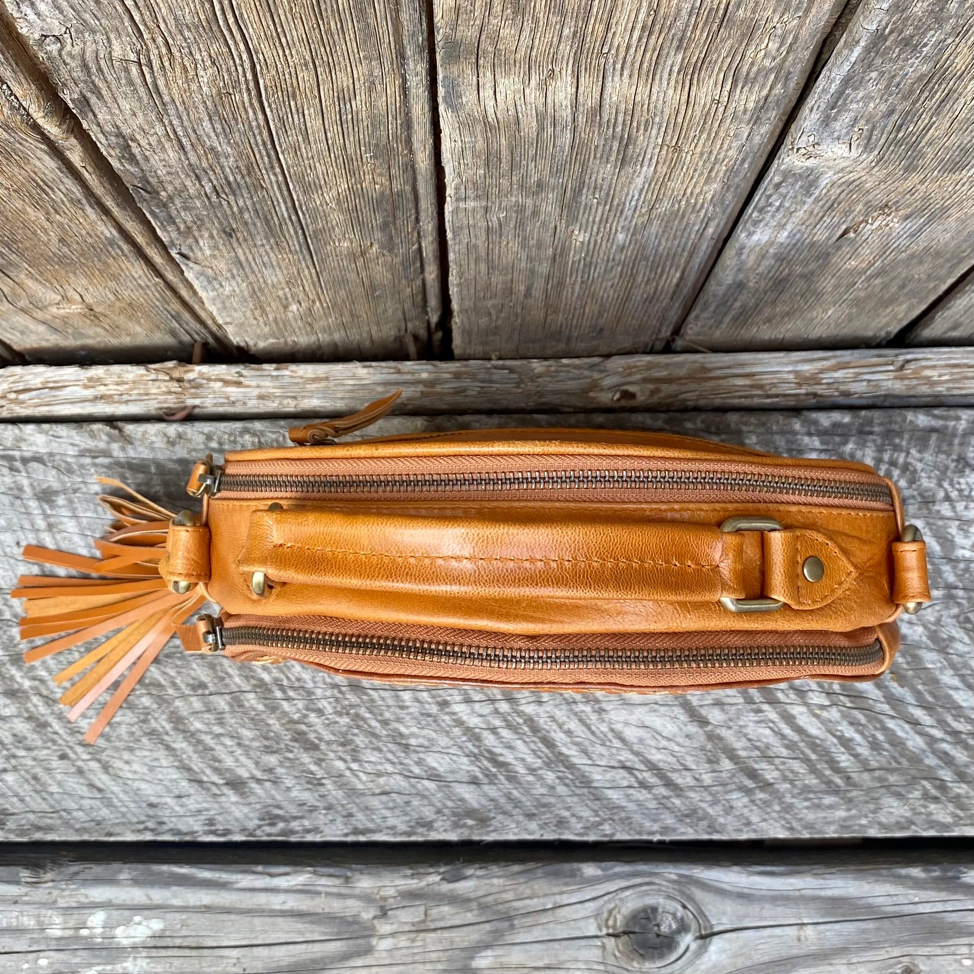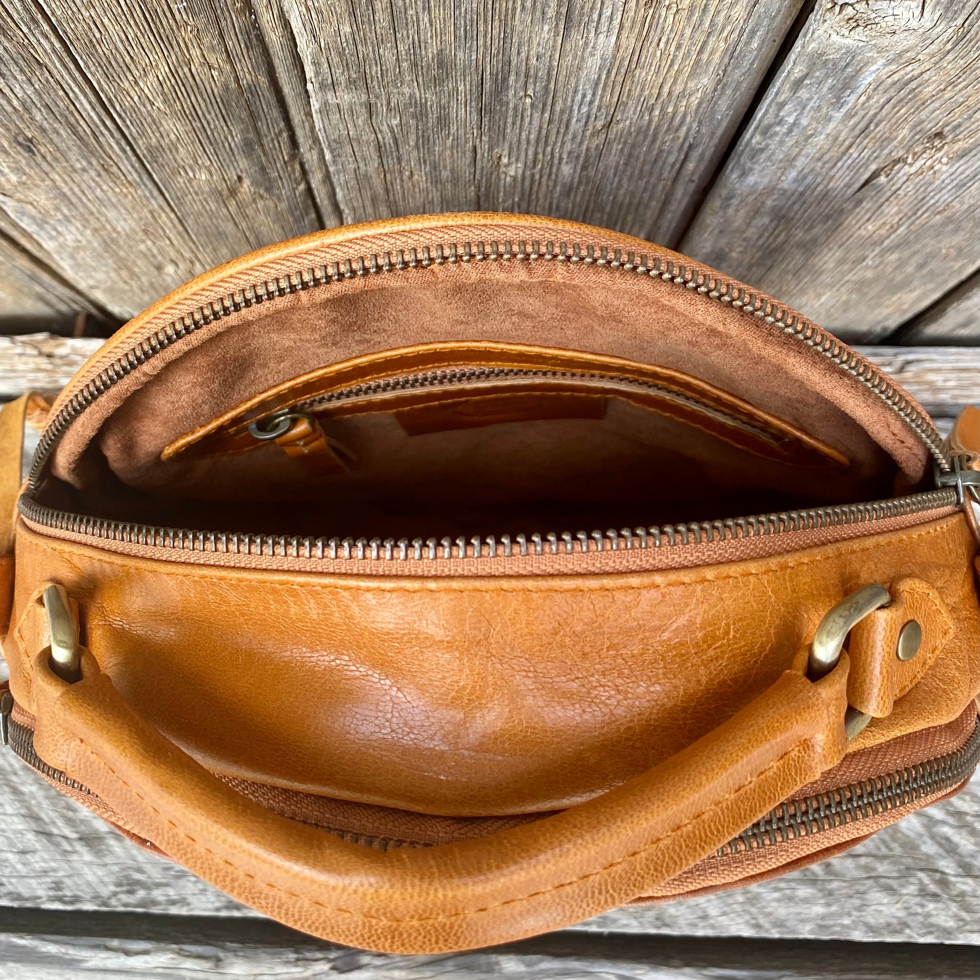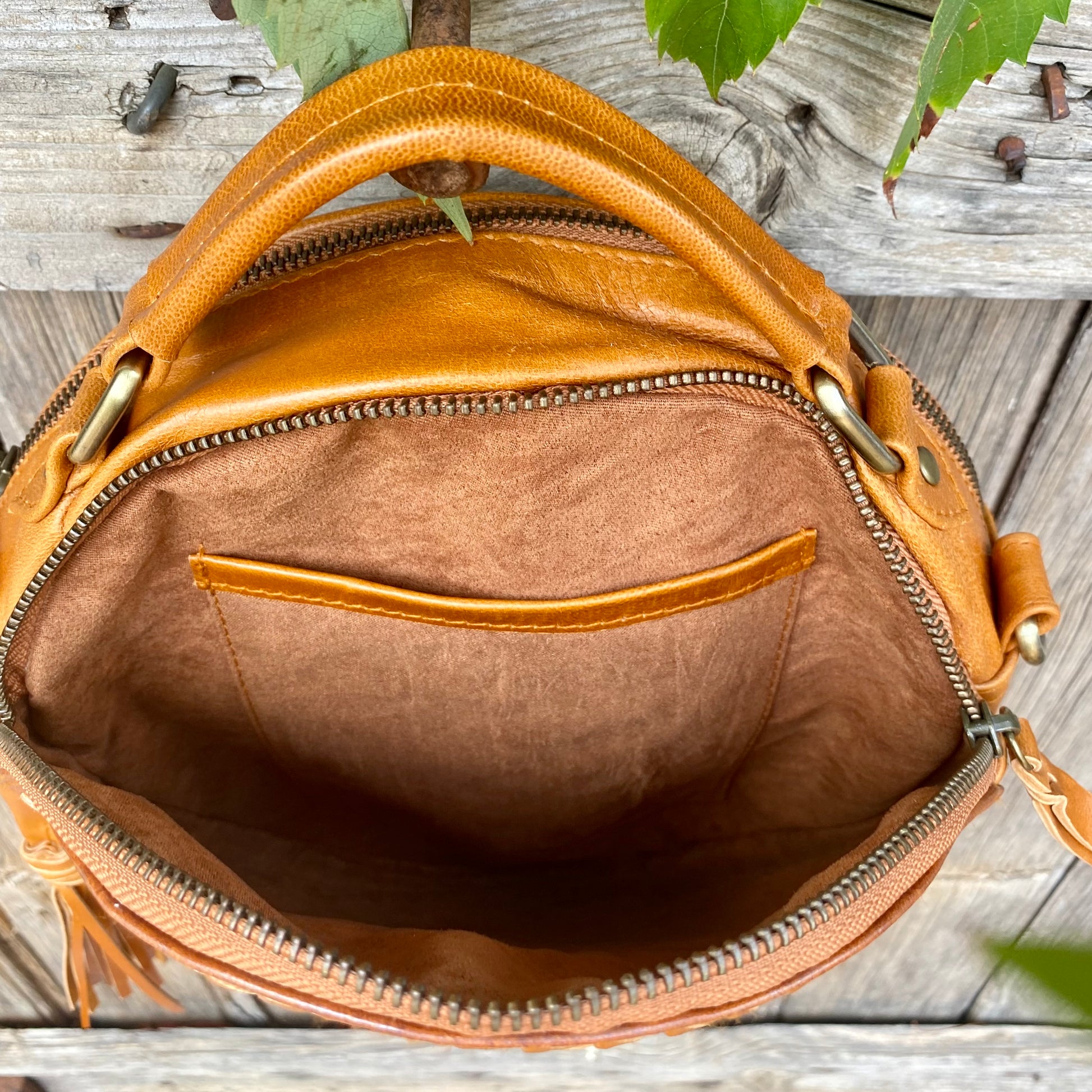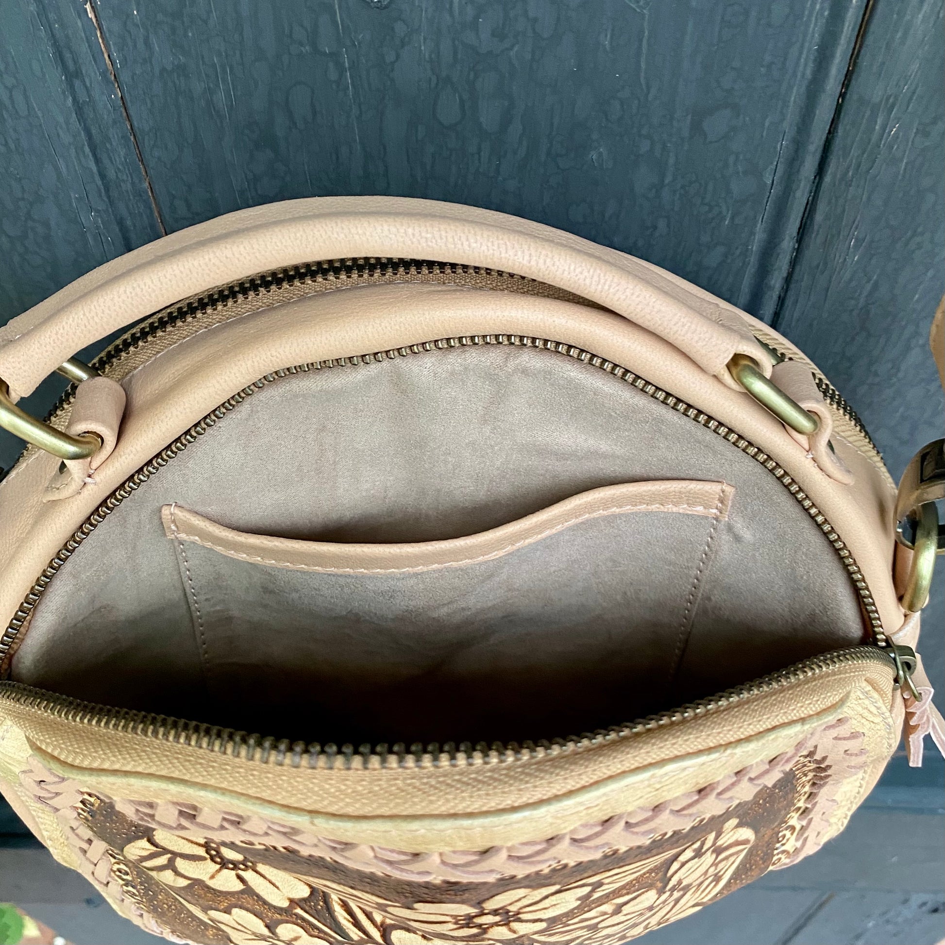 Welcome to the head-turner of the Sunshine Barossa Range. The Carved Leather Round bag is a stunning, elegant yet classic design. It is perfectly used with the little hand strap for evening time or with the adjustable long strap with shoulder protector for the lunch date and a spot of shopping. The inside is very deceivingly roomy with 2 x separate zippered compartments. One with an internal zipper and the other side with an open pocket. It can fit the Soft Wallet with no trouble.
