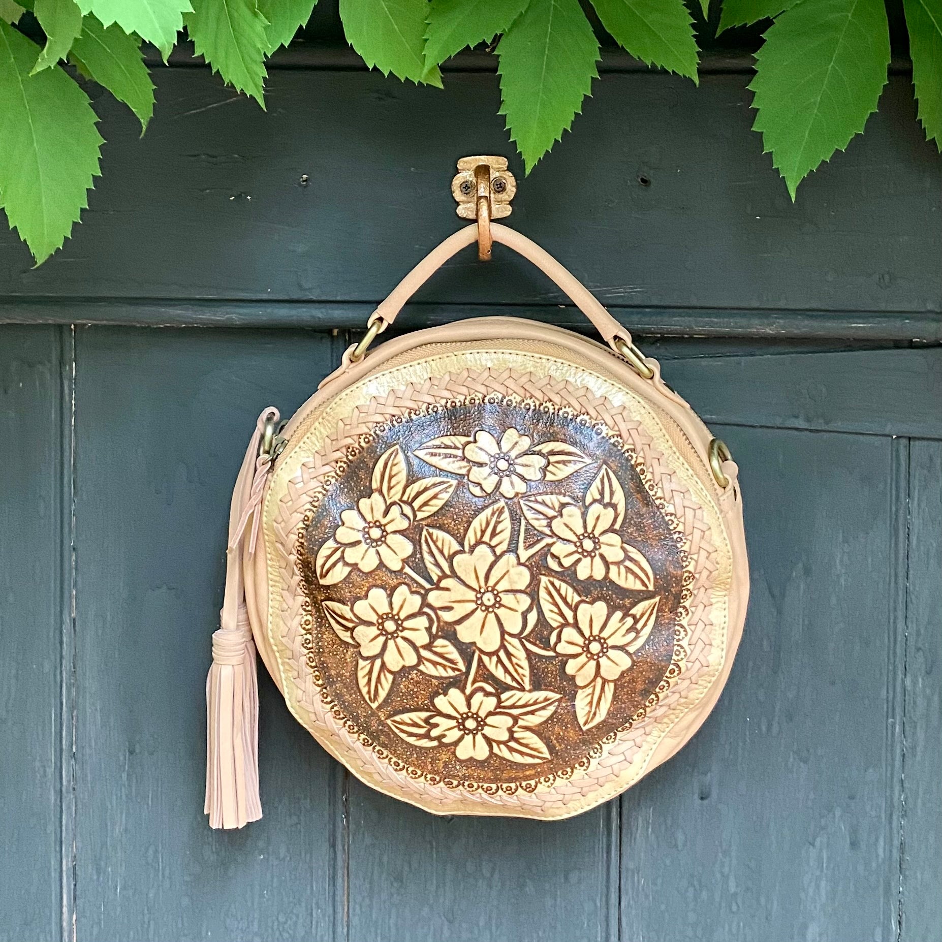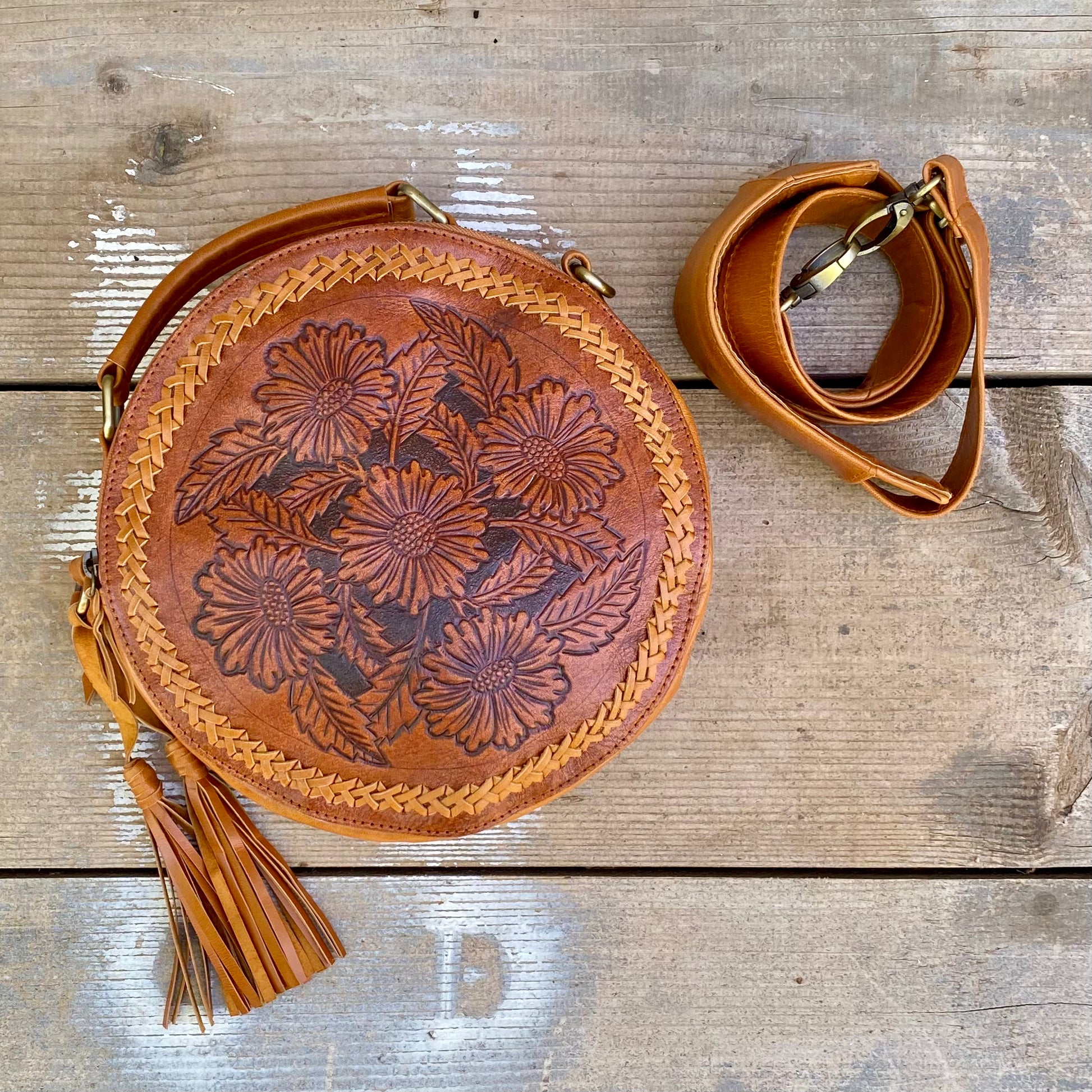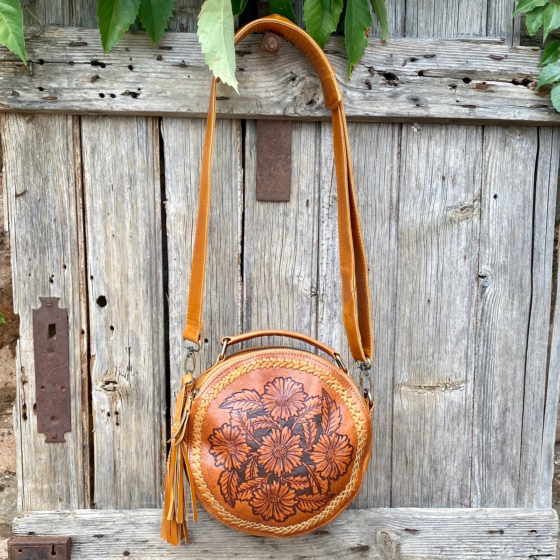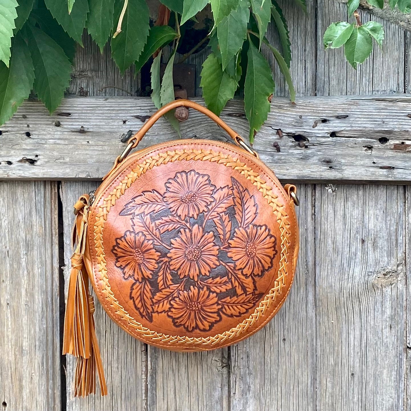1. a leather bag shaped like a circle or cylinder, disc-shaped, disc-like. Hand-carved design on the front.