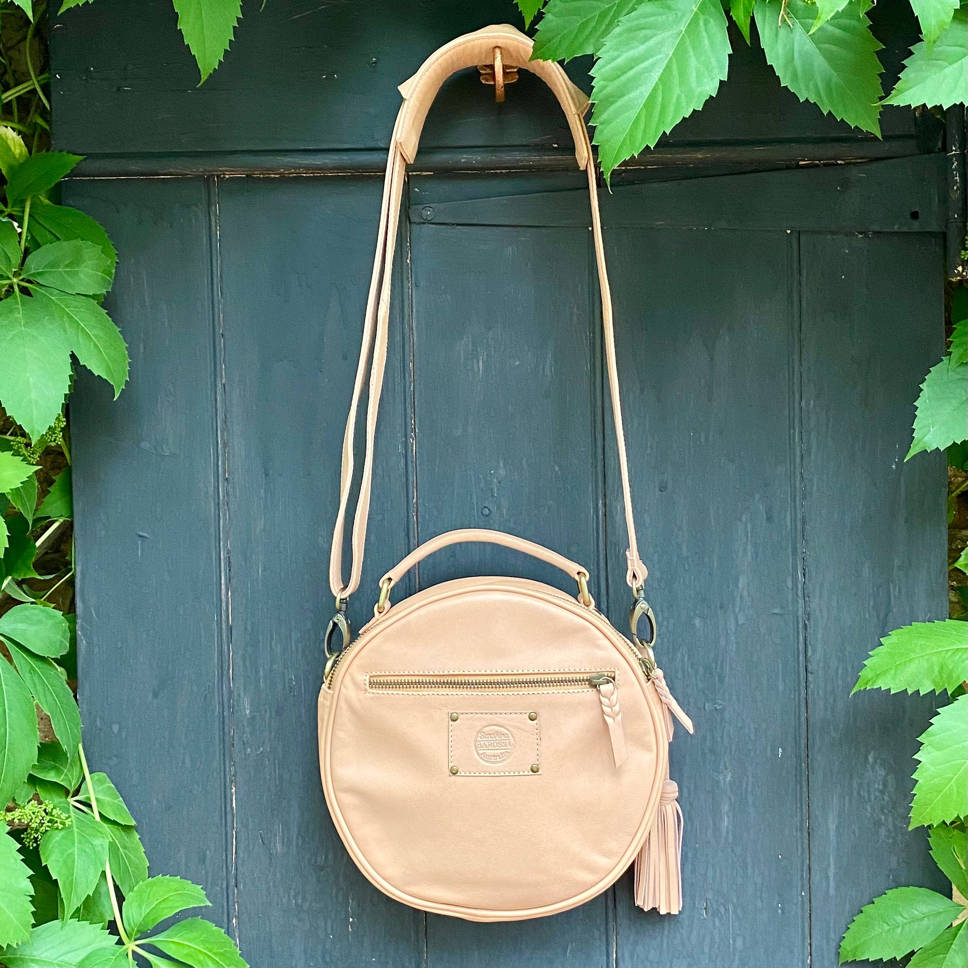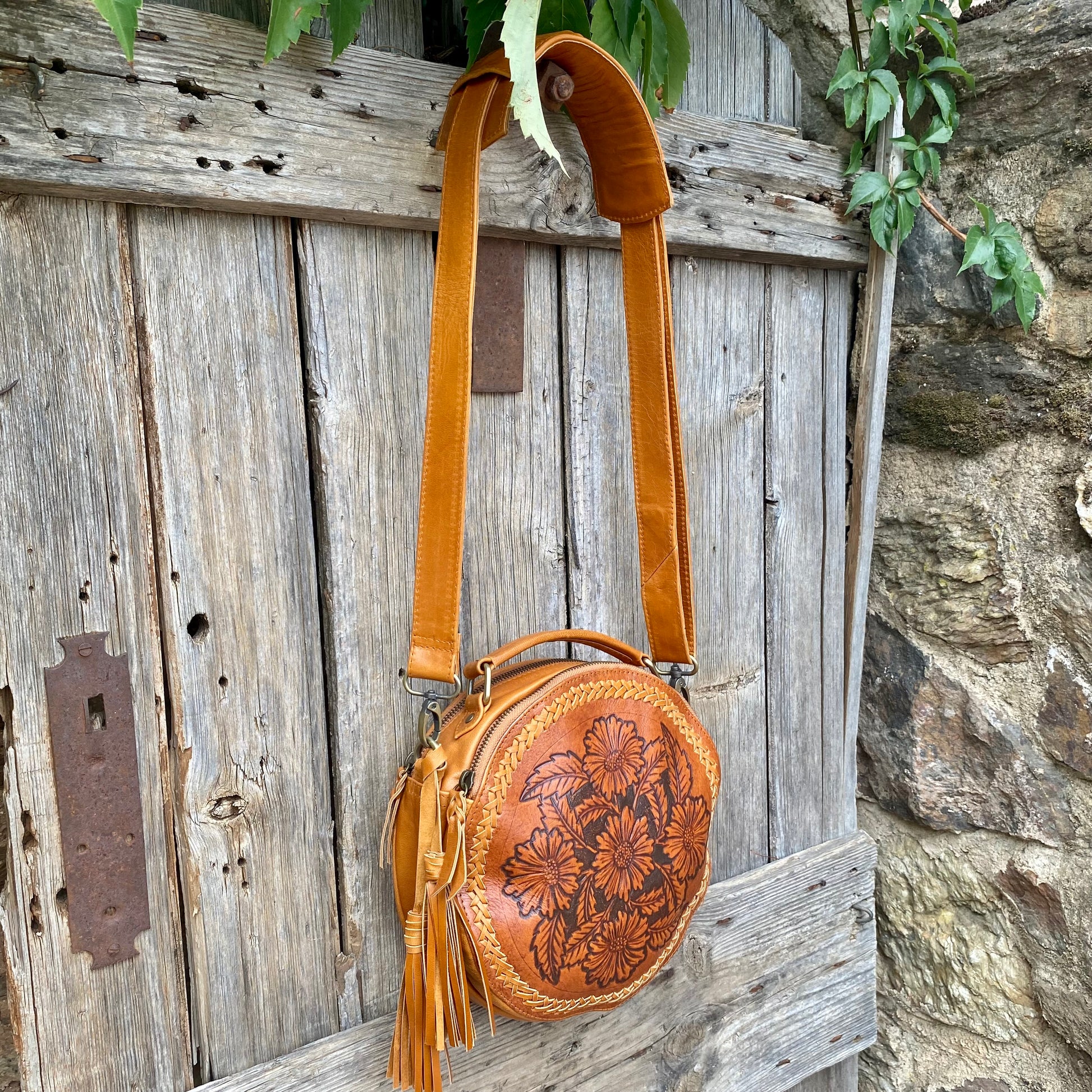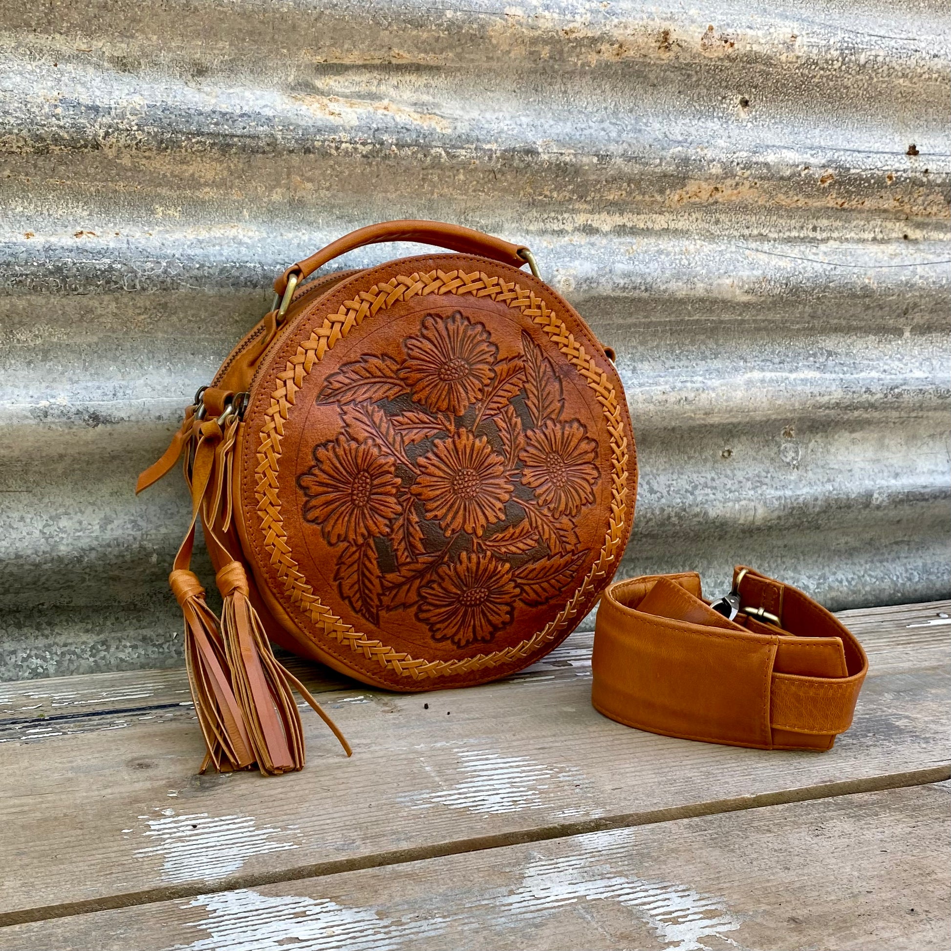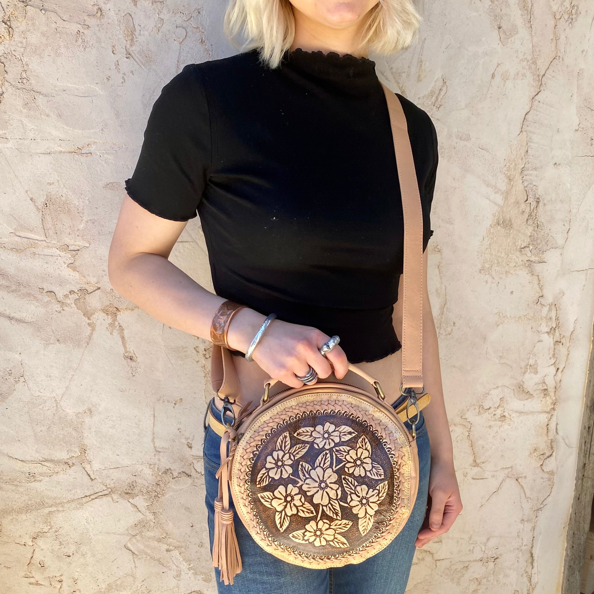 1. a leather bag shaped like a circle or cylinder, disc-shaped, disc-like. Hand-carved design on the front.