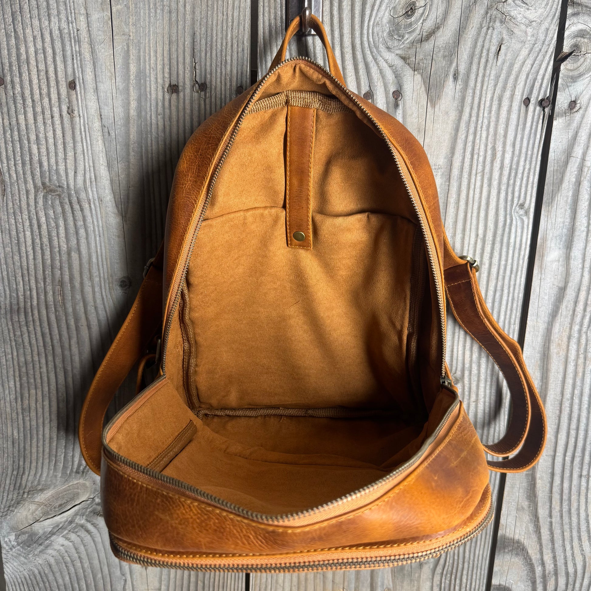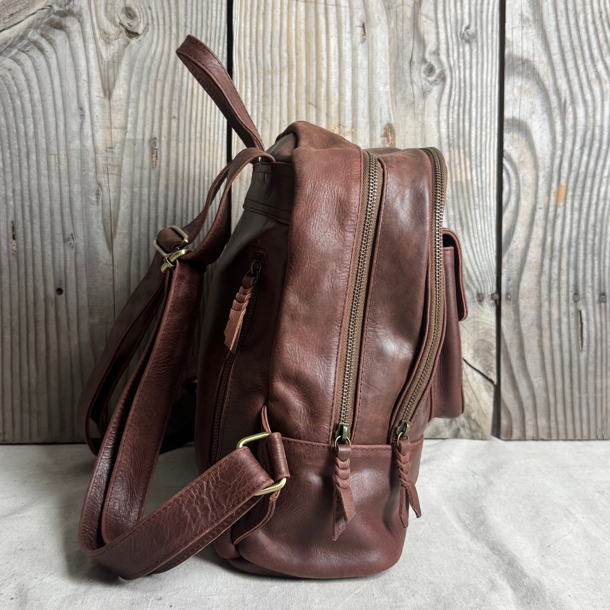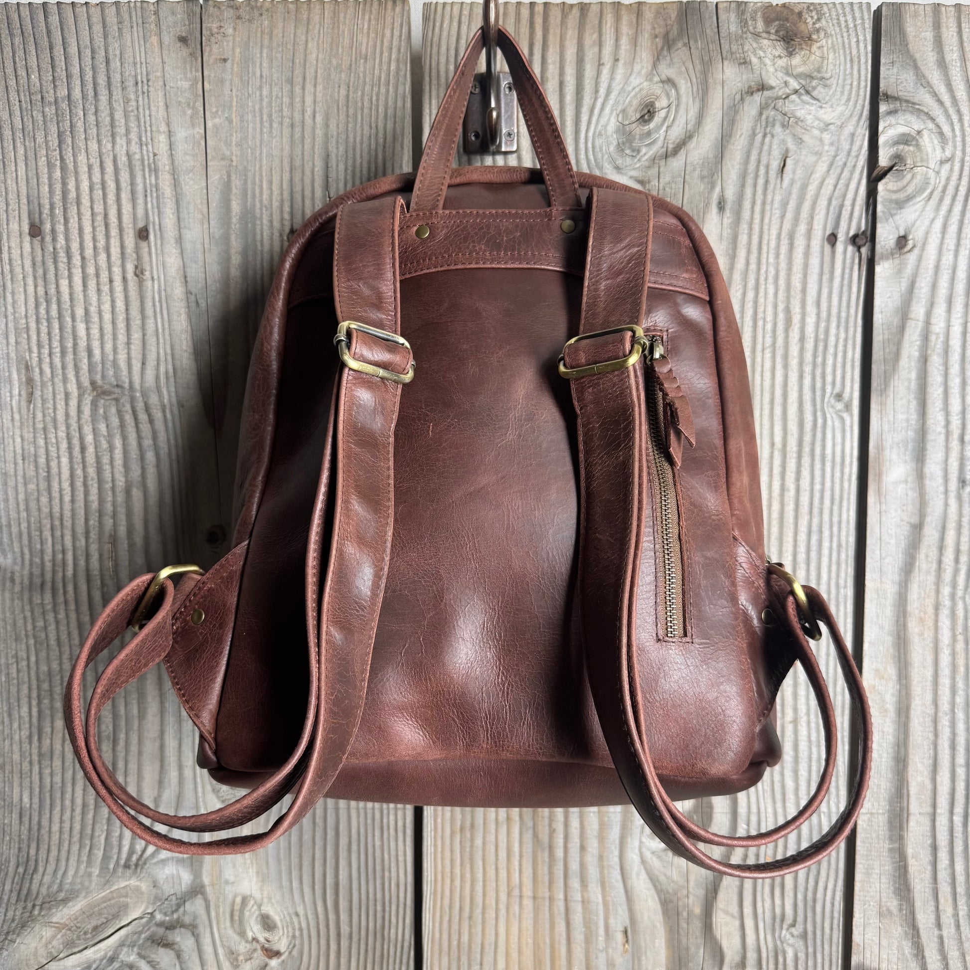 1. a classic leather bag that is designed to be worn on the back with 2 adjustable straps, used for carrying your belongings.