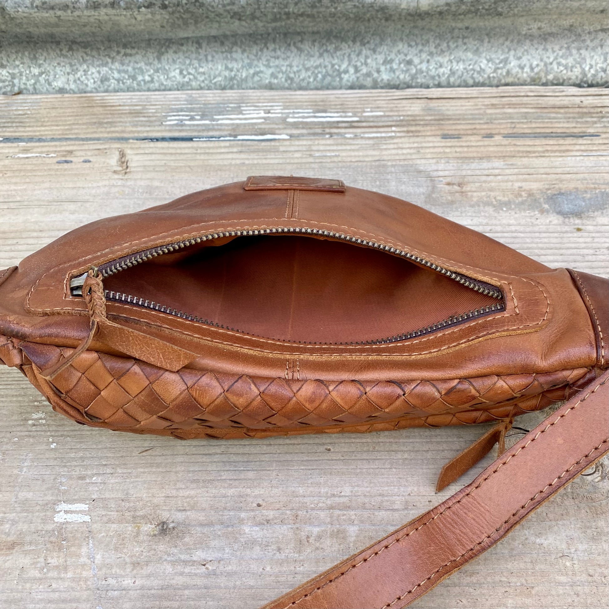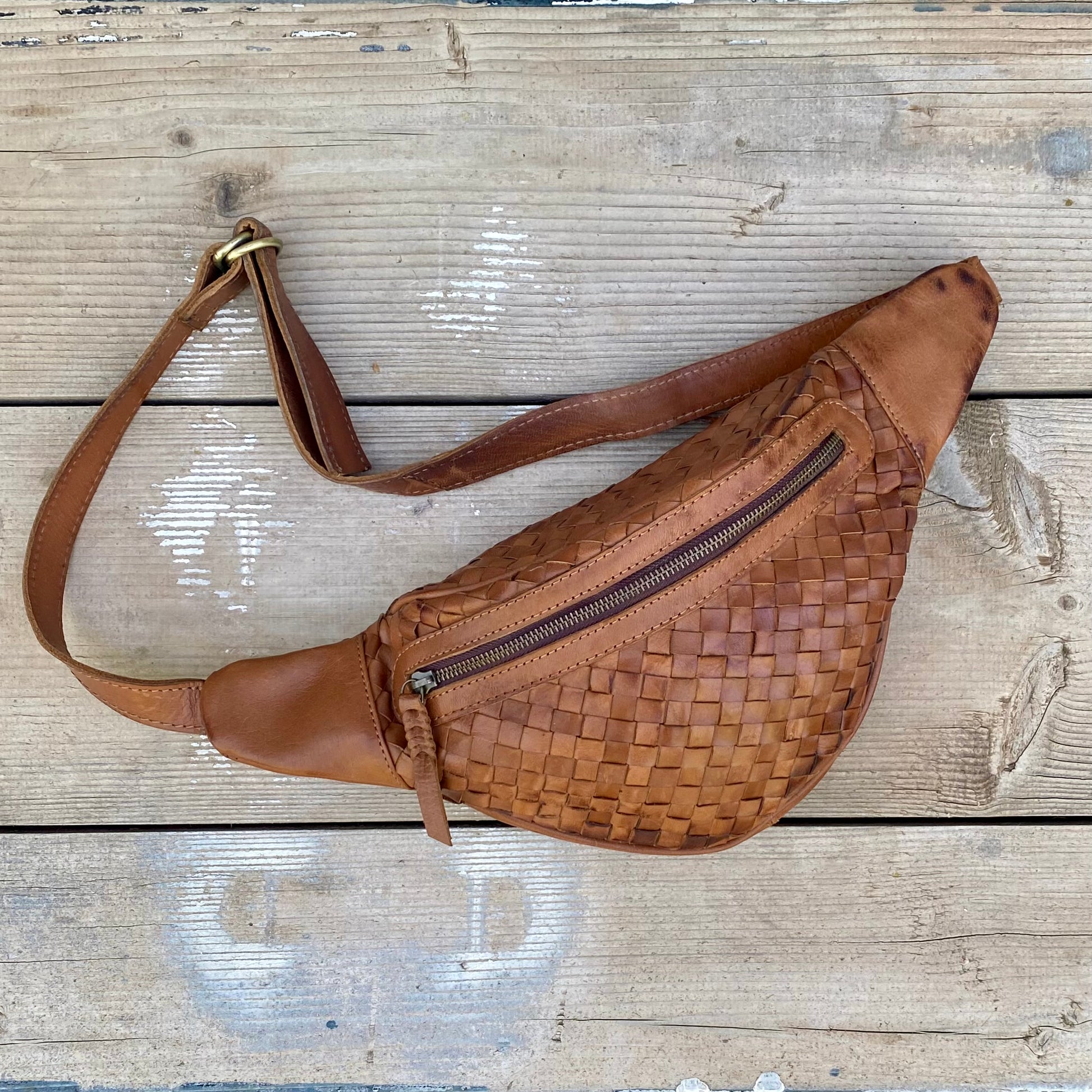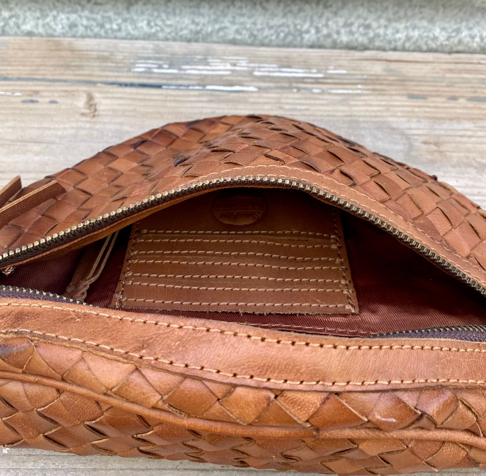 Designed with adventure in mind, the Sunshine Barossa Vintage Tan Leather Travel / Bum Bag is a versatile, perfect sized bag. Intended to be worn around your waist, or accross your body it allows you to keep your belongings secure, yet easily accessible. It securely tucks into your side below your chest using the adjustable strap. At the front there is a wide metal zippered opening looking great surrounded by the stunning leather weave.
