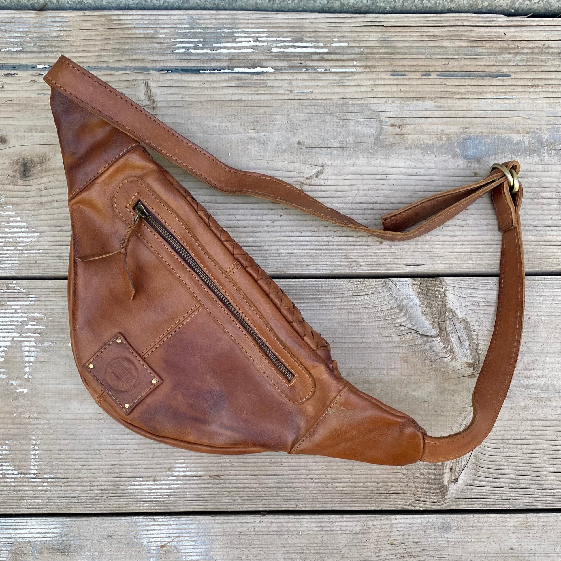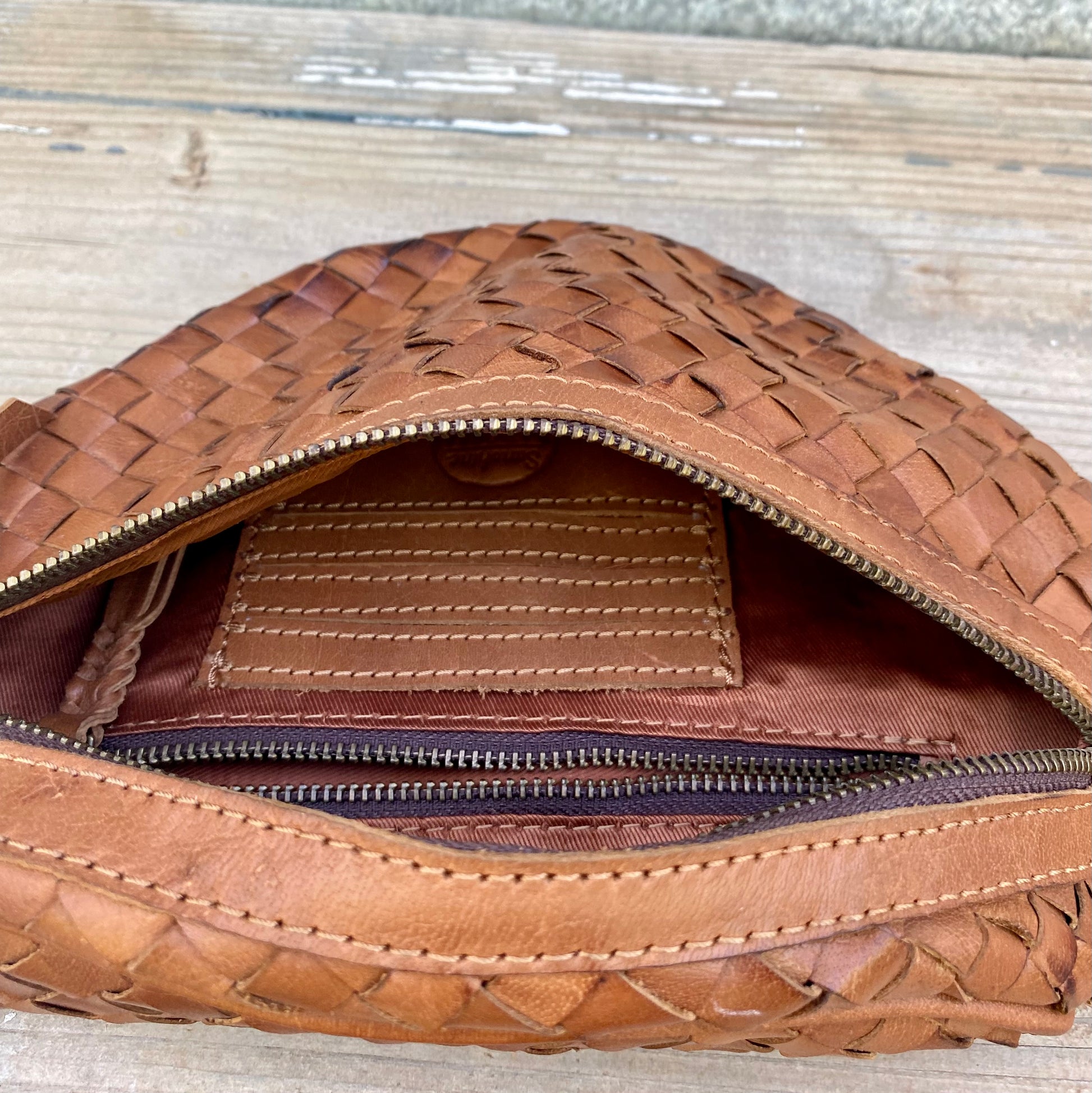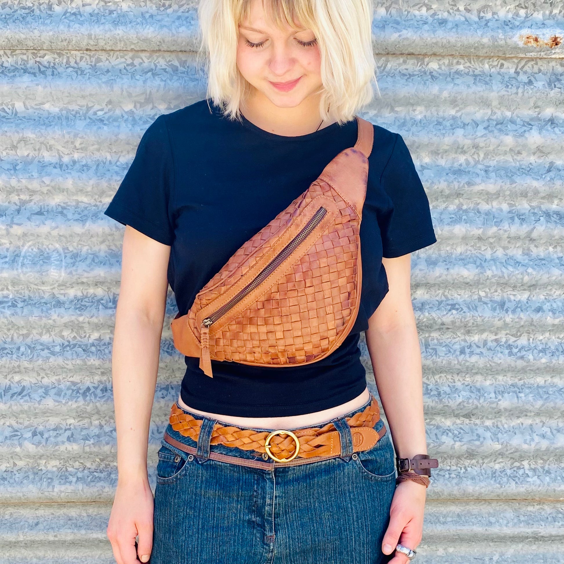 Designed with adventure in mind, the Sunshine Barossa Vintage Tan Leather Travel / Bum Bag is a versatile, perfect sized bag. Intended to be worn around your waist, or accross your body it allows you to keep your belongings secure, yet easily accessible. It securely tucks into your side below your chest using the adjustable strap. At the front there is a wide metal zippered opening looking great surrounded by the stunning leather weave.