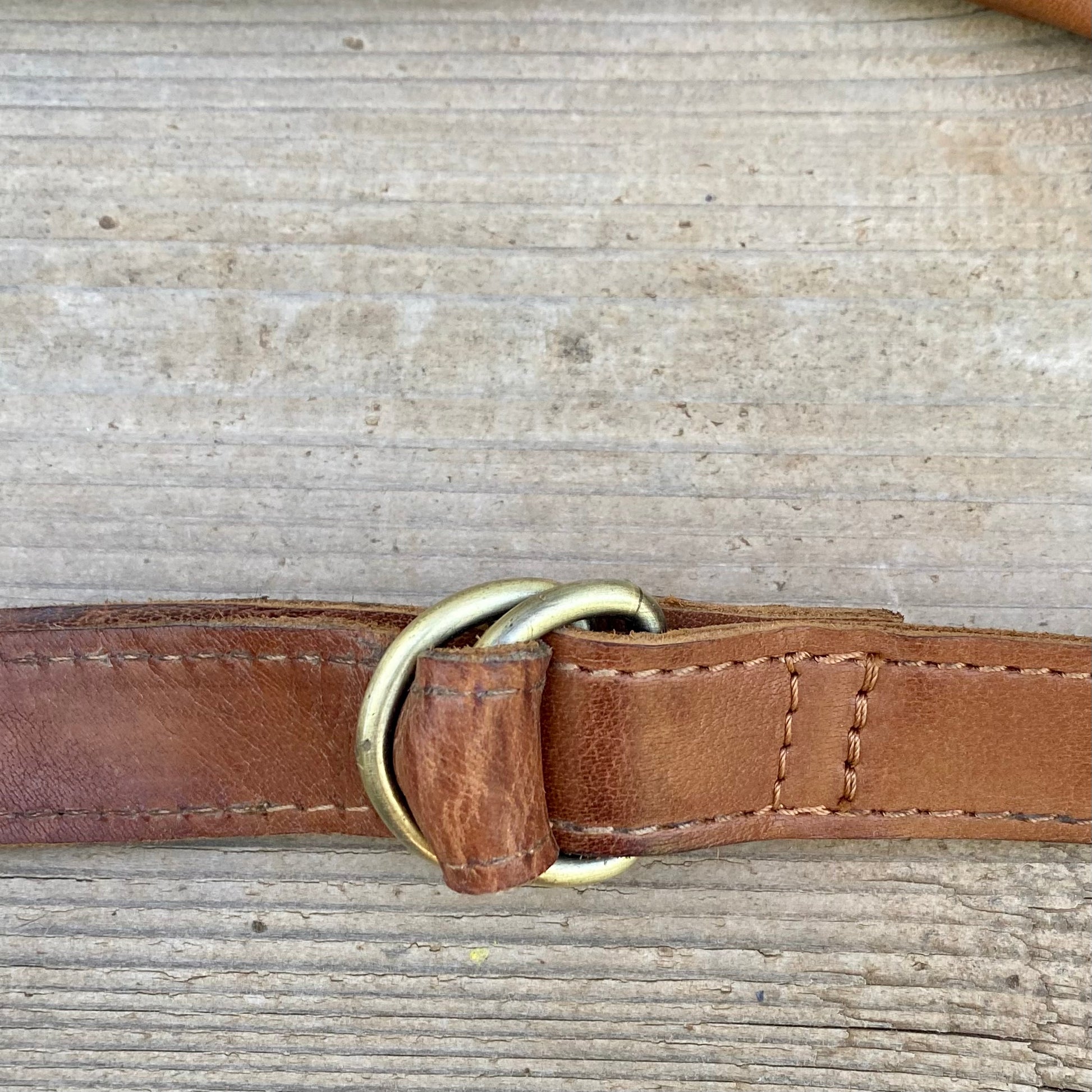 2.5cm strap width x longest 88cm, with 2 metal antique brass DRings to fasten