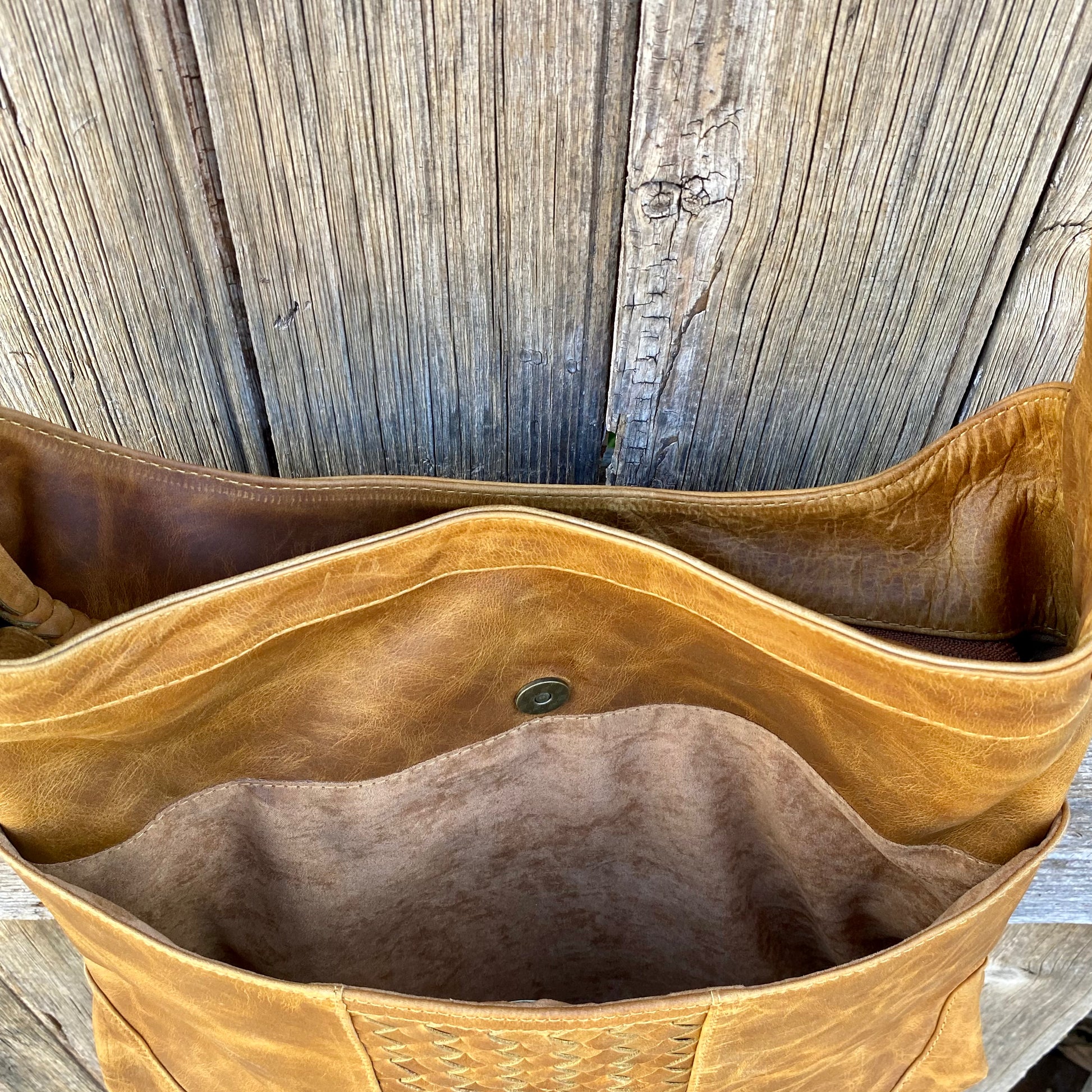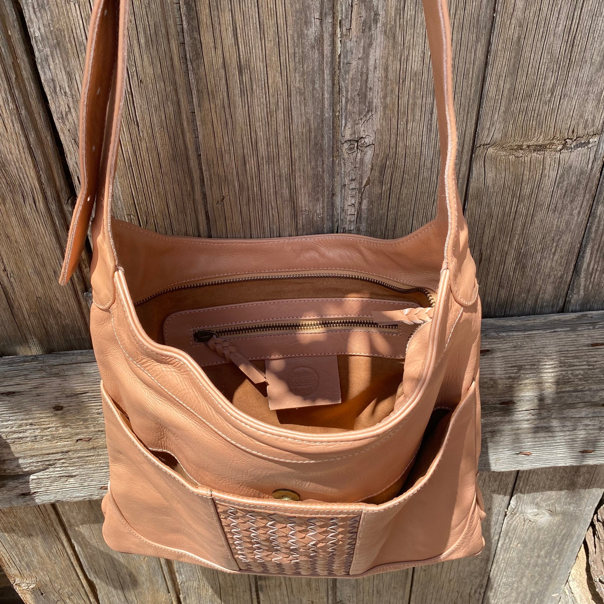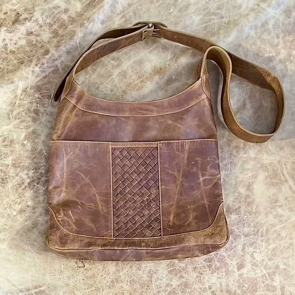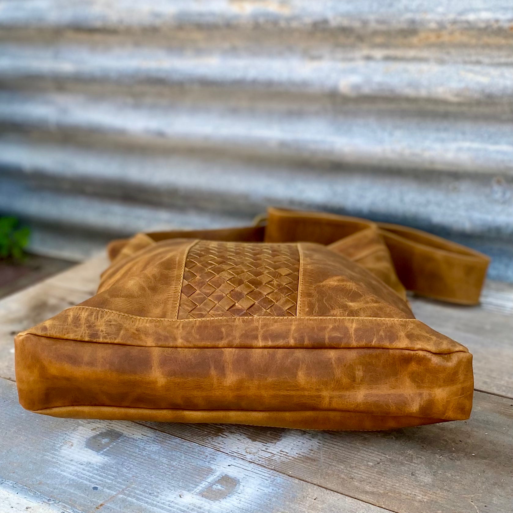 1. A large leather handbag inspired by the importance of comfort with a wide strap with a stunning weave on the front panel.