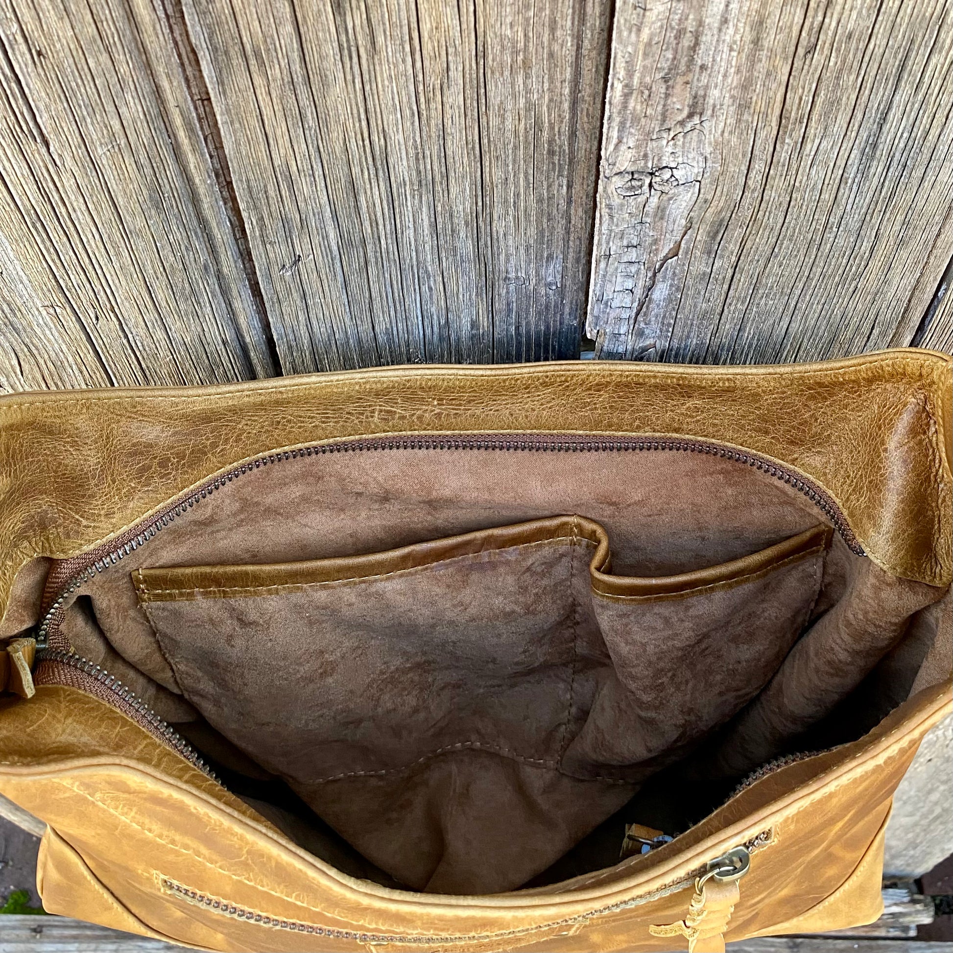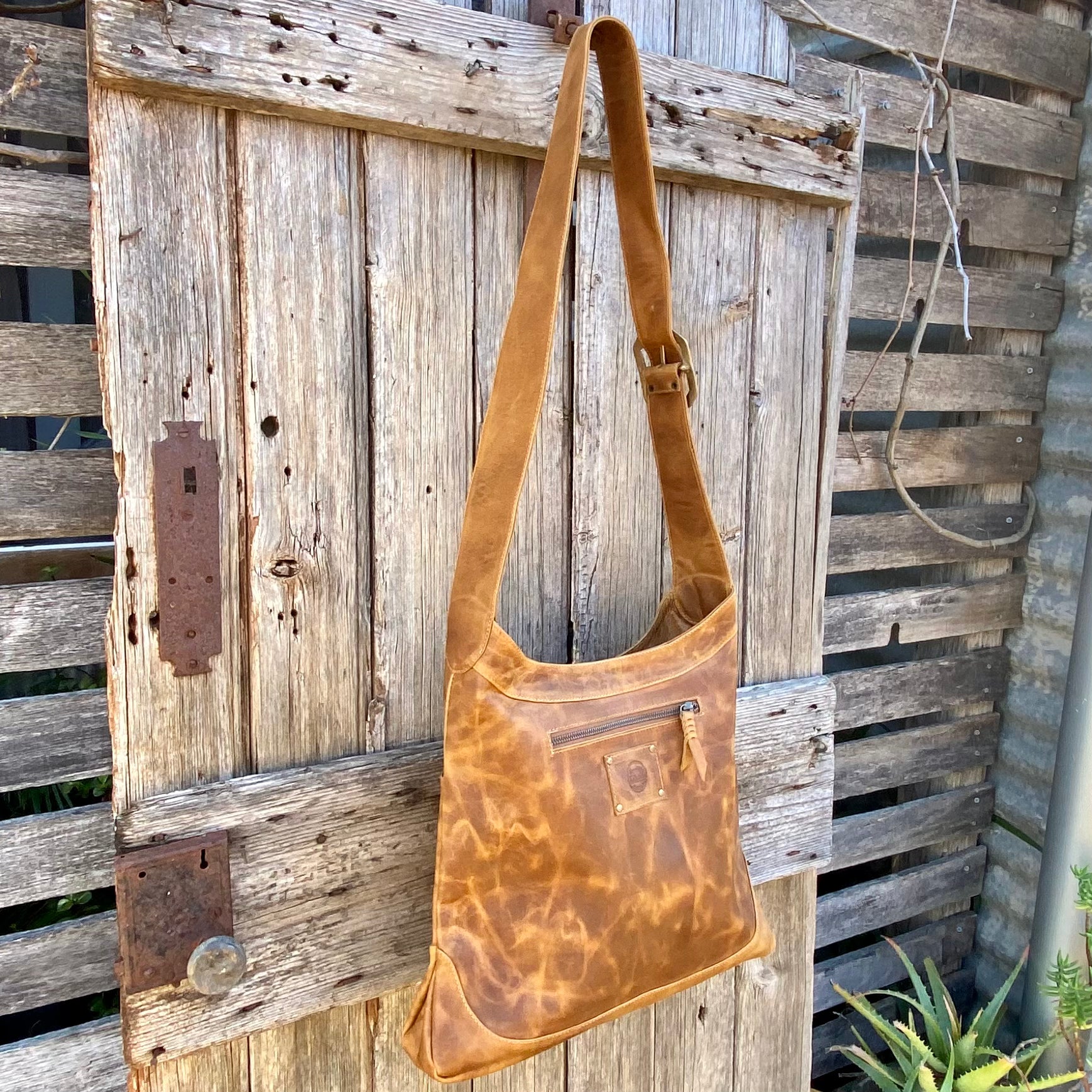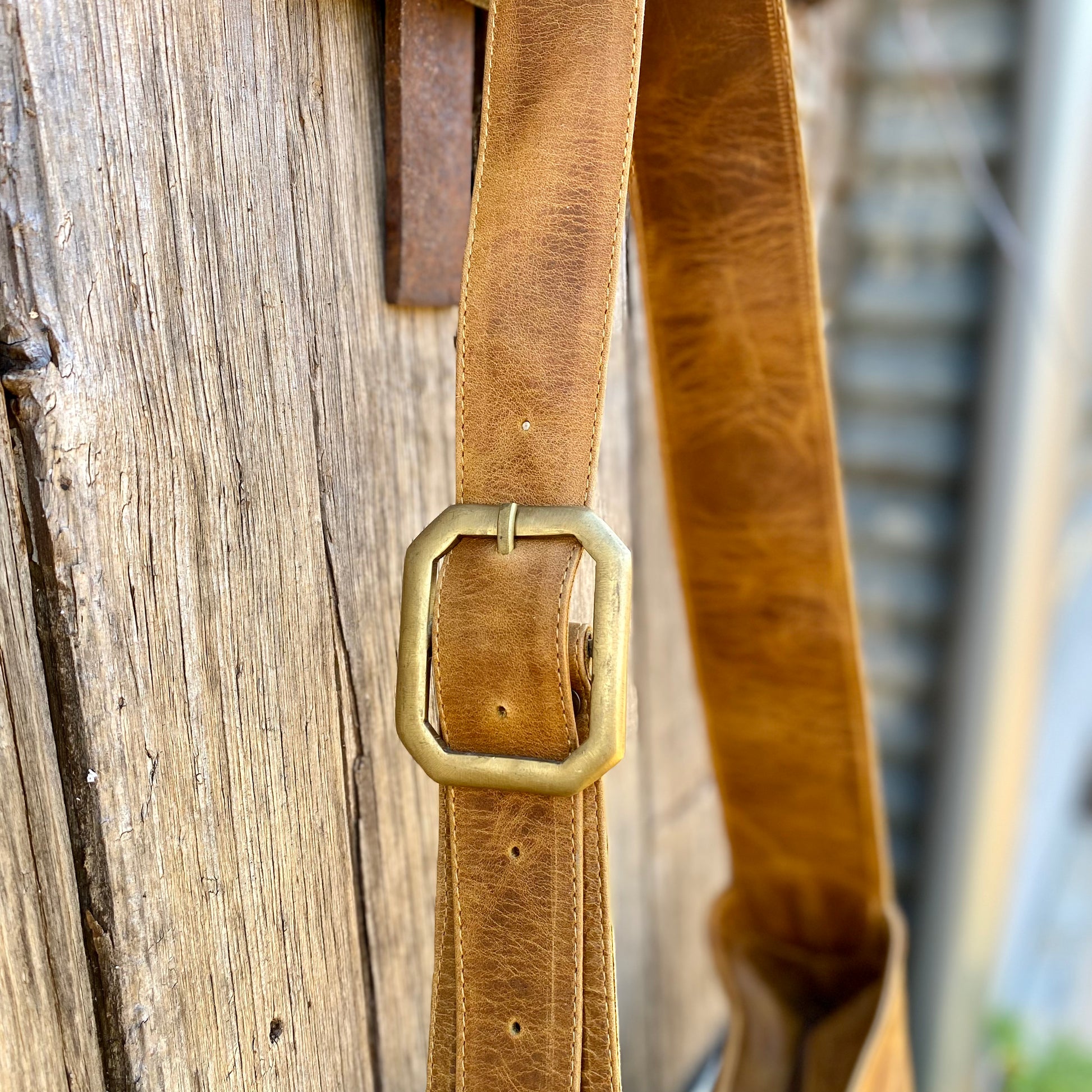 The long, adjustable by an antique brass buckle, the shoulder strap is wide and soft, making it very comfortable to wear. The bag hangs just below the hip, giving a nice relaxed look and feel. Turn the bag around and you’ll find a deep zippered pocket and the Sunshine Barossa logo on the rear.