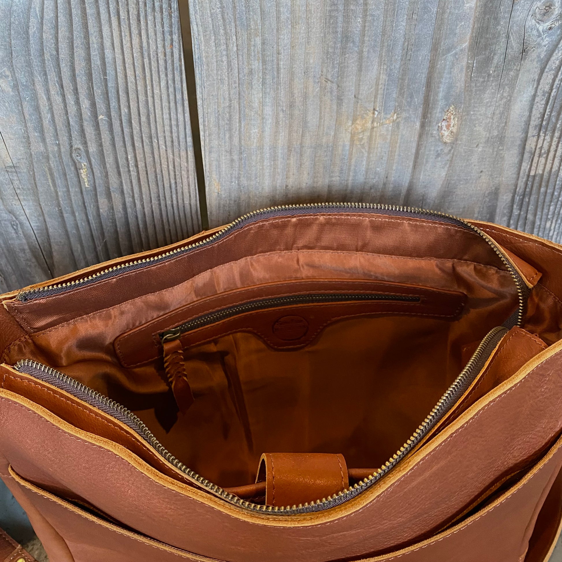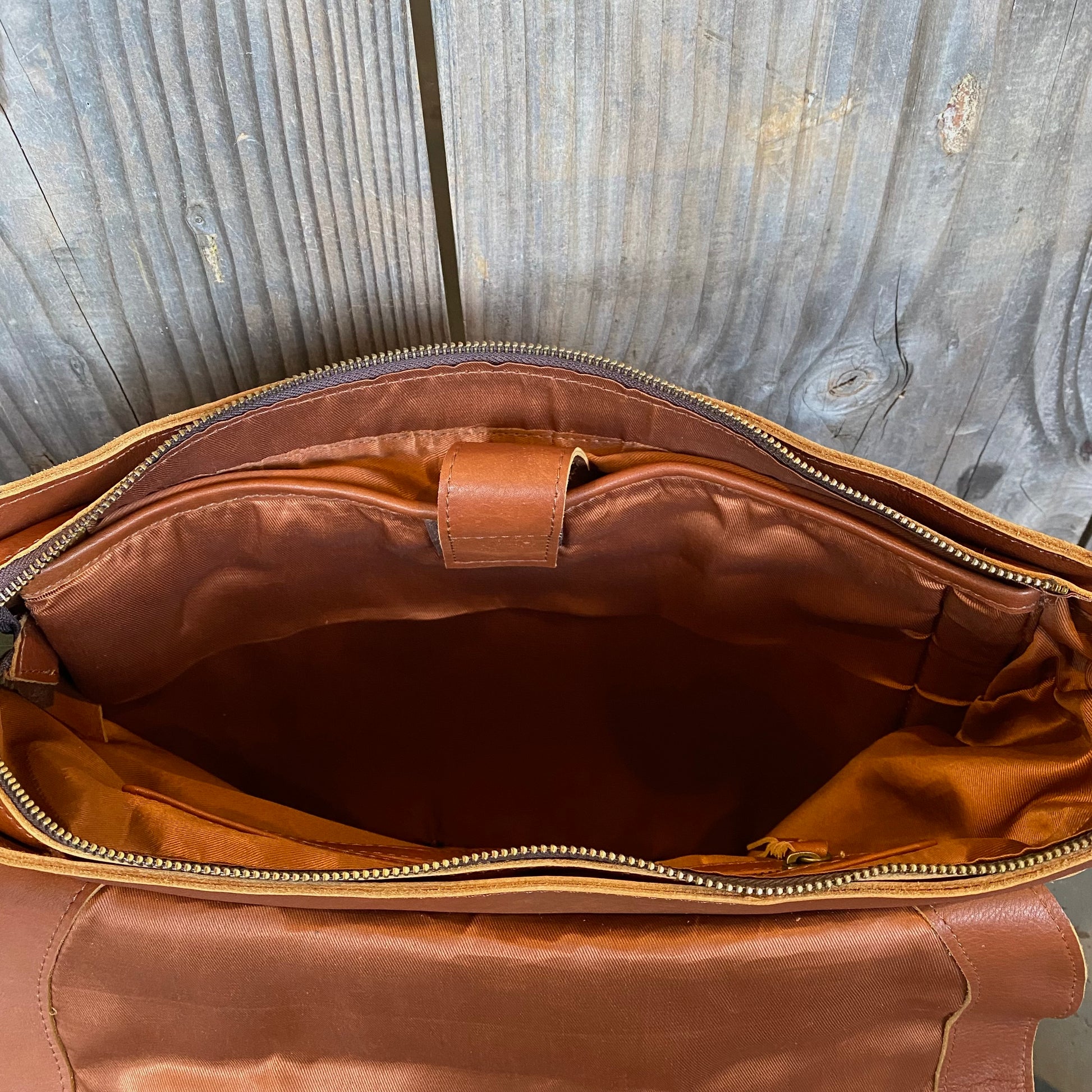 Lifting the leather front flap reveals a full-width zipper, providing security for the contents. The large main compartment features a separate padded area for your laptop, or if you have a very large laptop like Carol, it can fit in the main compartment comfortably still protected. An additional good sized zippered pocket internally with a plaited leather zipper pull to keep safe those important things.