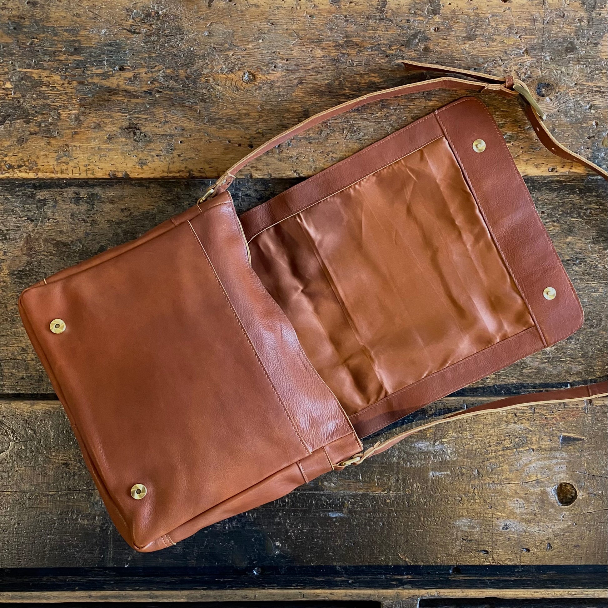 With a traditional look on the outside, the large flap falls freely or fastens with two magnetic clasps. The Satchel includes contemporary features, making this bag the perfect choice for the modern-day business person. Externally this beautiful vintage-look satchel has a large open pocket at the front creating easy access for your phone, wallet and keys. Carol, the owner and designer of Sunshine Barossa has a personal favourite feature of this bag being the stitched leather strap. Made adjustable by a stunningly strong metal antique brass buckle resembling a very cool belt which she loves!