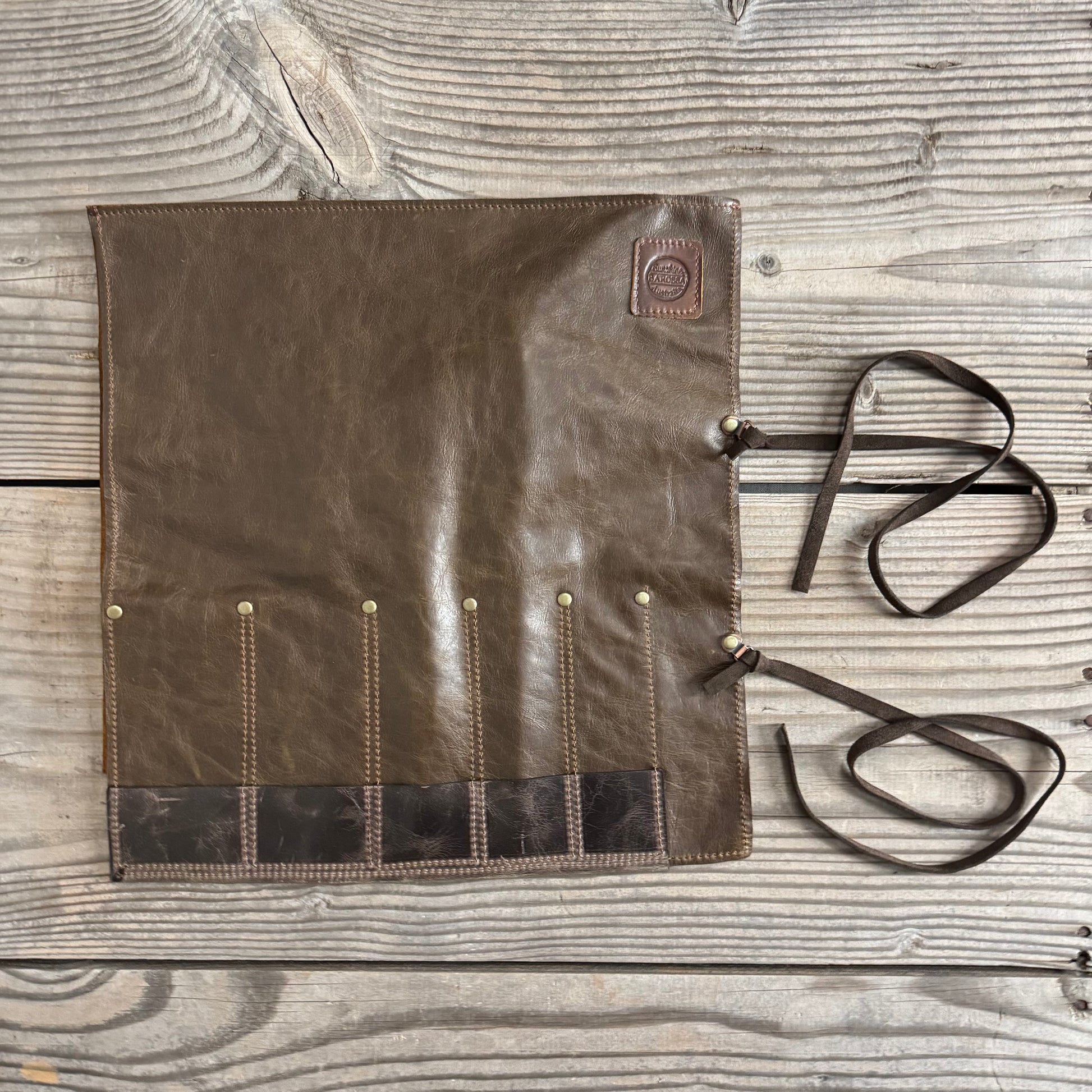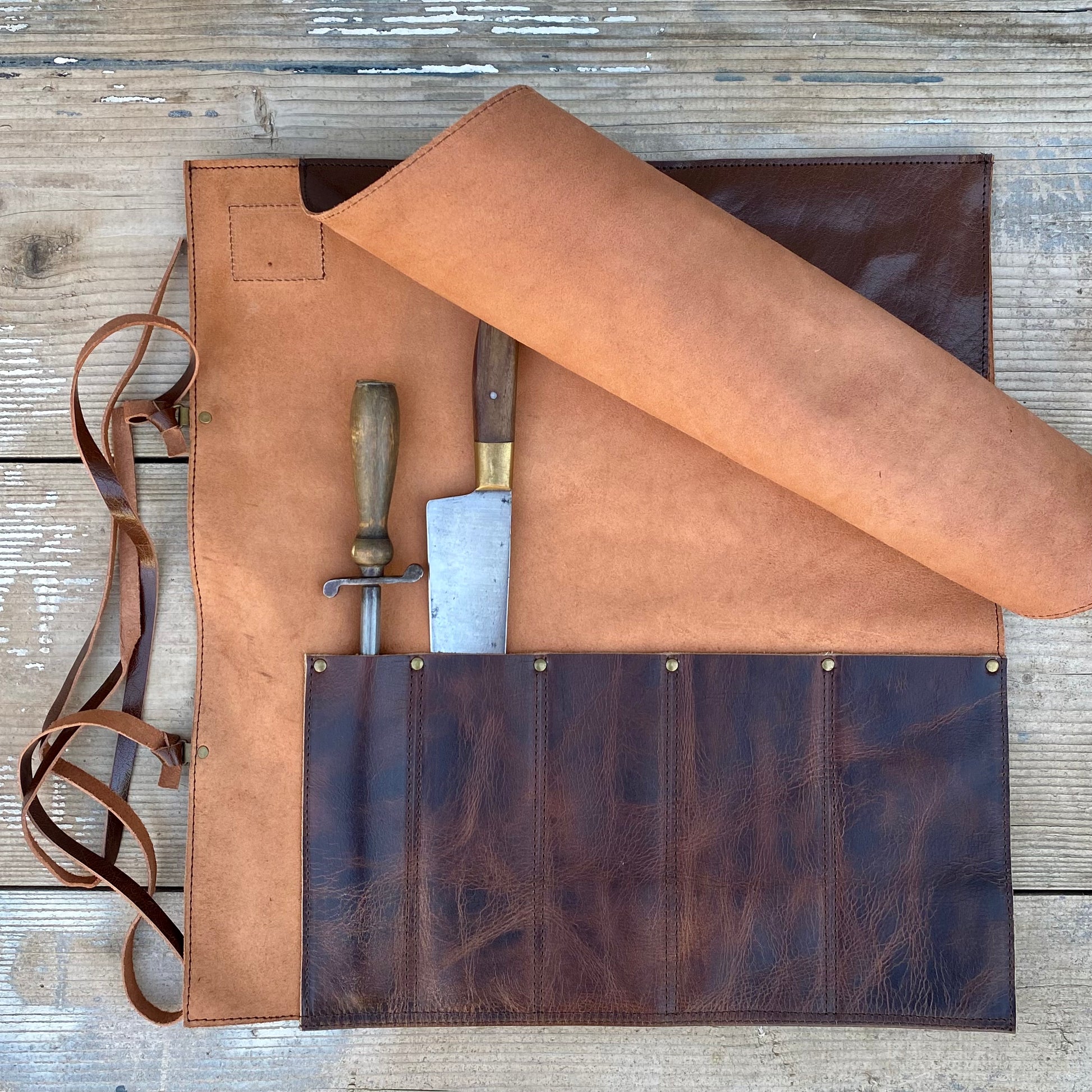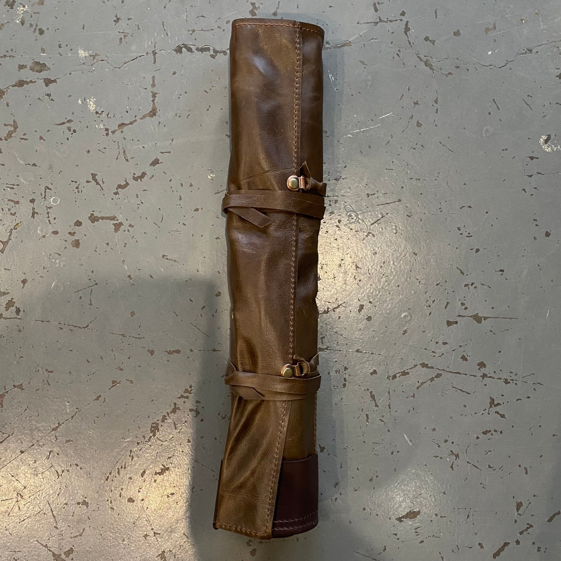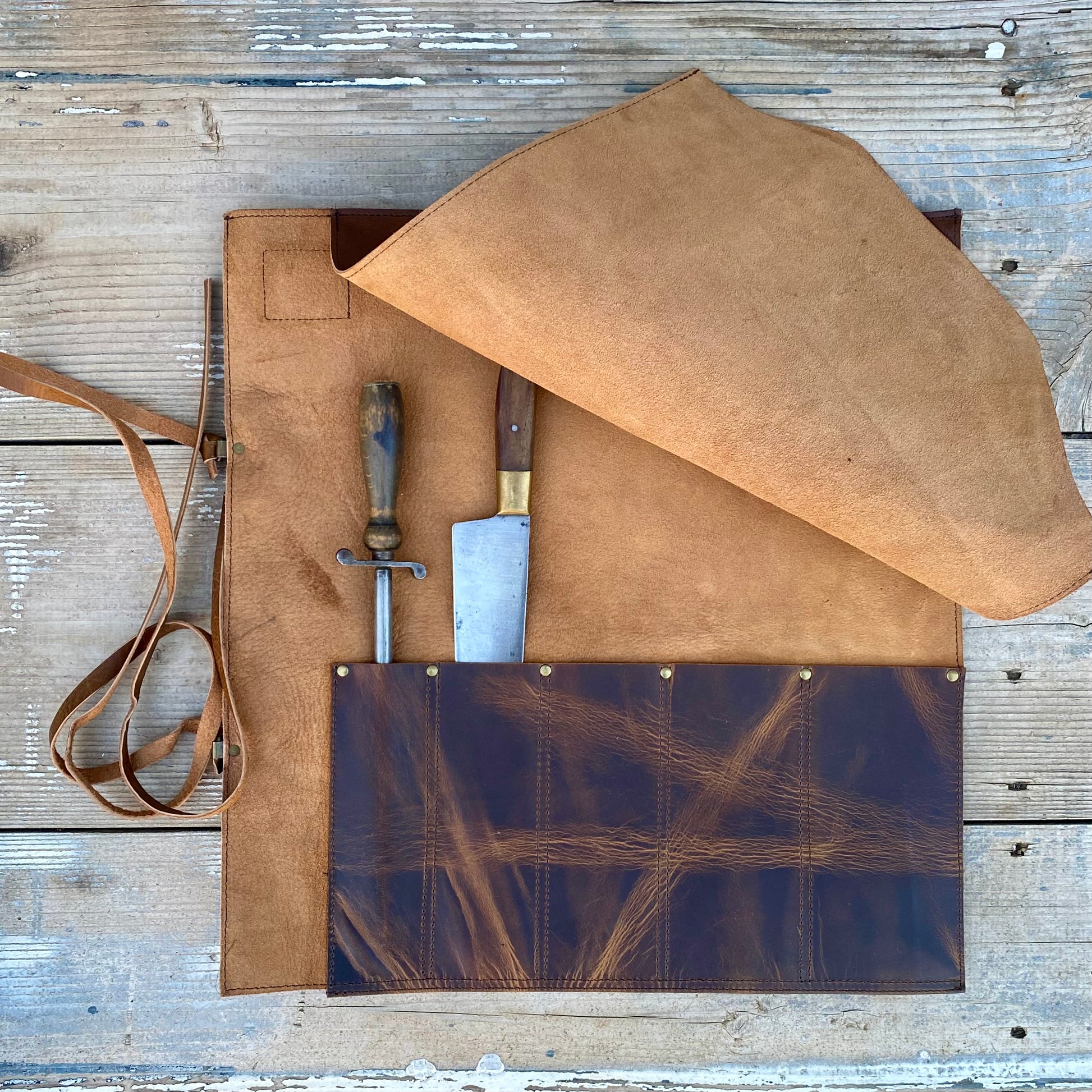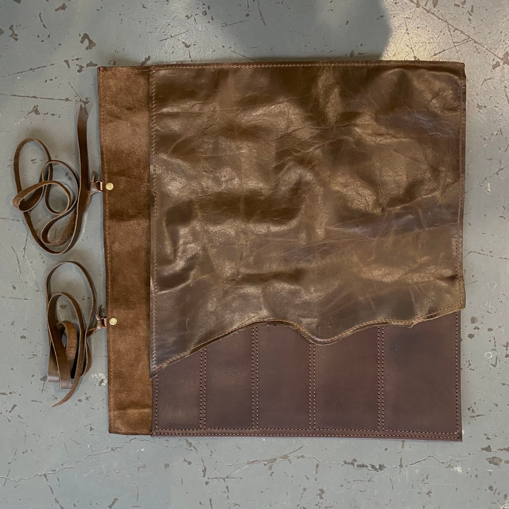 Made from both strong vintage leathers and softer vintage leathers. The Knife slots being strong leather to protect your blades and the rest is softer vintage style leathers, perfect for rolling and covering your knives.
