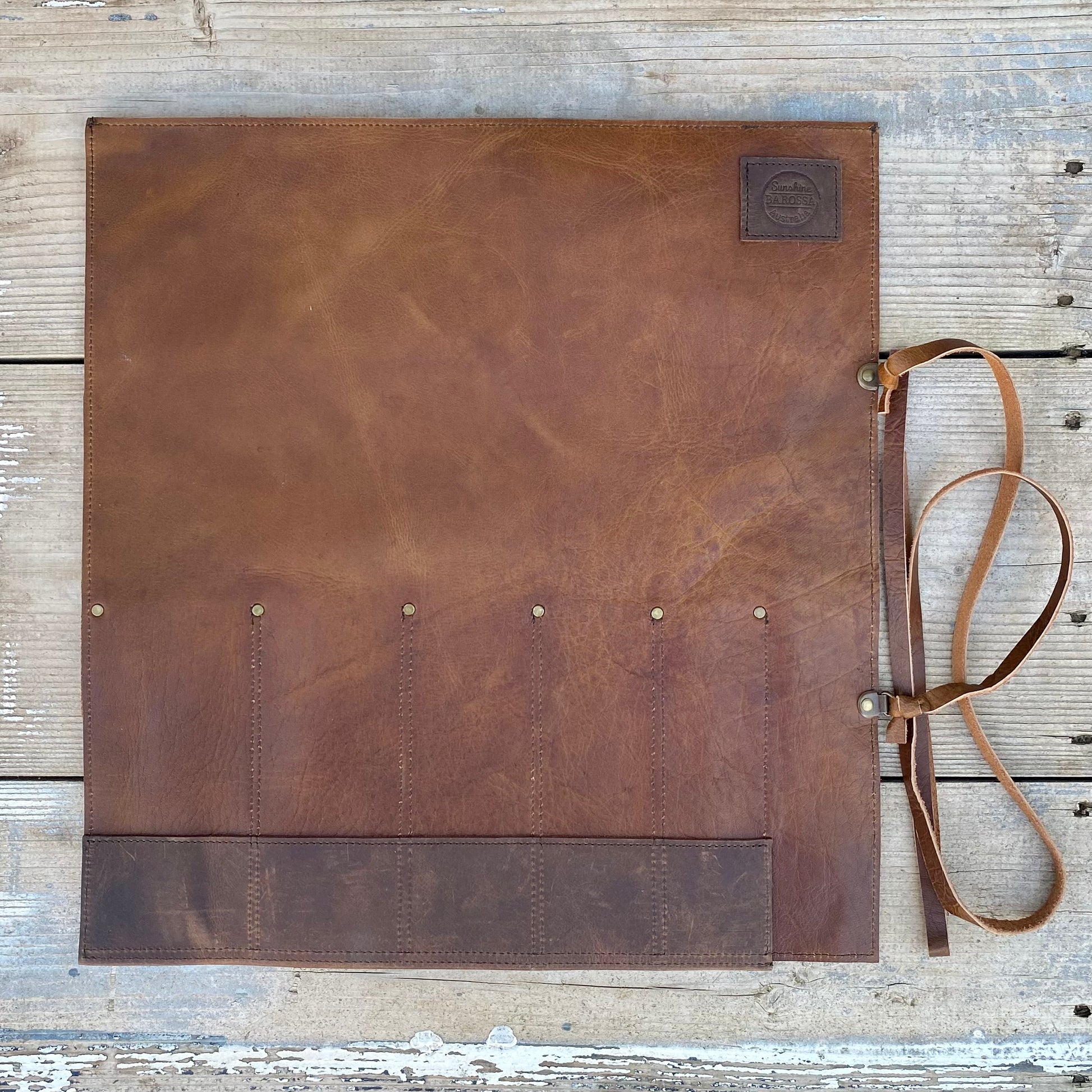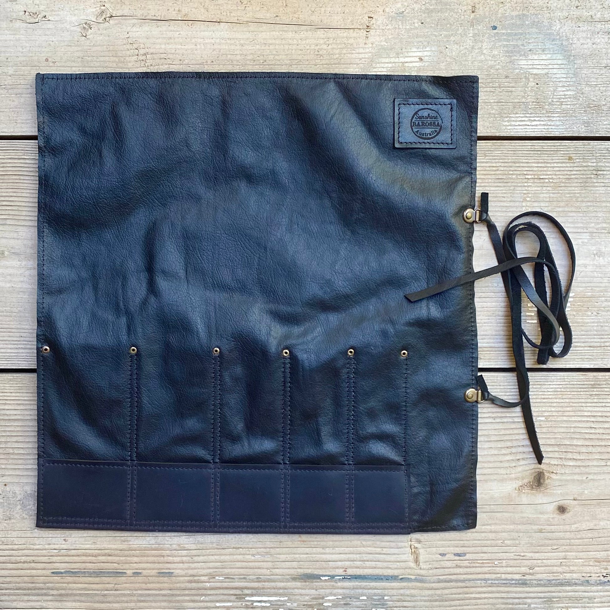 Sunshine Barossa Australia's owner, Carol Dadds, and South Auistralia's well-known businesspeople, Elli Beer from Maggie Beers Farm Shop/The Farm Eatery and Barry from Gardner Knives/Seppeltsfield and Richard from Dogboy Knives collaborated these stunning handcrafted leather knife rolls together to cater for their customer's favourite knives and sharpener in a safe way for transport. Over time it has evolved to improve and each version becomes a better accessory that is much needed if you are a lover of good knives. The flap covering the knives is left with the raw edge of the leather exposed providing us with its natural beauty so they are all unique.