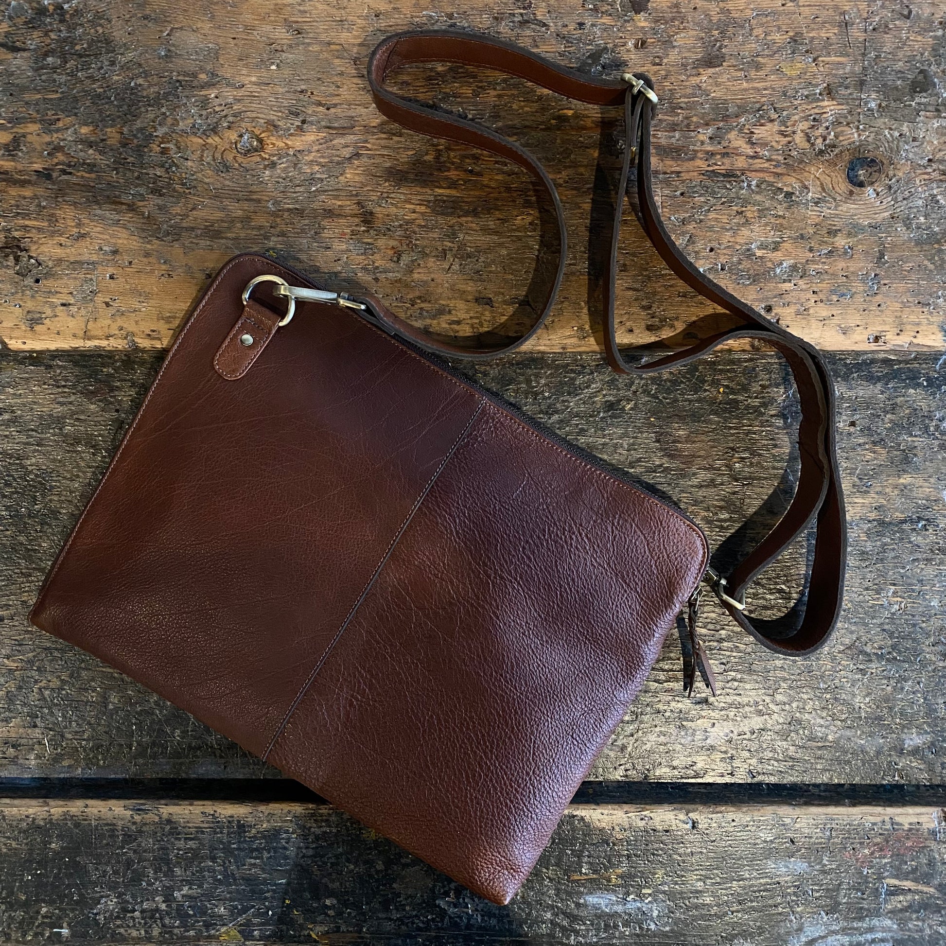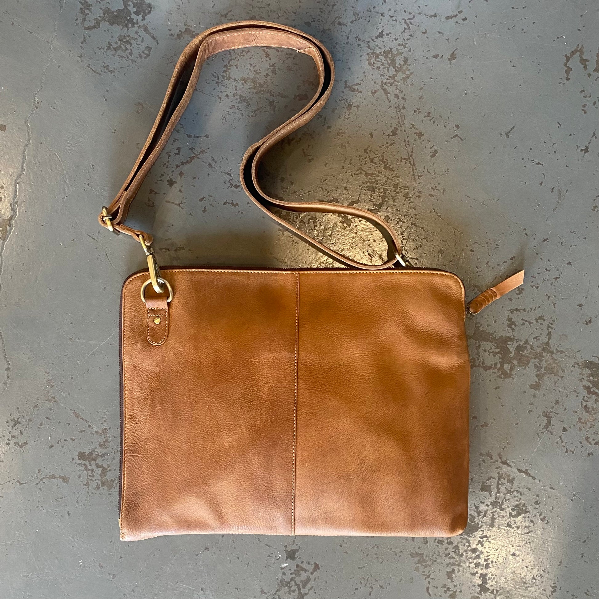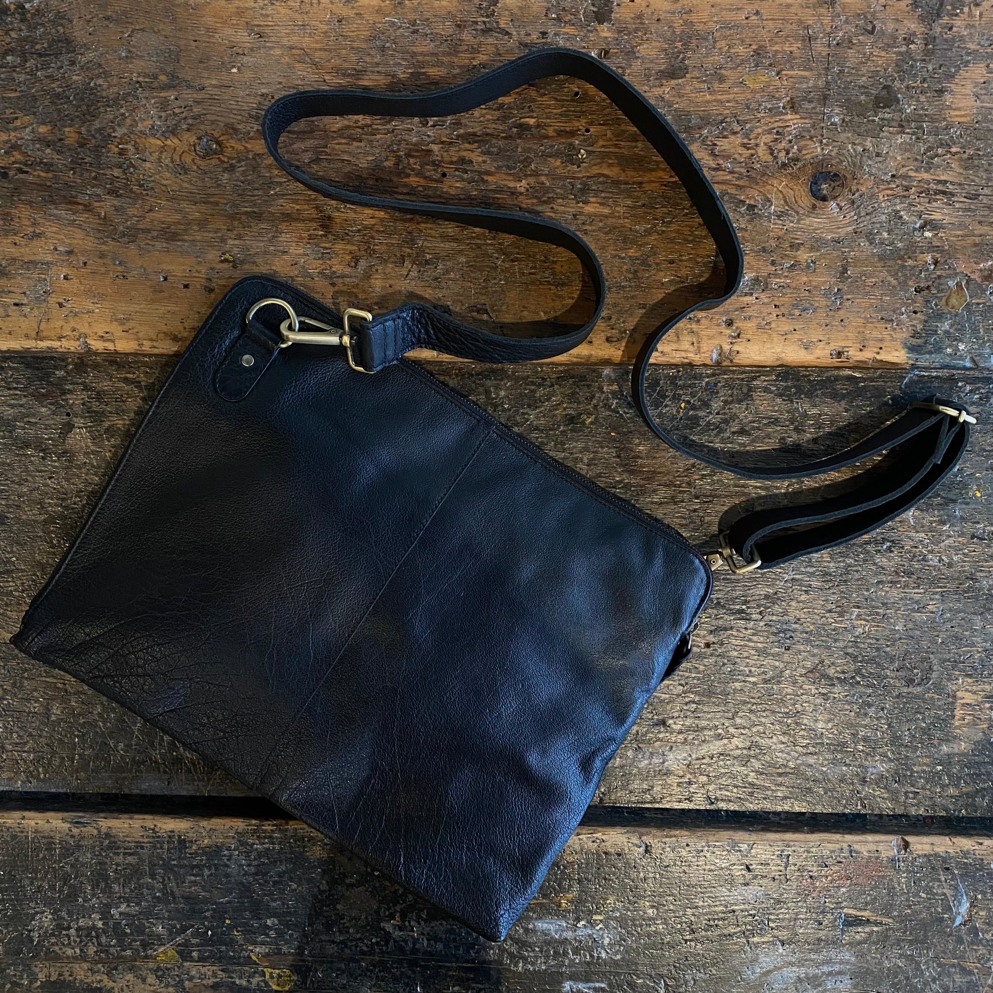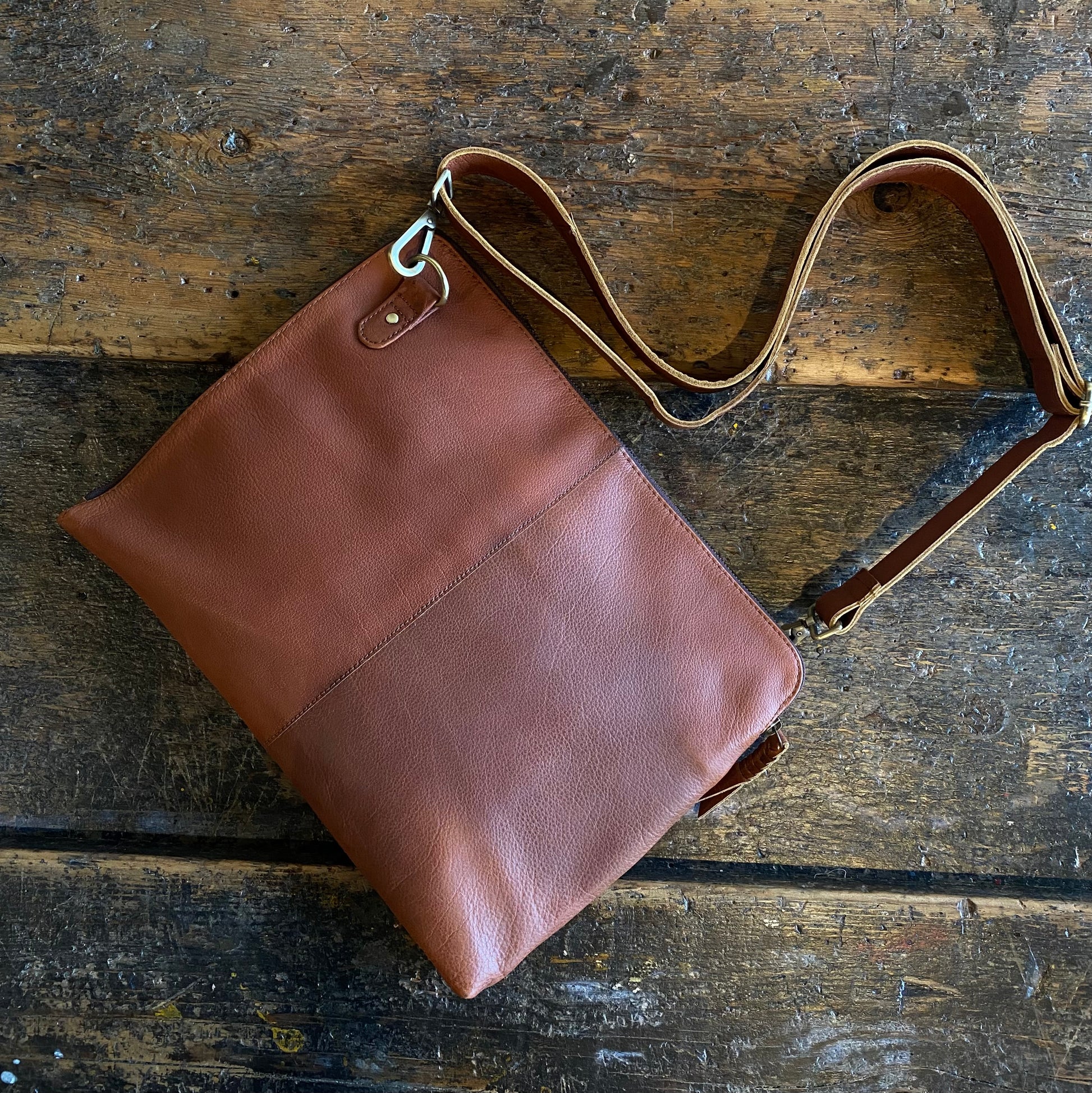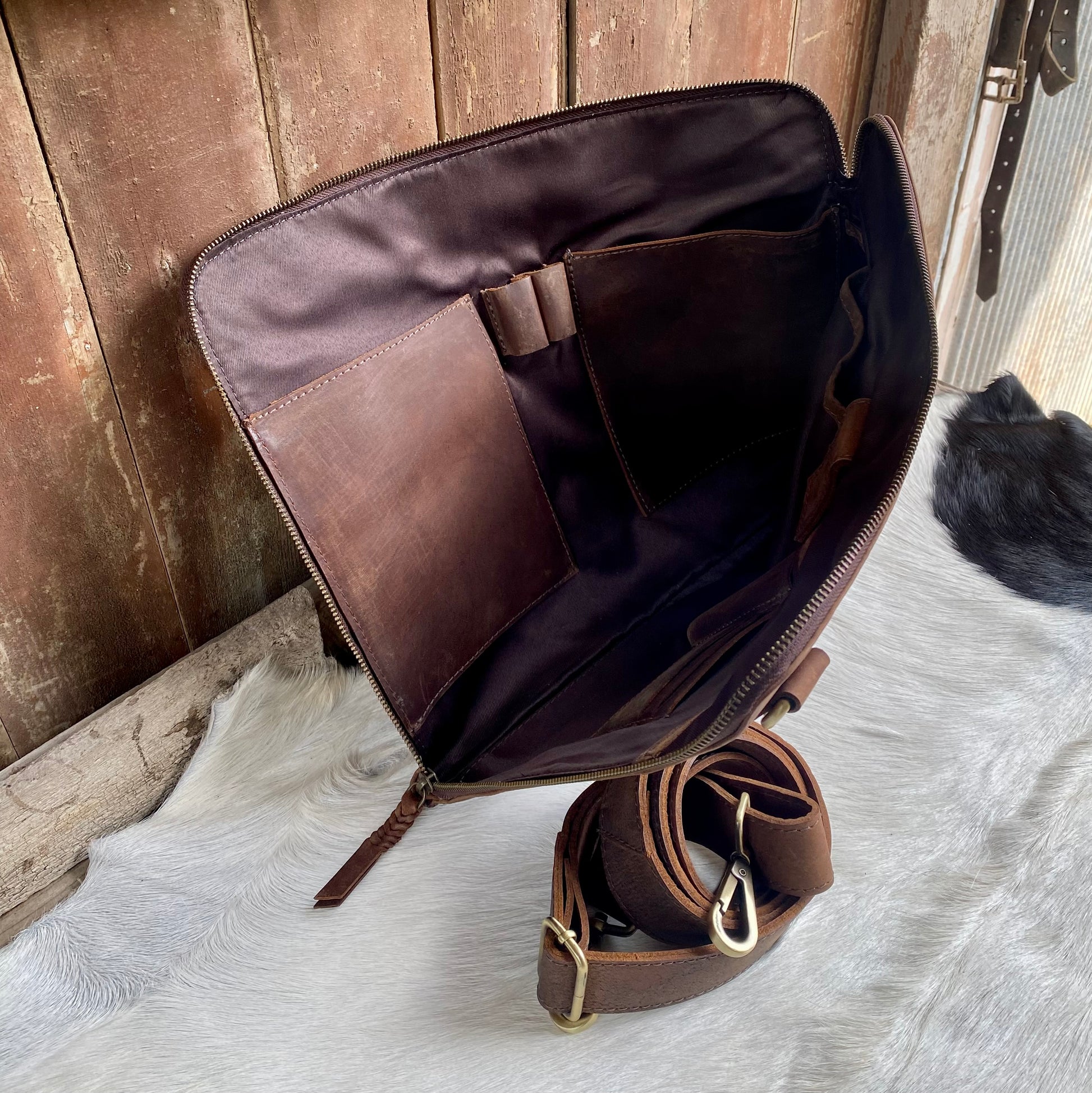 38cm wide pocket with leather tan fastener to hold in laptop/notebook