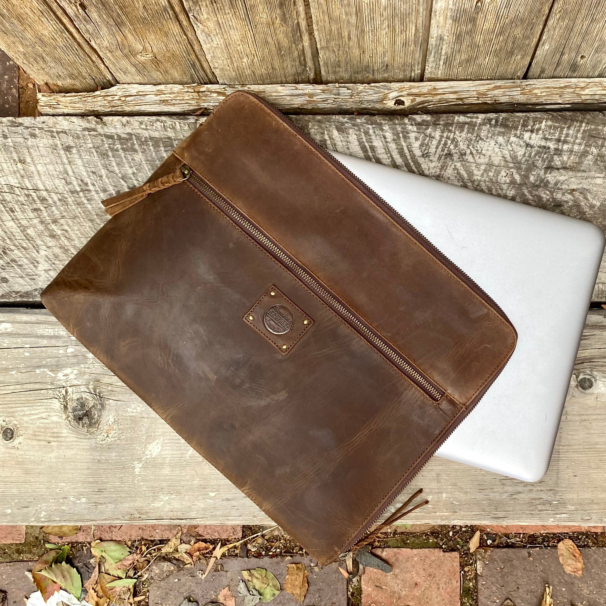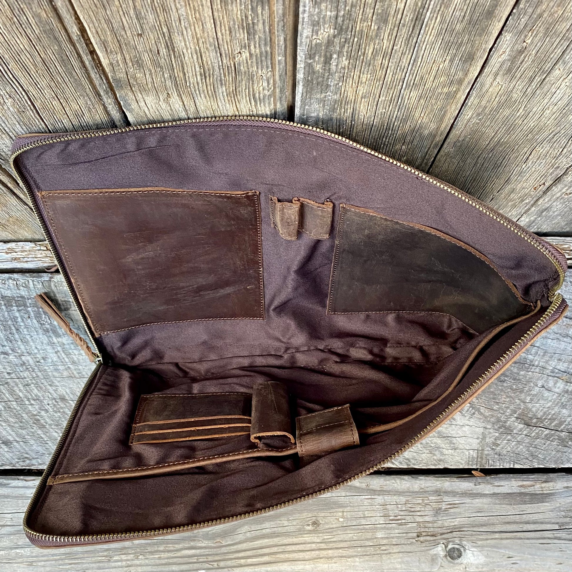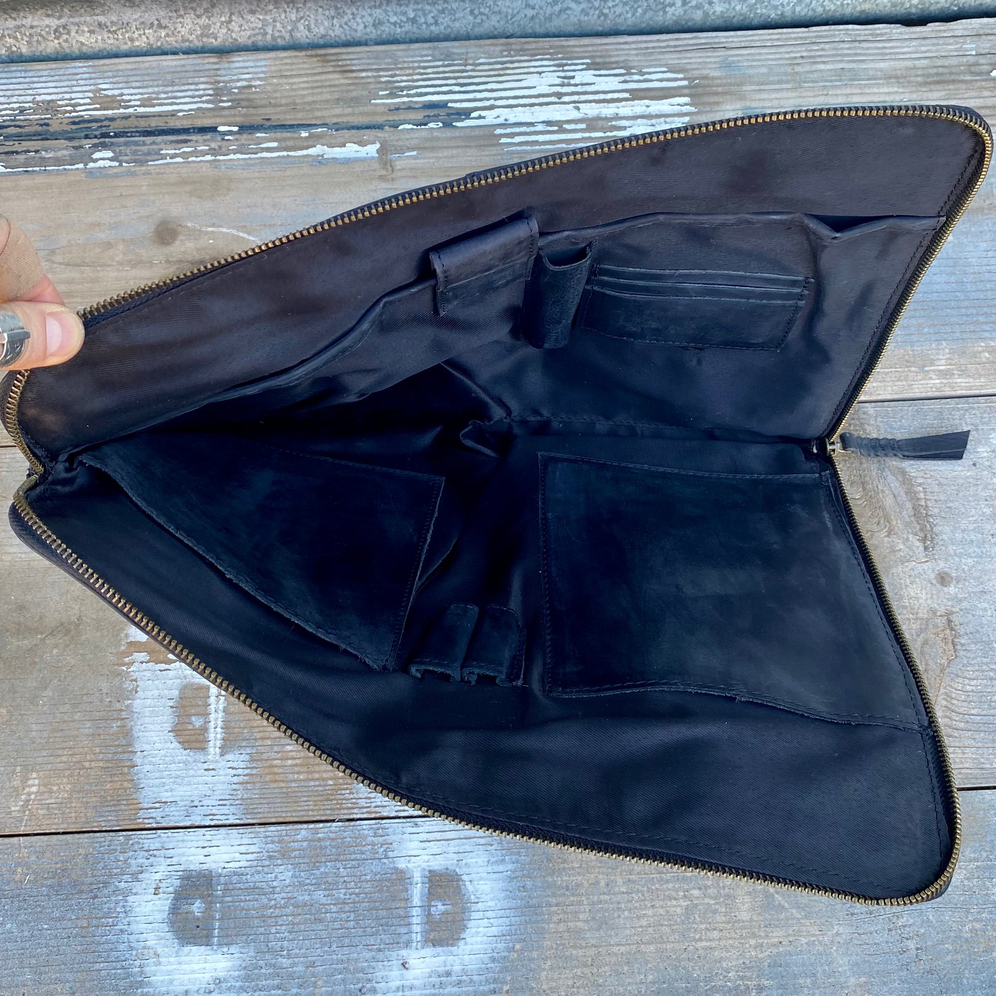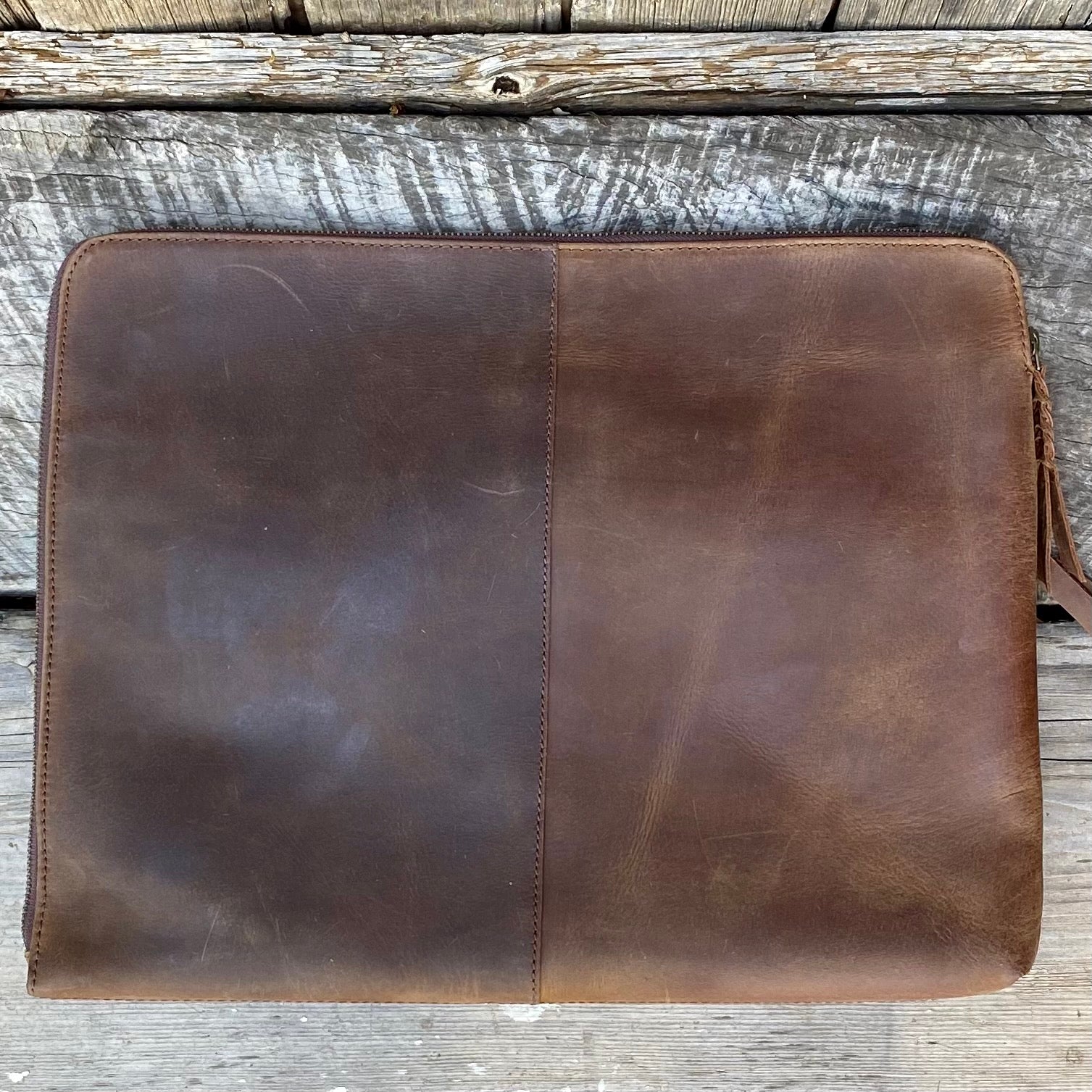 1. a large zip up sleeve made of leather used for work or study to protect and carry a laptop.