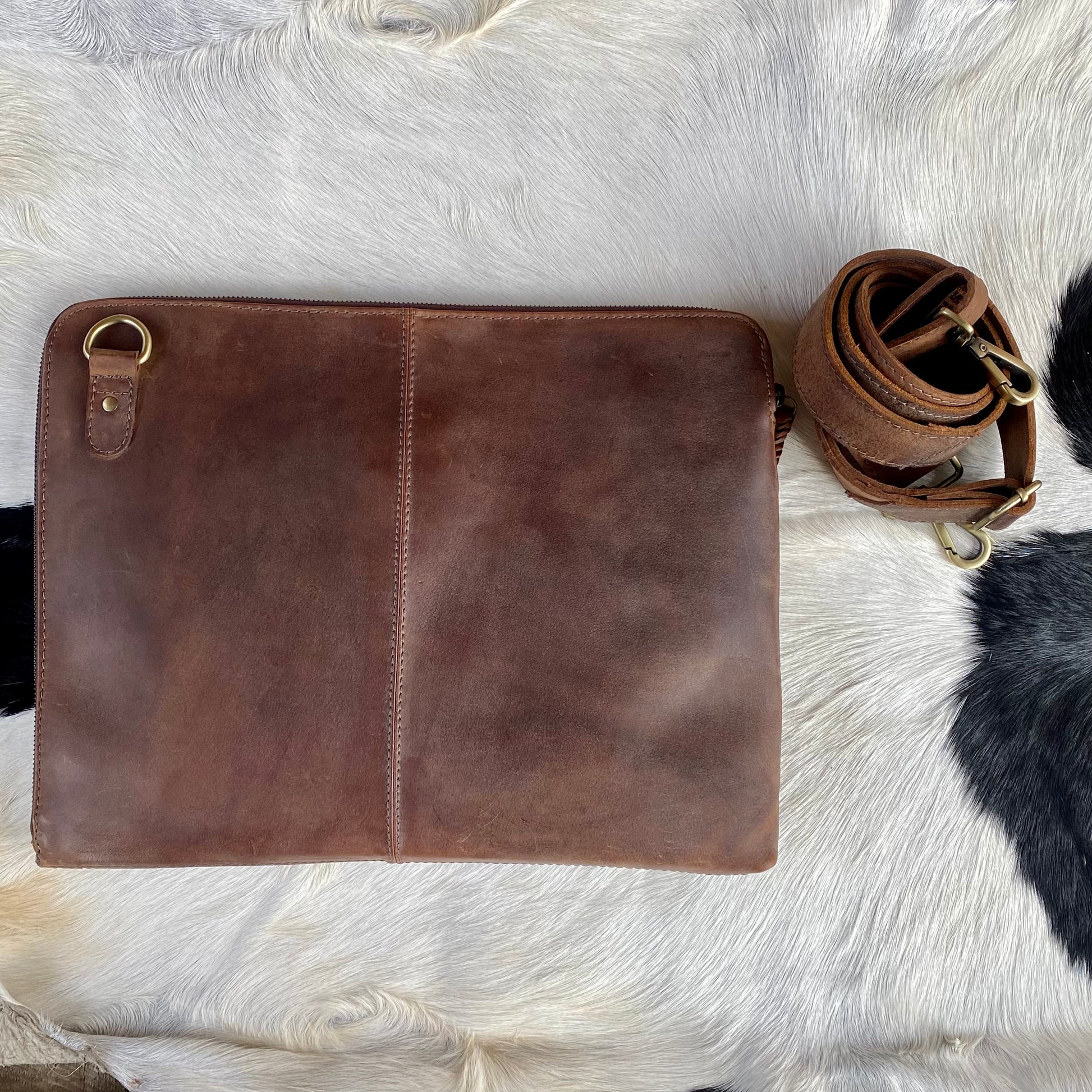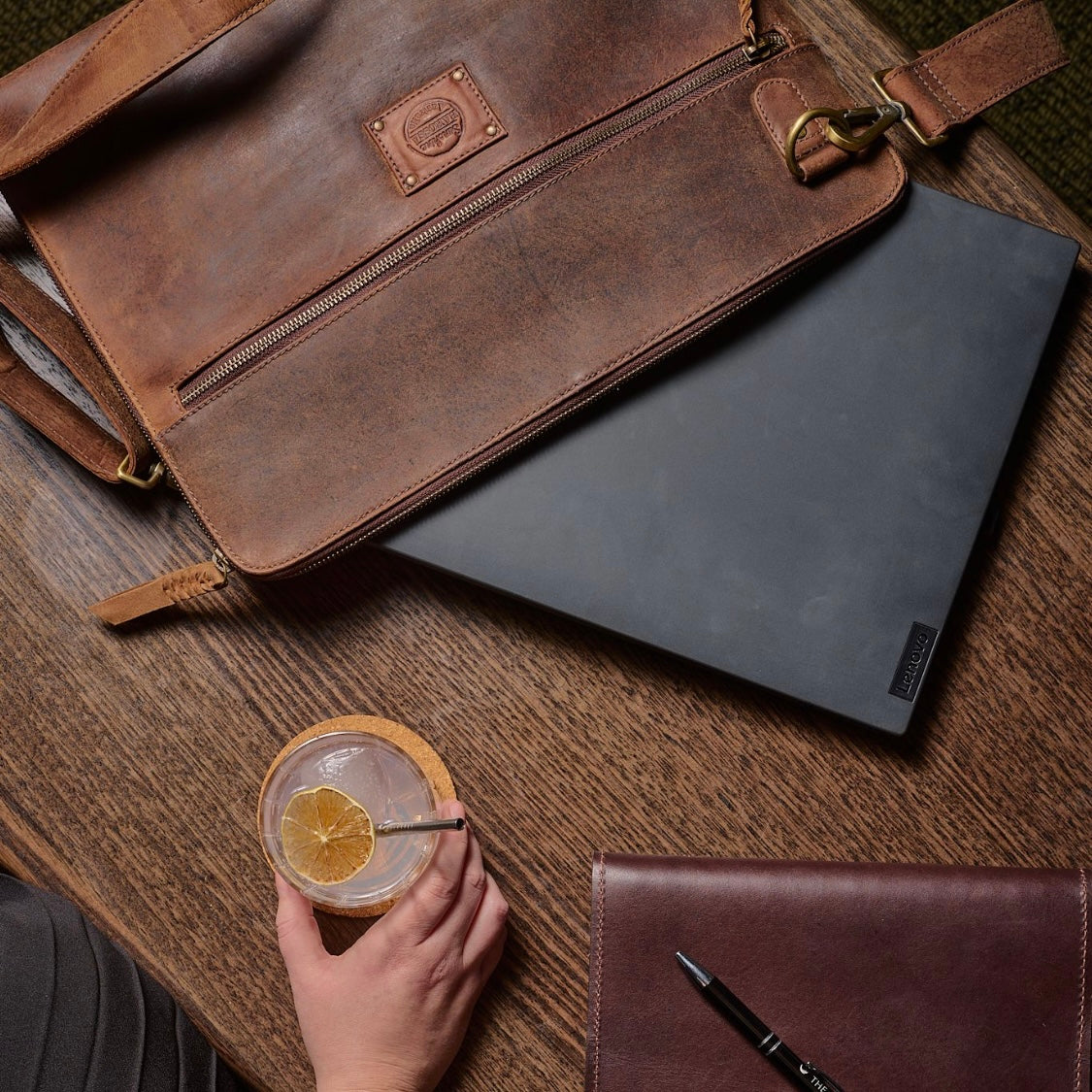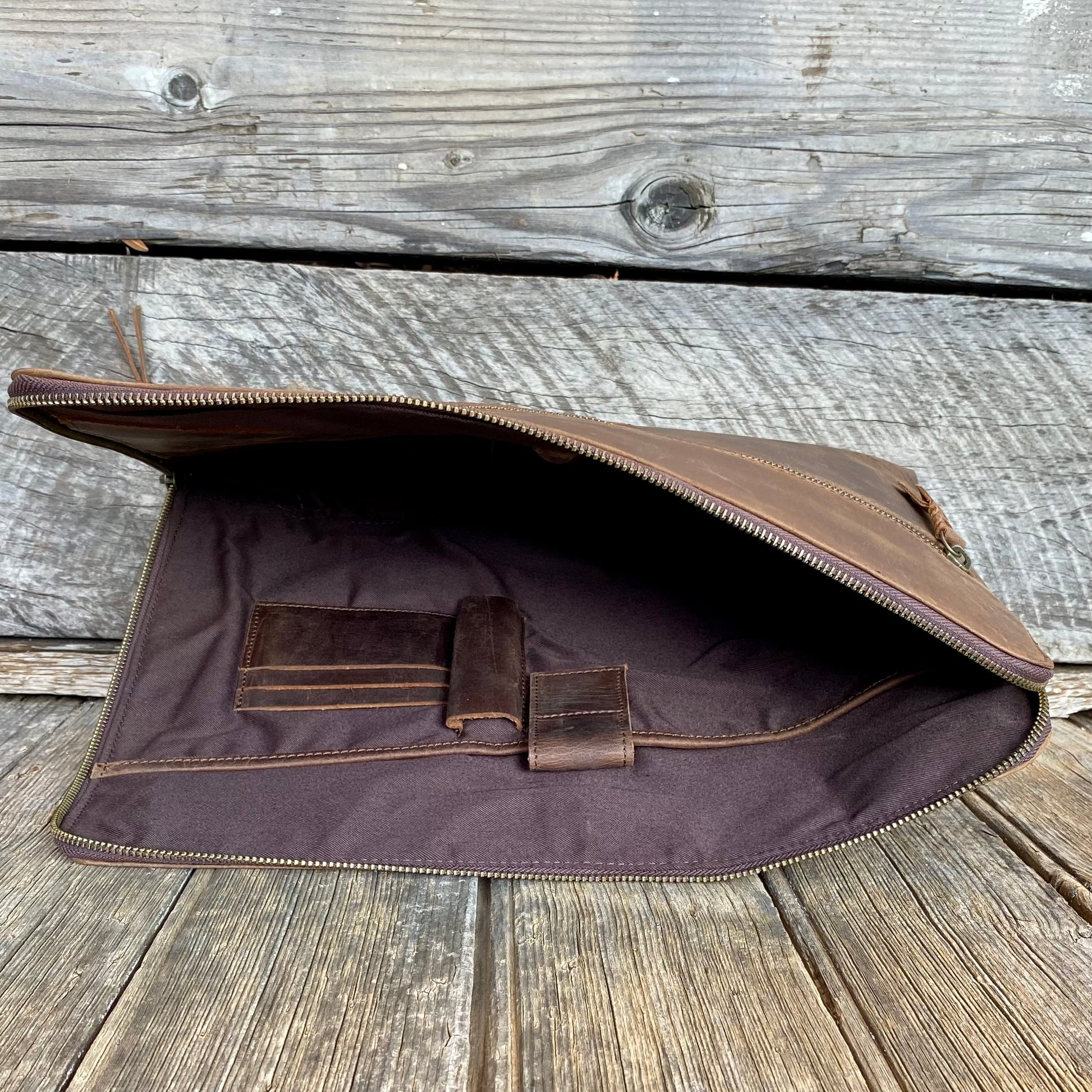 1. a large zip up sleeve made of leather used for work or study to protect and carry a laptop.