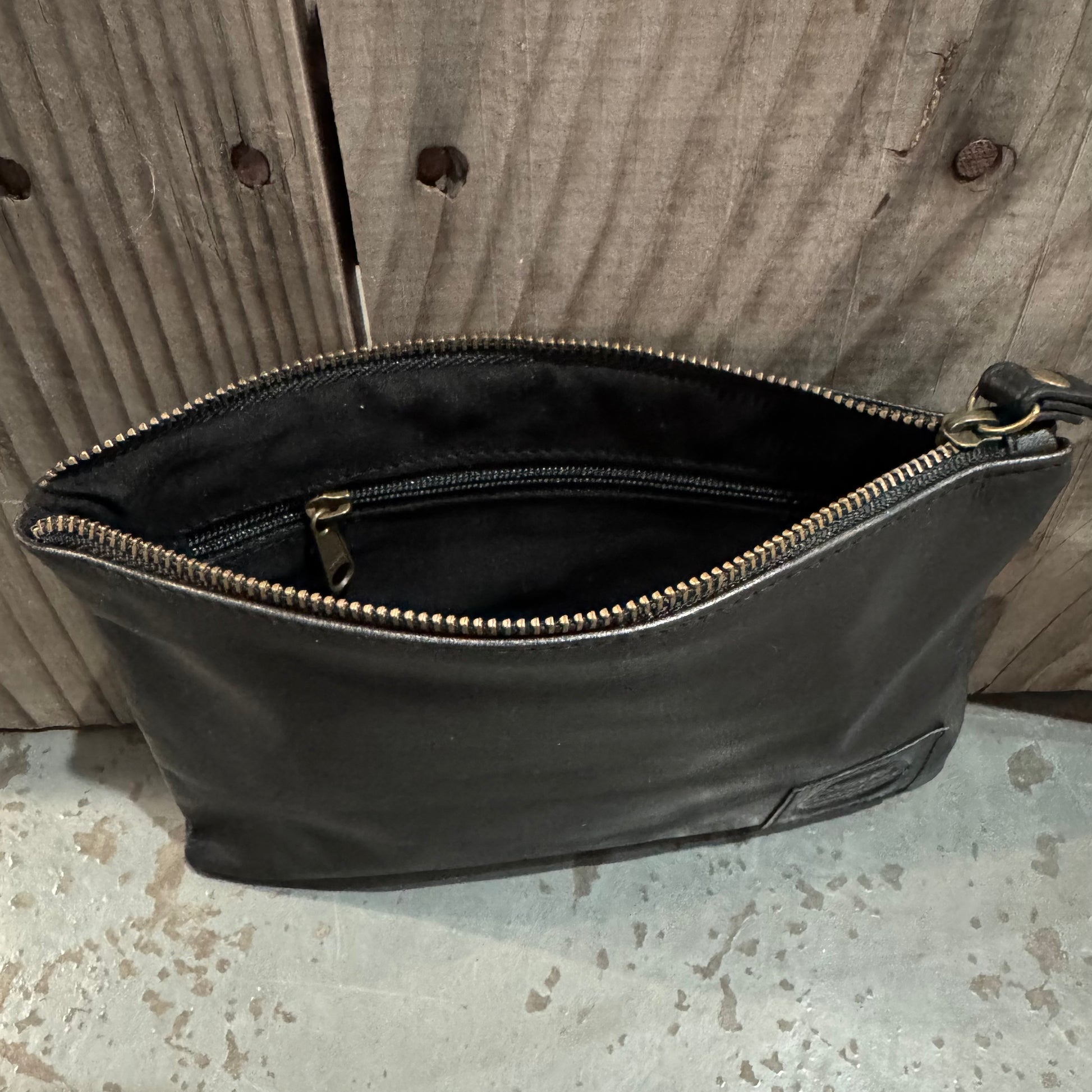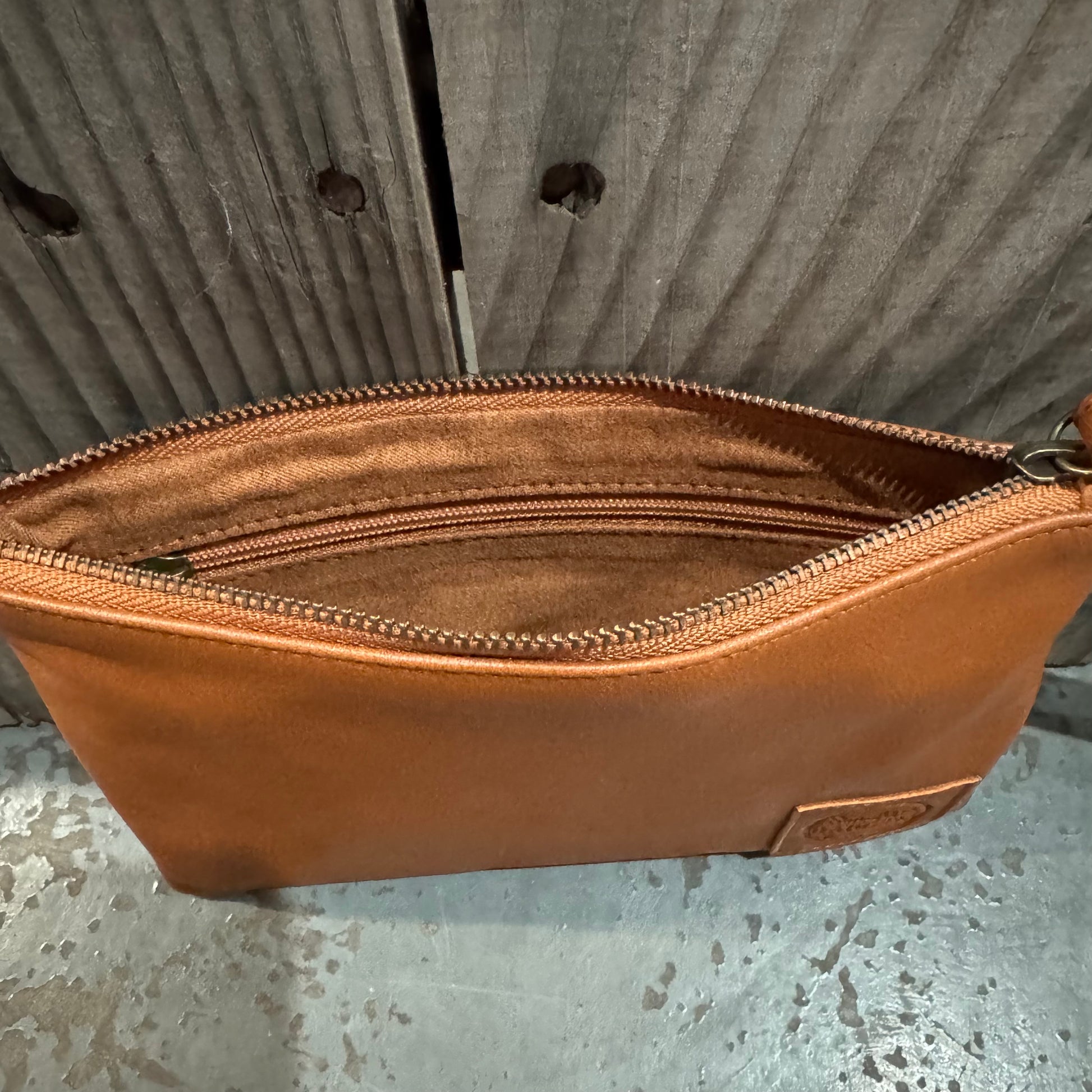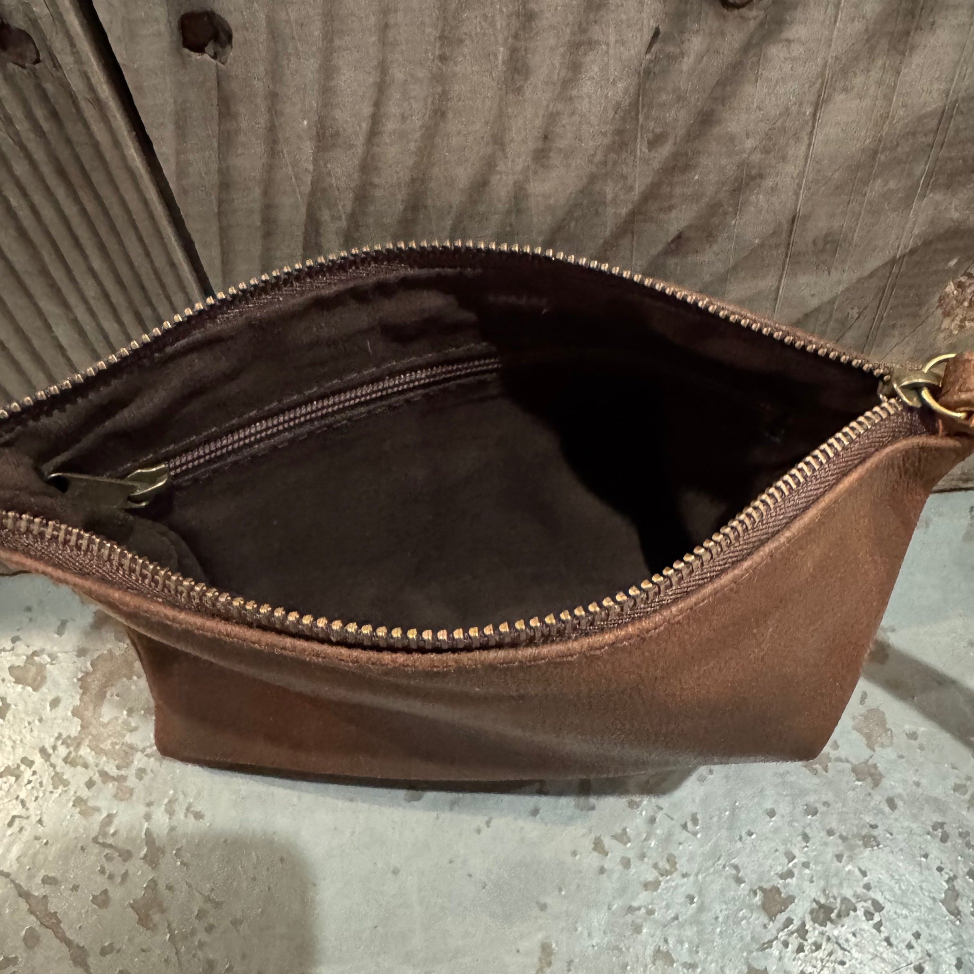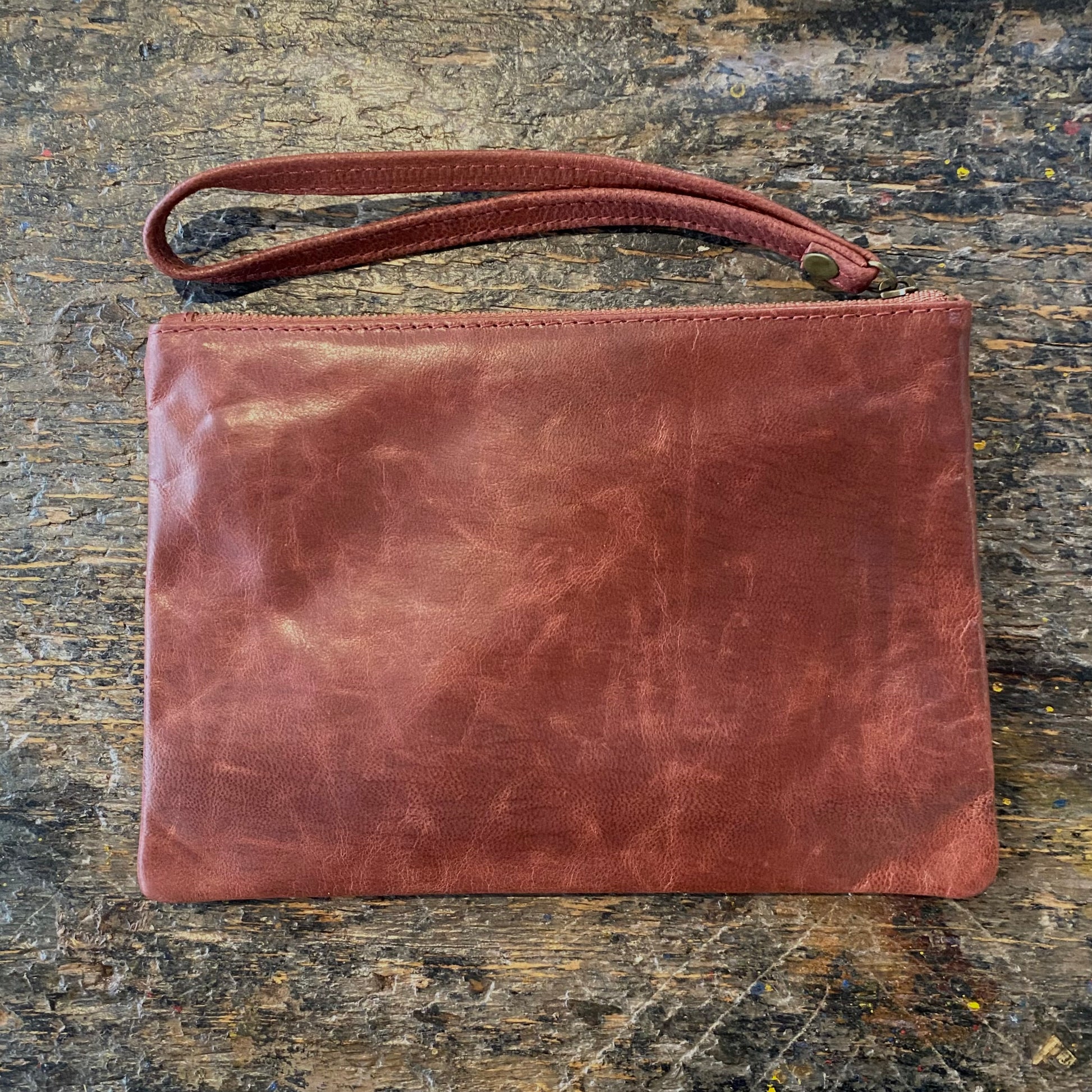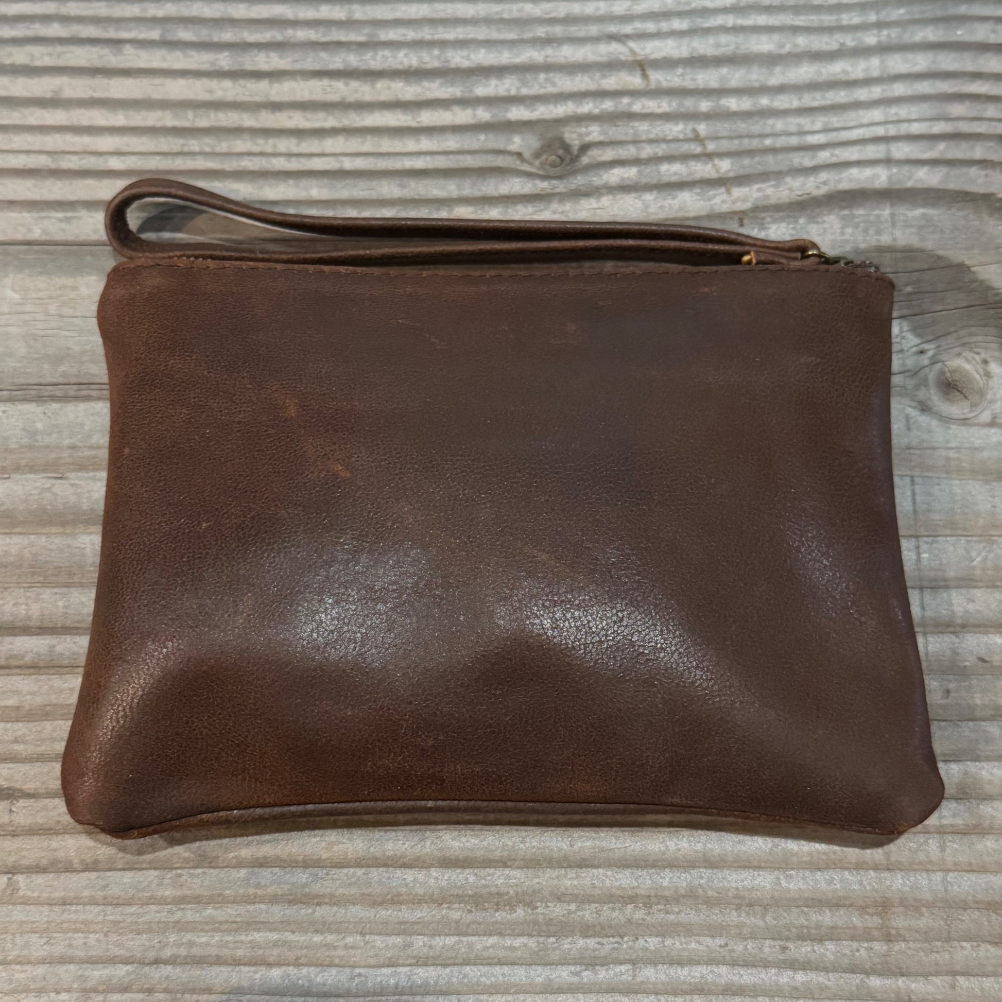 Antique Brass zippered opening with the leather wrist strap doubling as a zipper pull is a great feature.