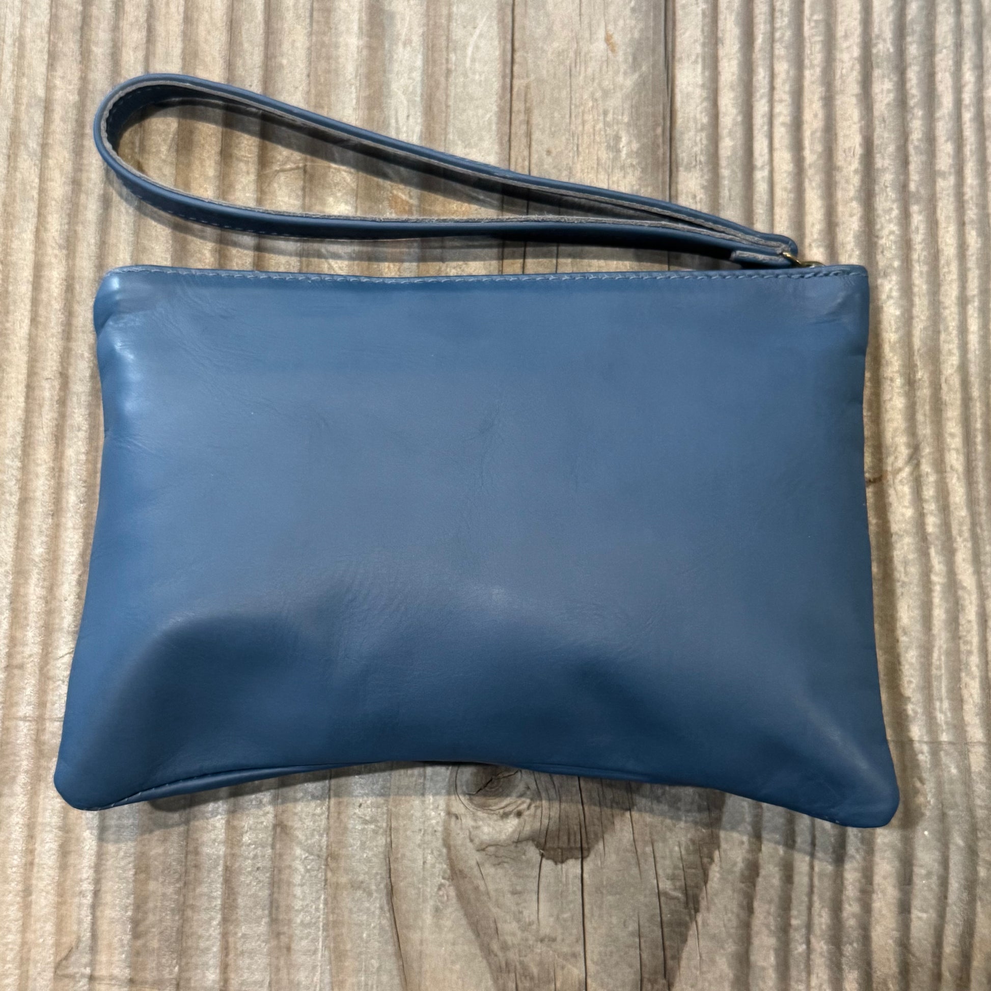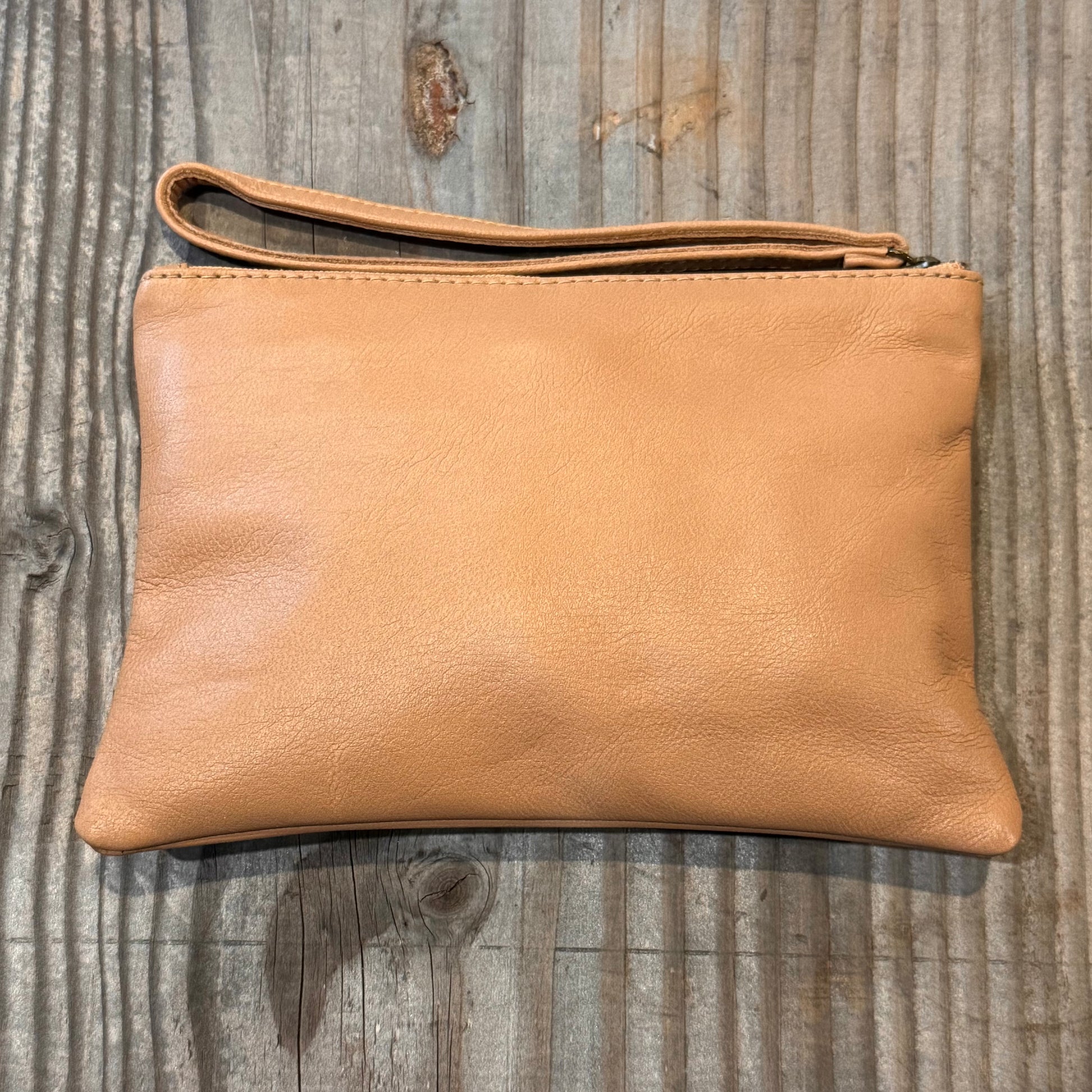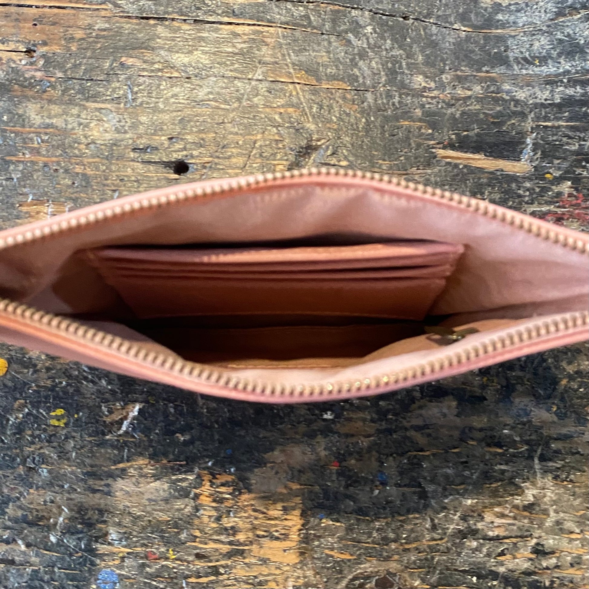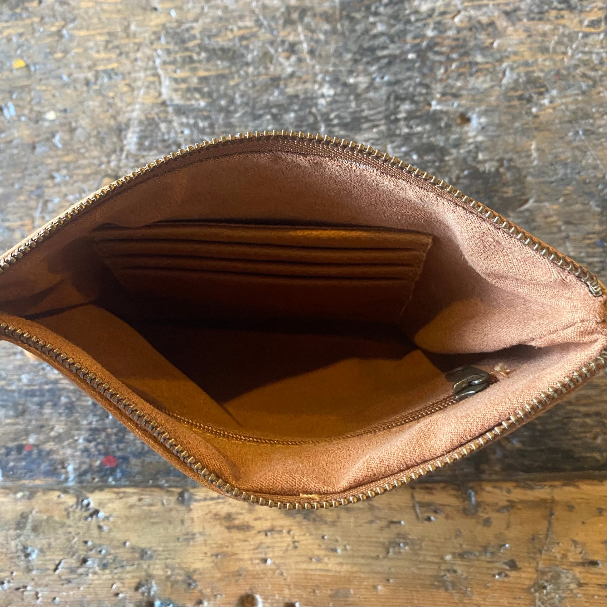 Antique Brass zippered opening with the leather wrist strap doubling as a zipper pull is a great feature.