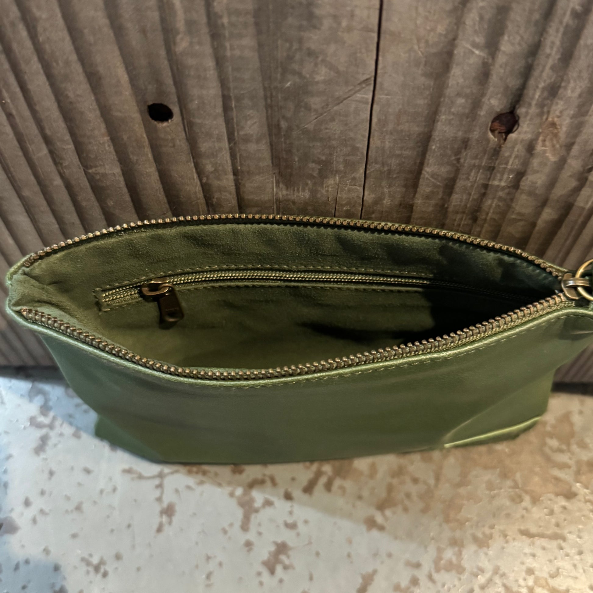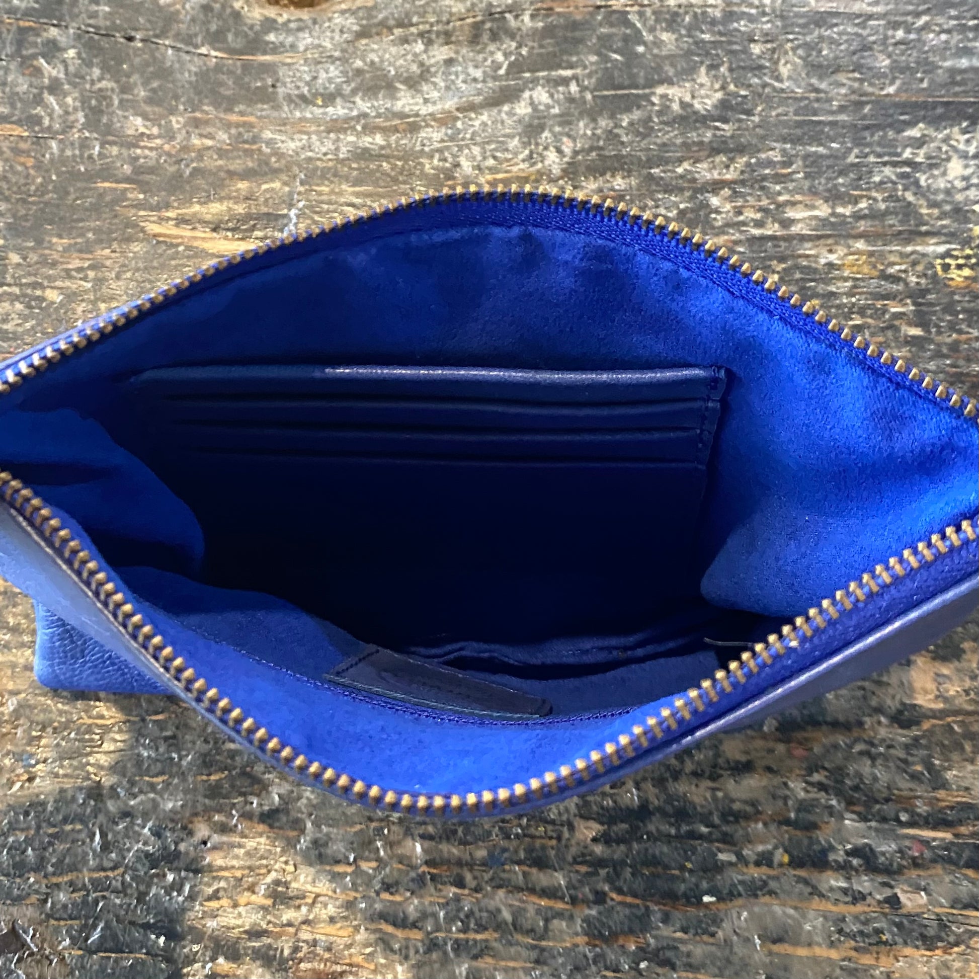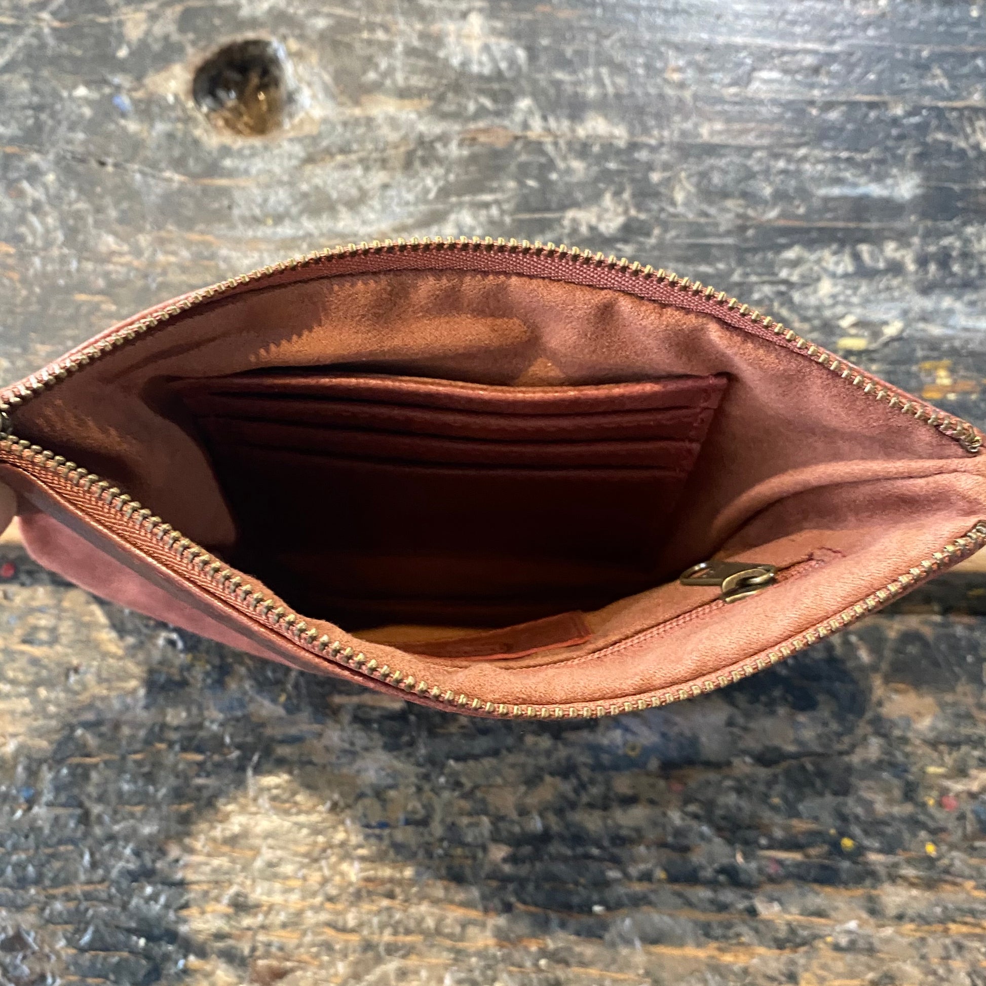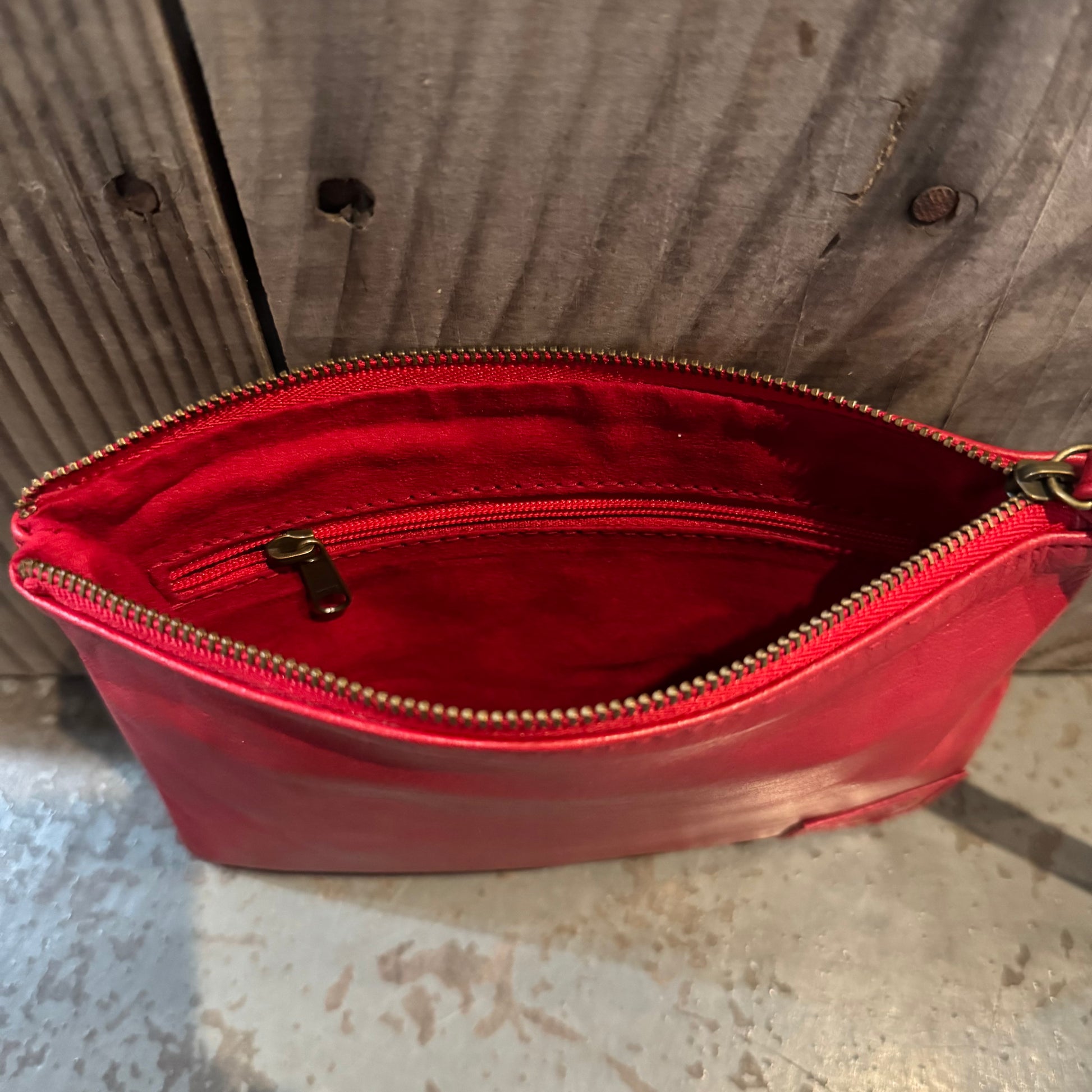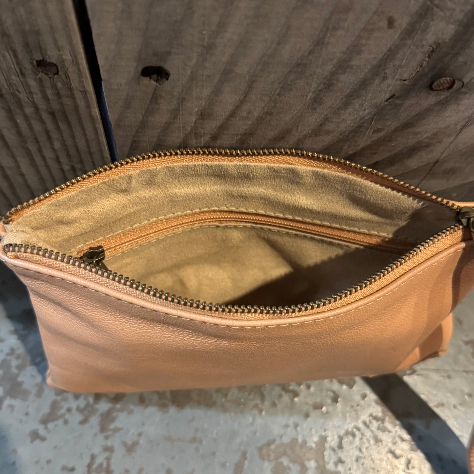 Antique Brass zippered opening with the leather wrist strap doubling as a zipper pull is a great feature.