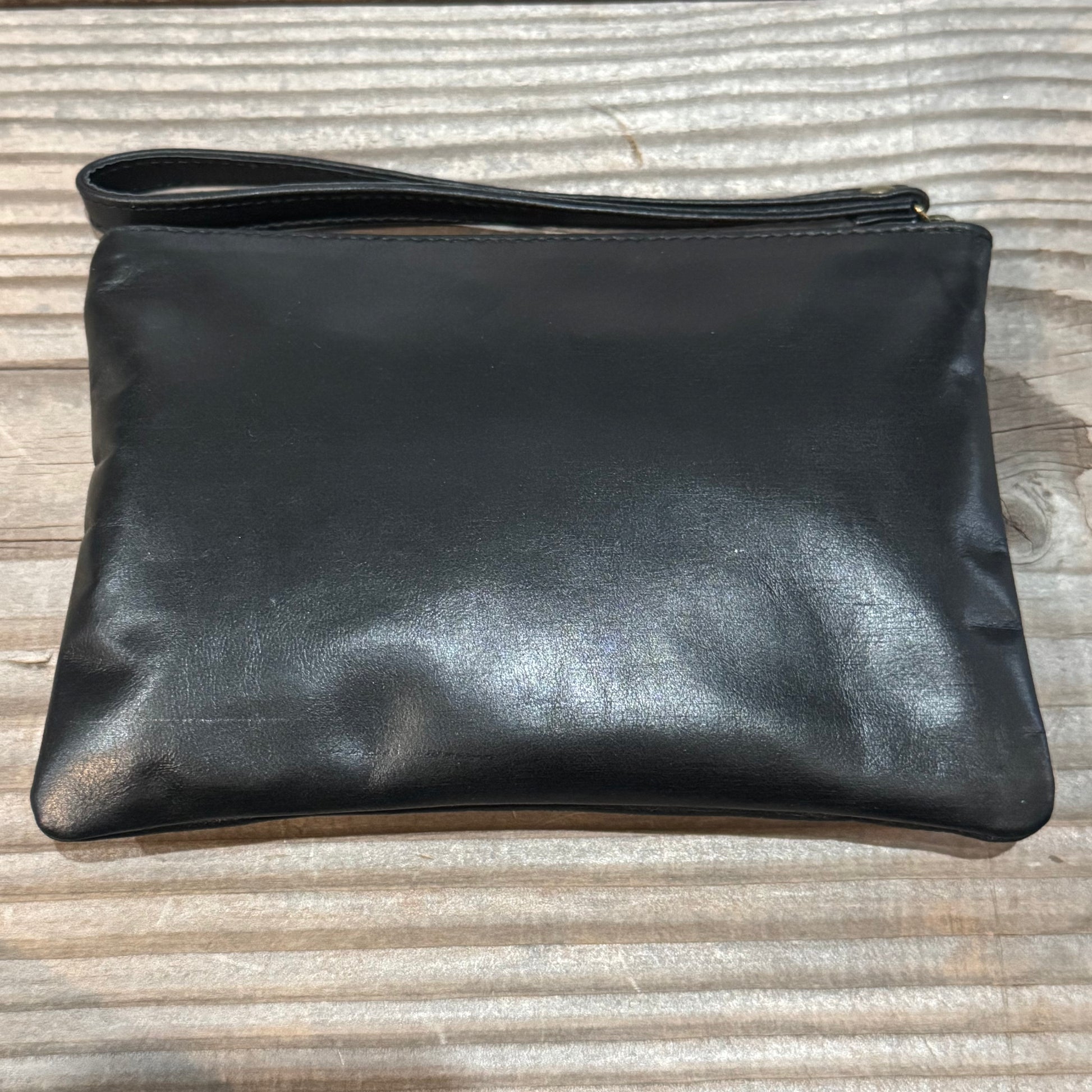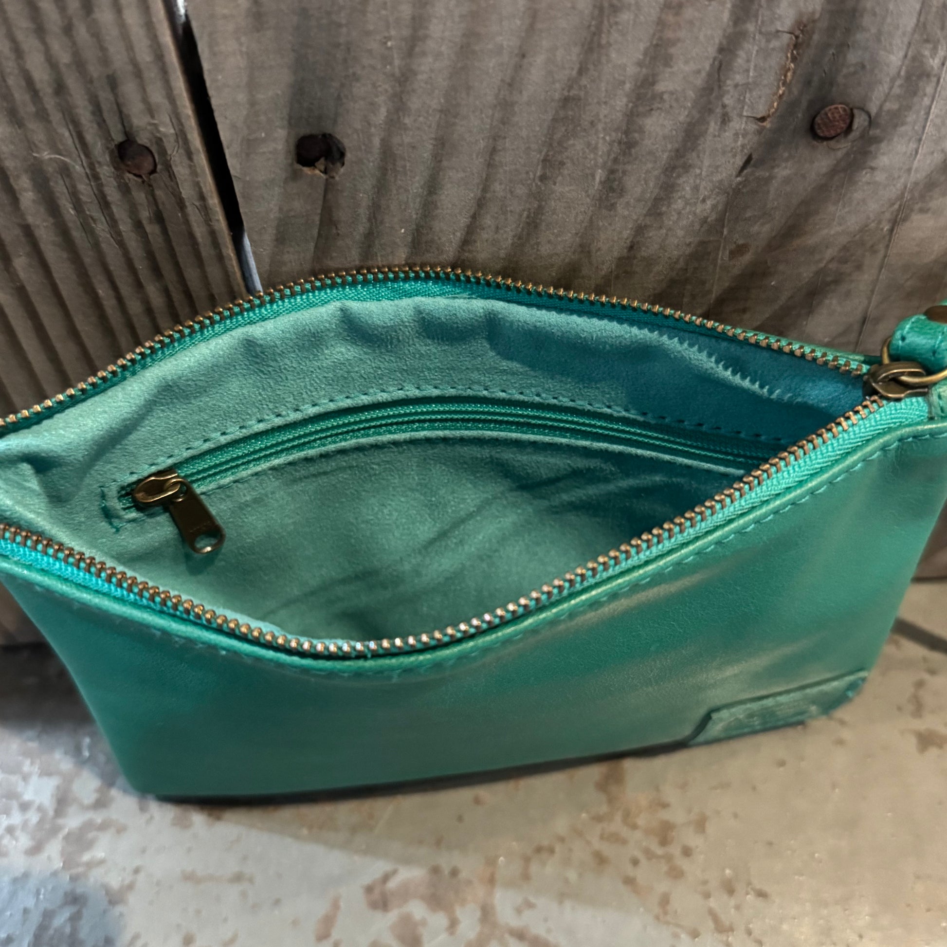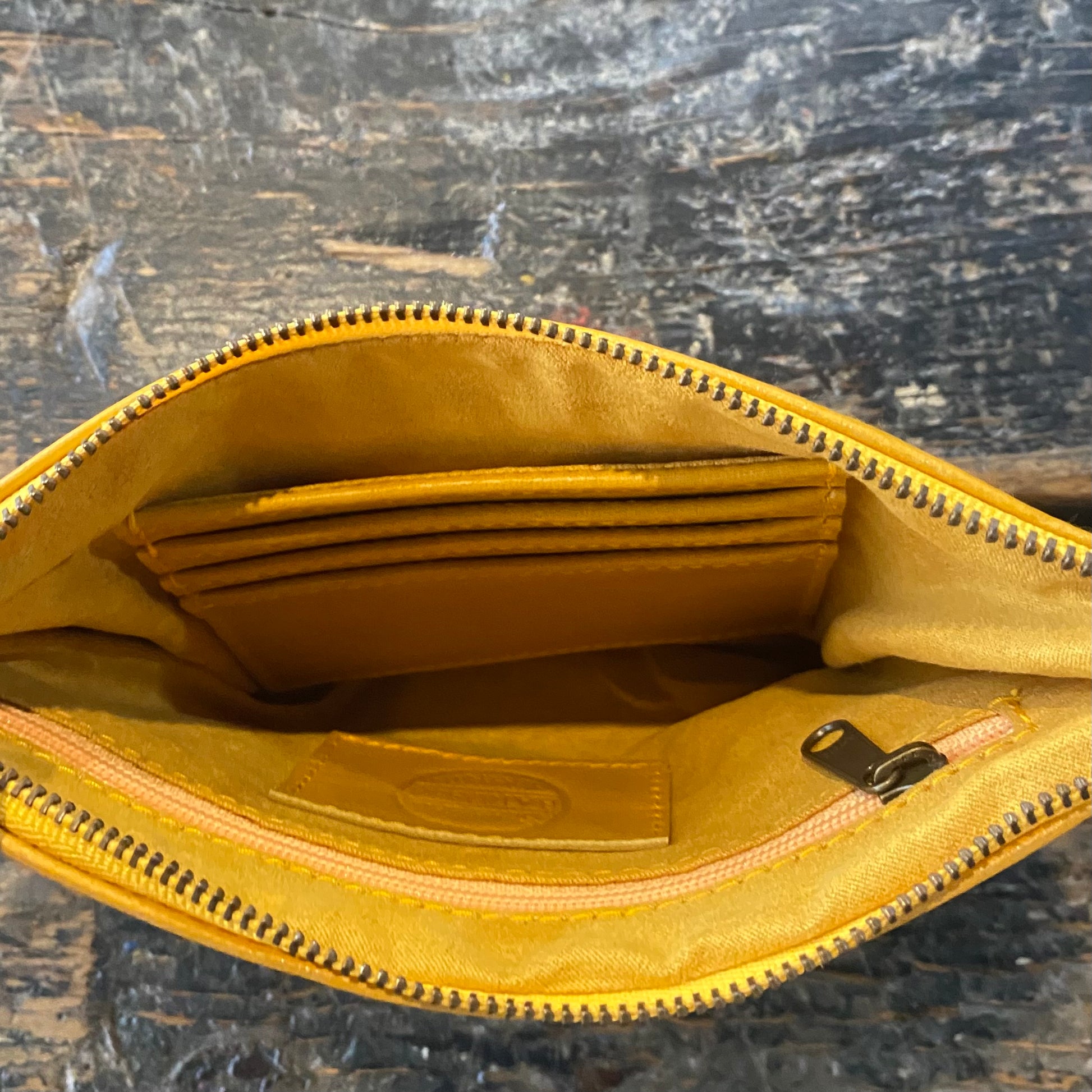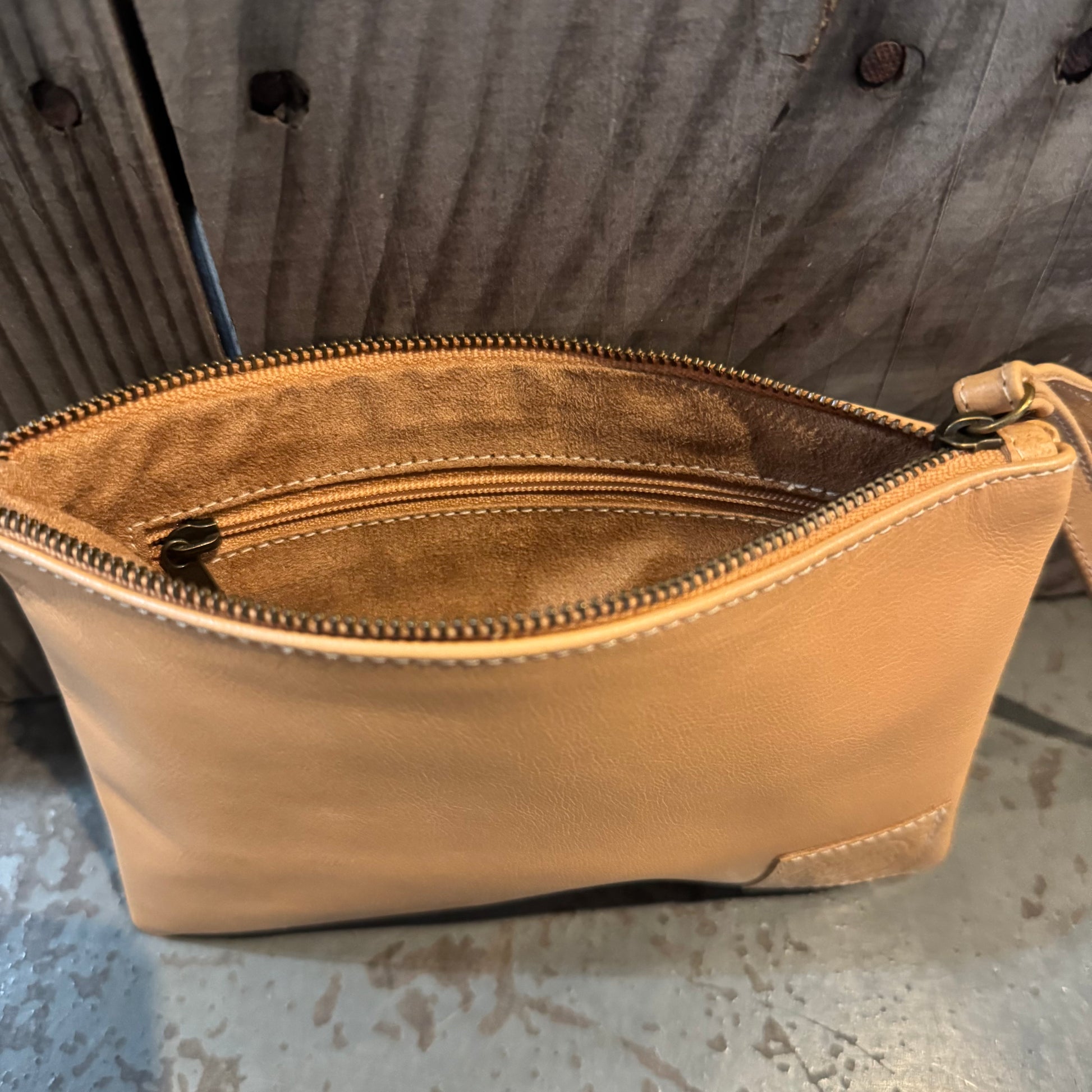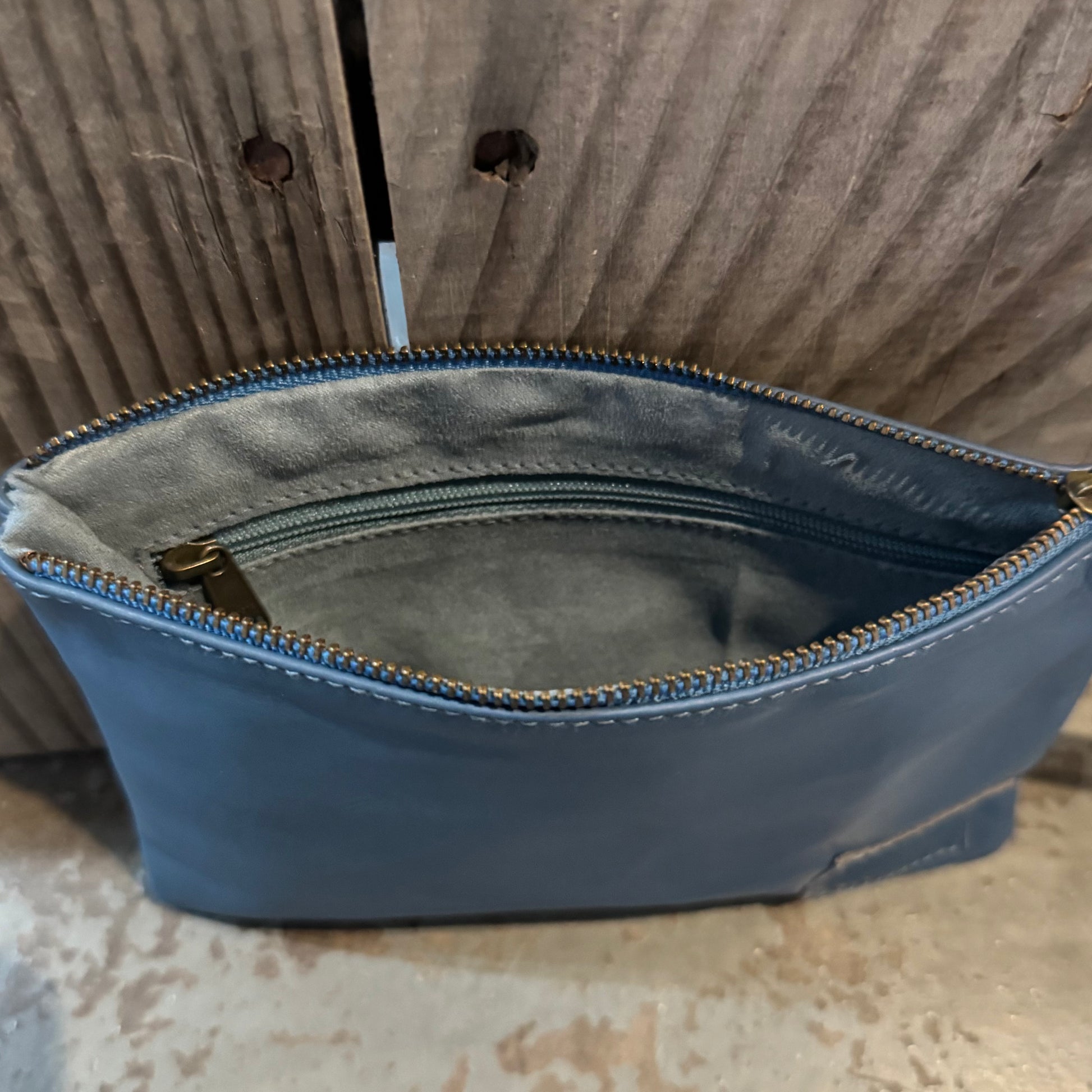 Antique Brass zippered opening with the leather wrist strap doubling as a zipper pull is a great feature.