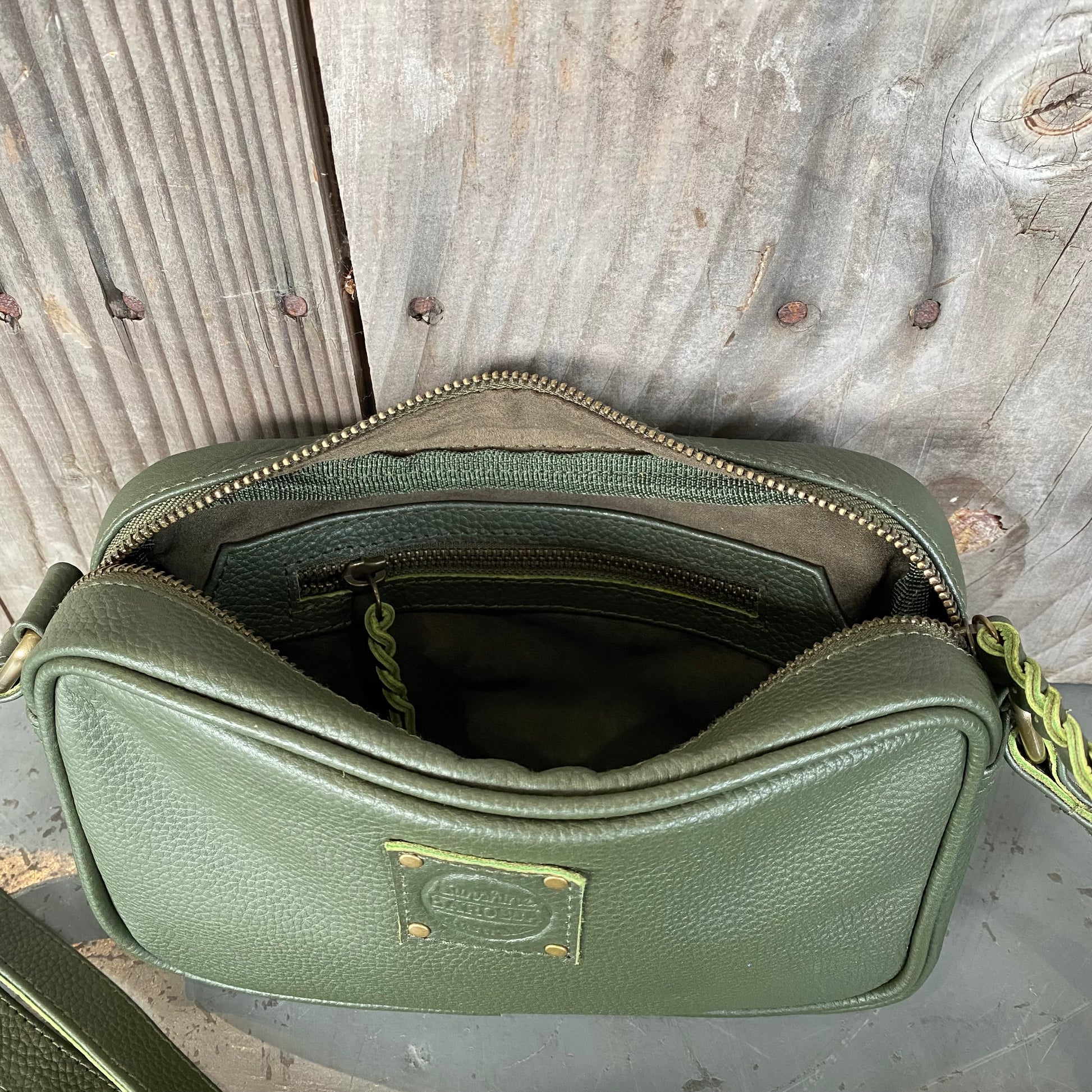 1. a large in size pouch with an adjustable long strap made from coloured leathers.