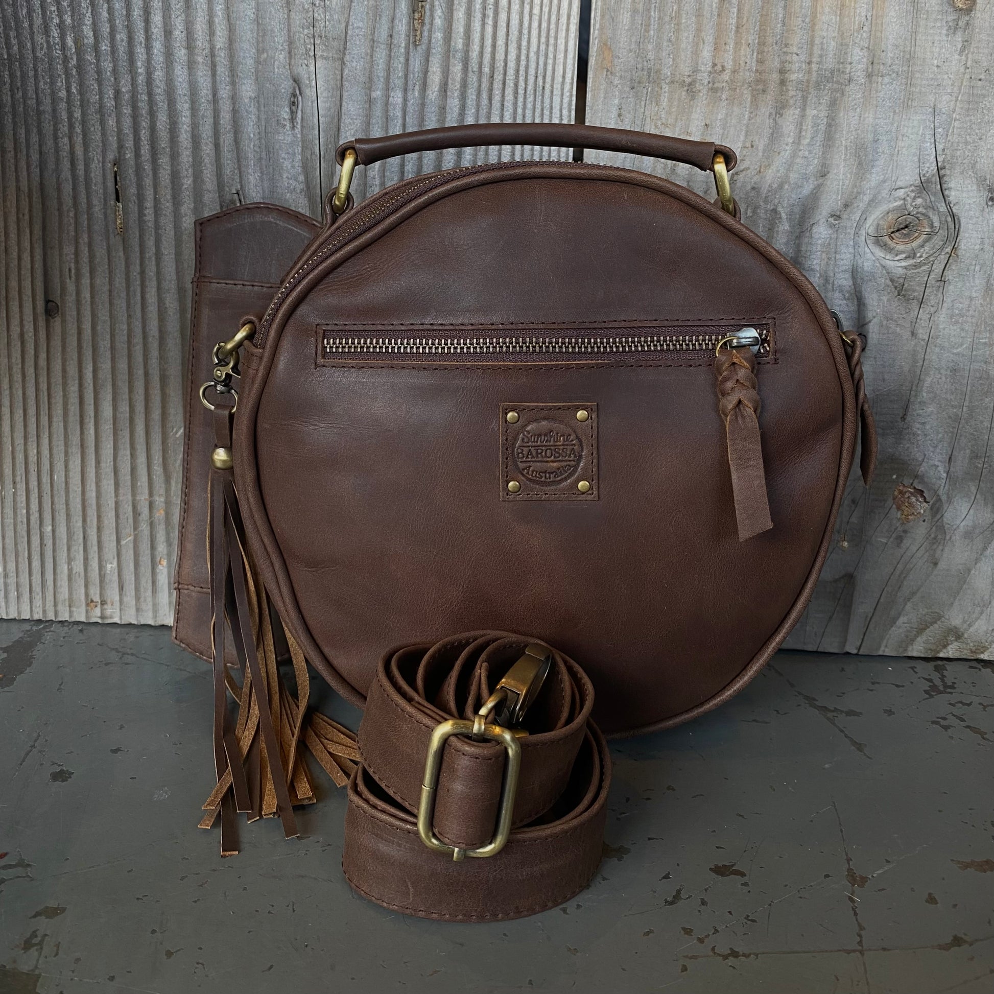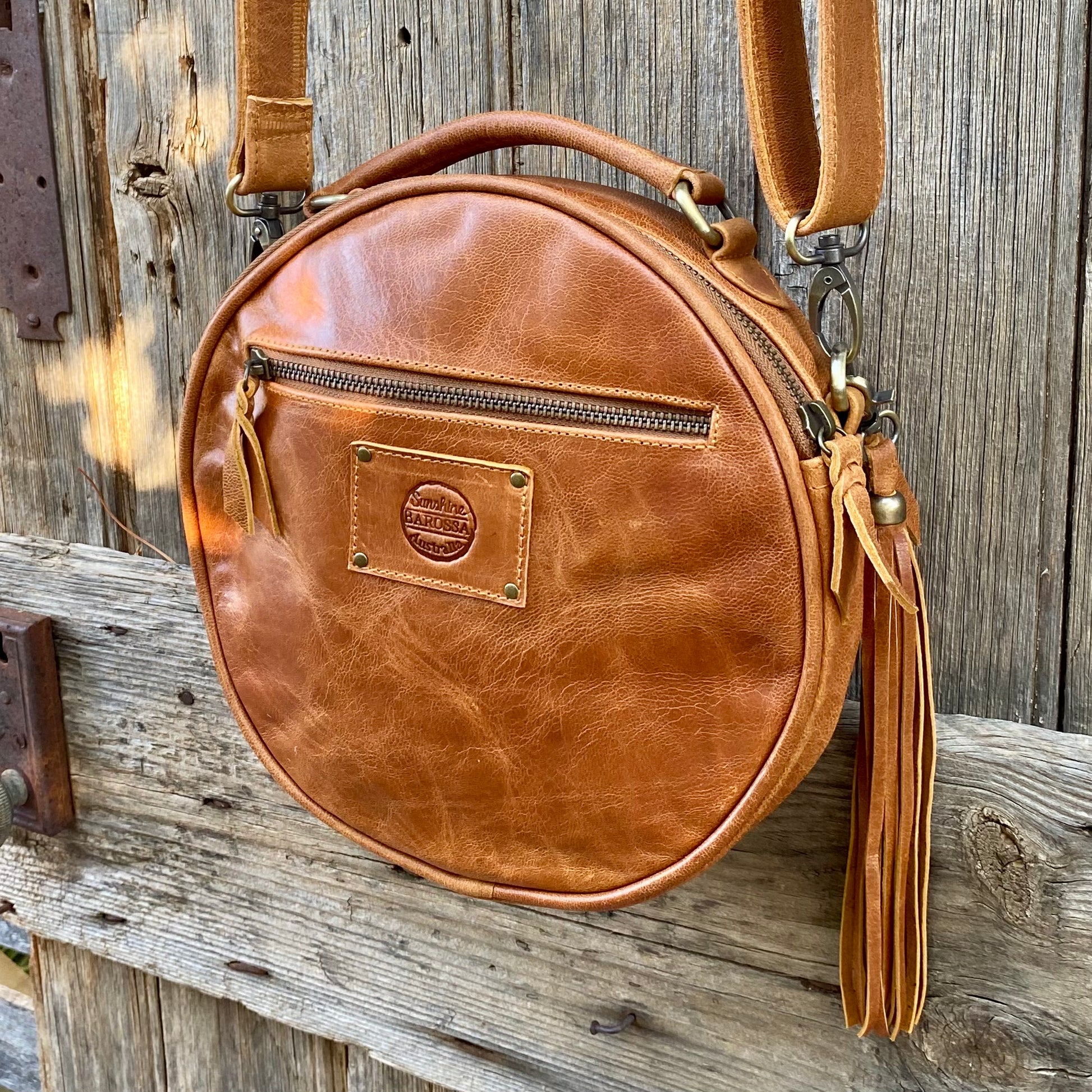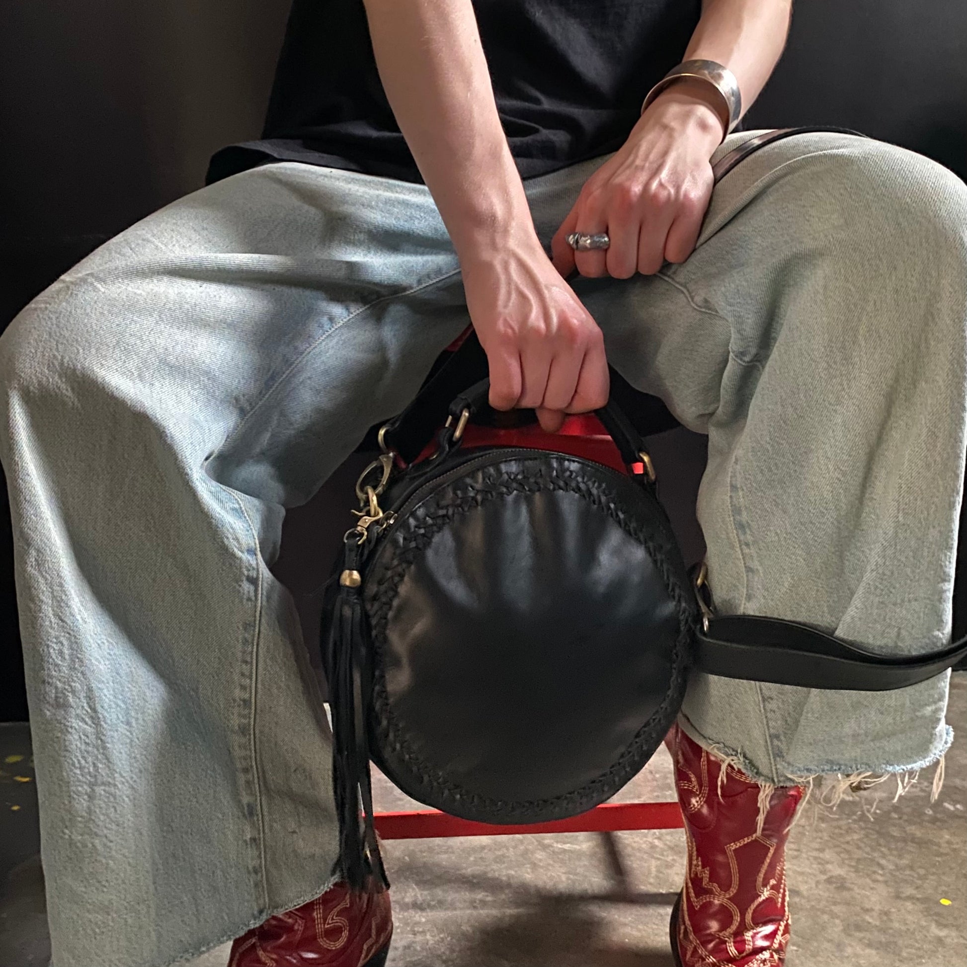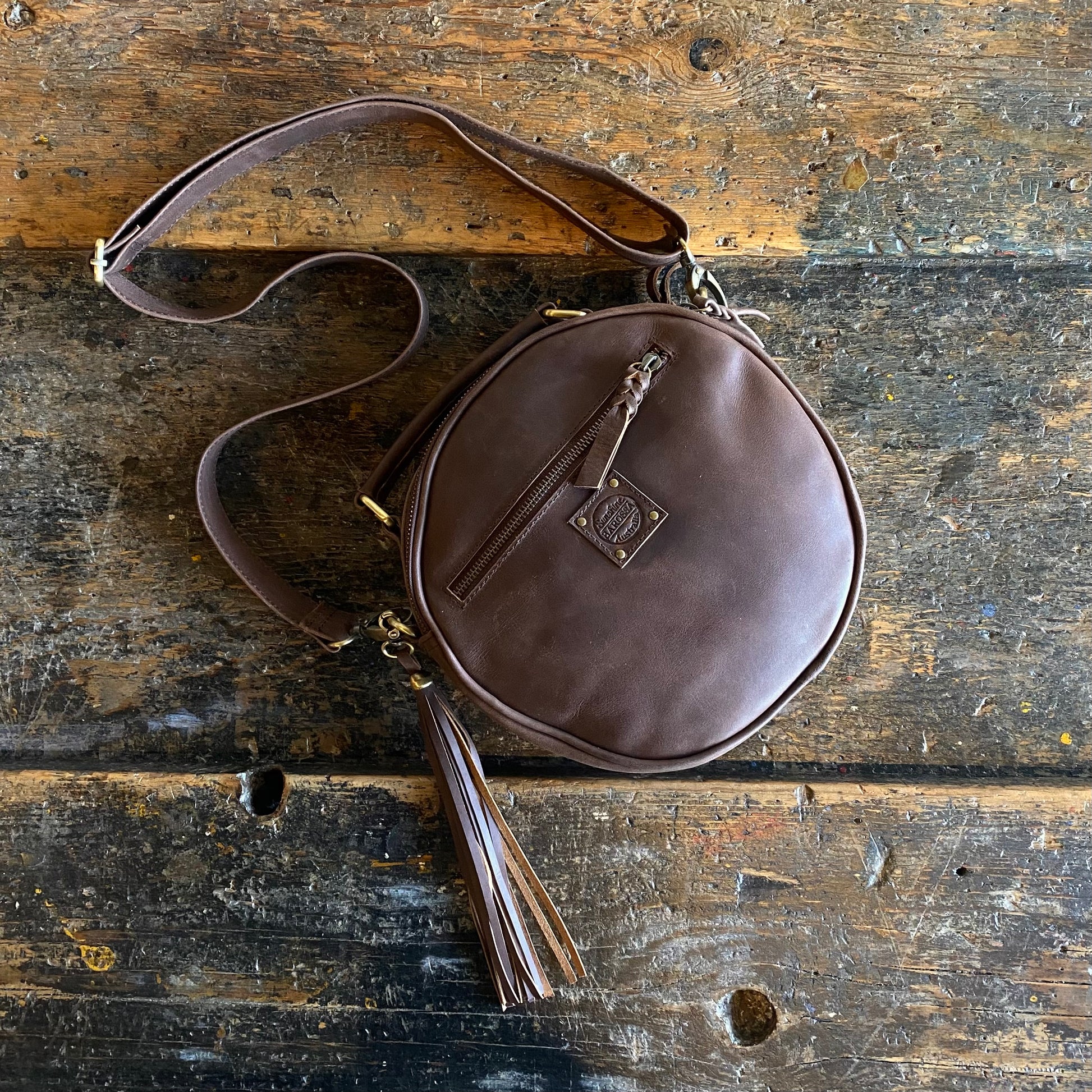 1. a leather handbag shaped like a circle or cylinder, disc-shaped, disc-like.