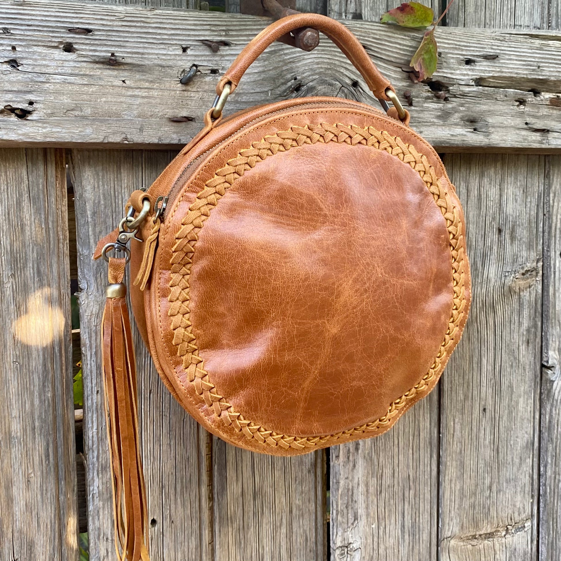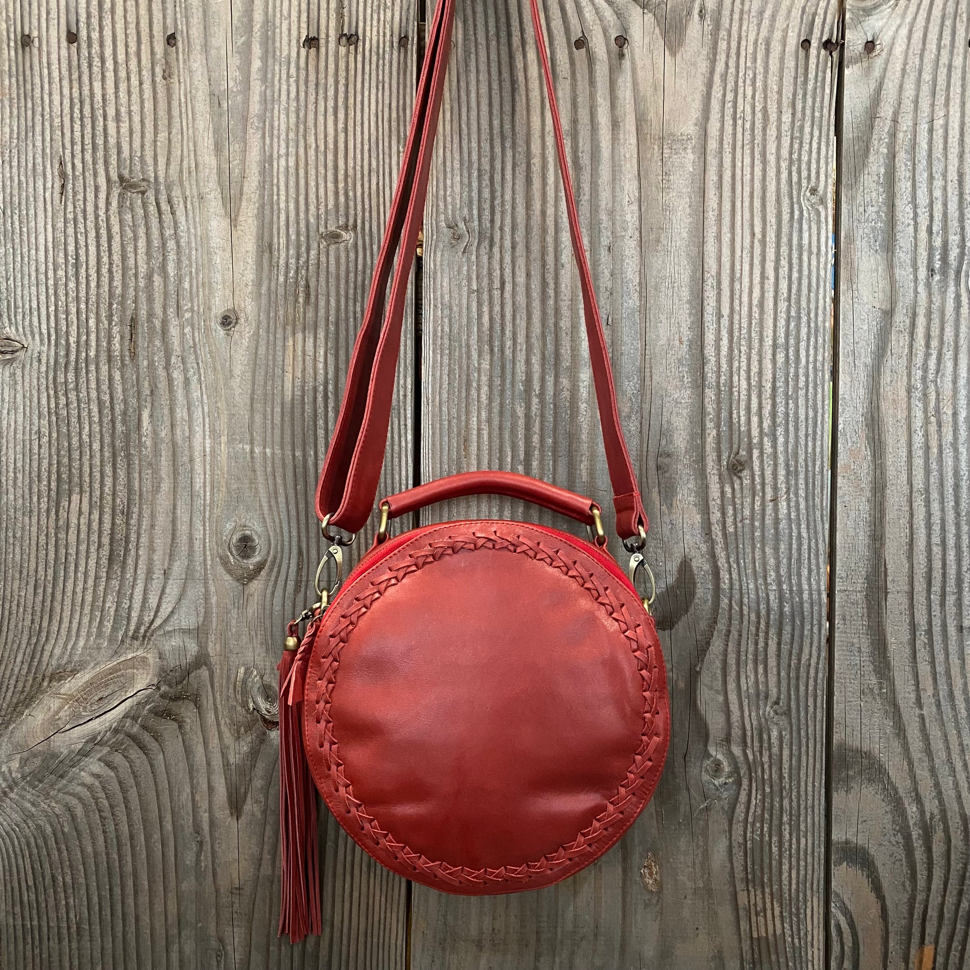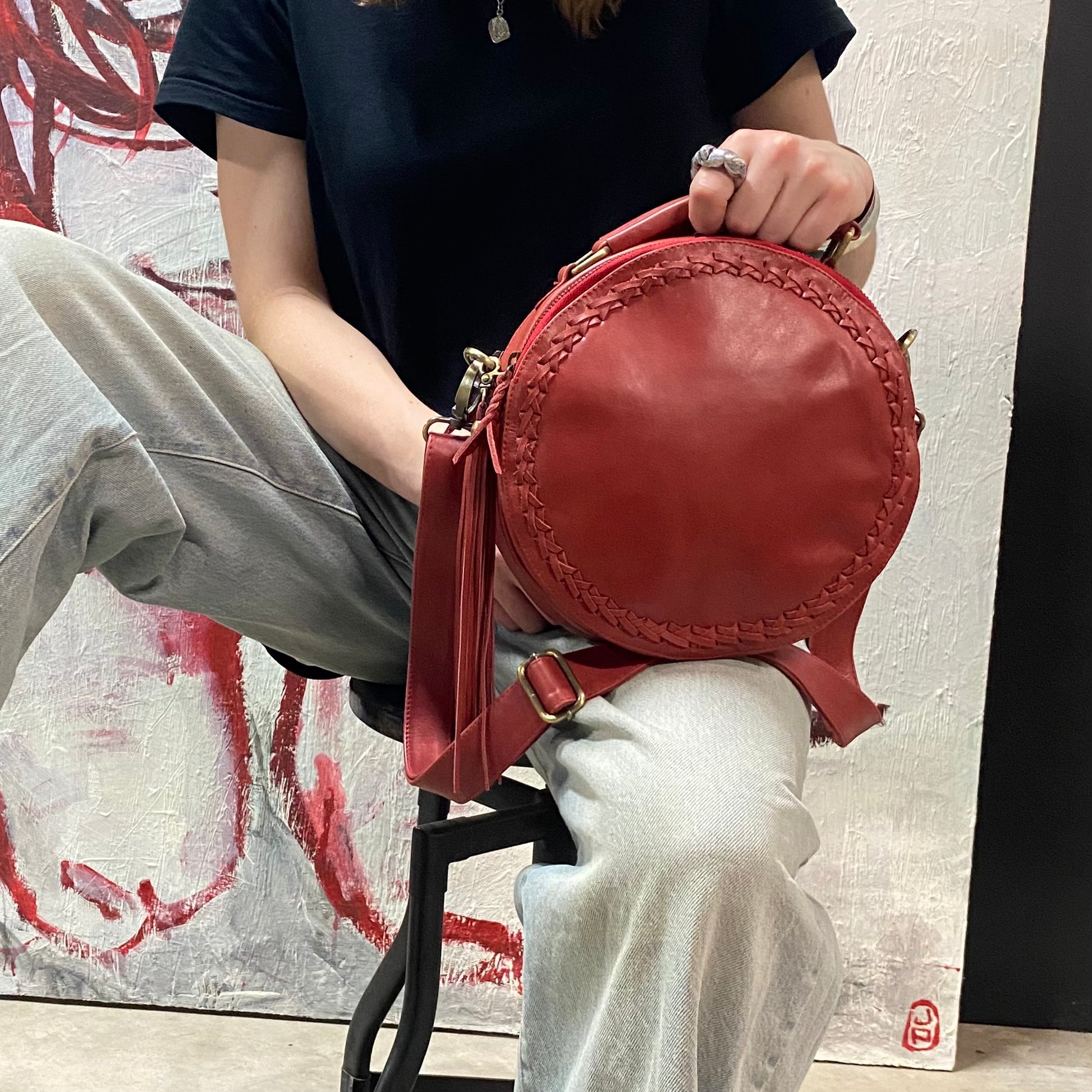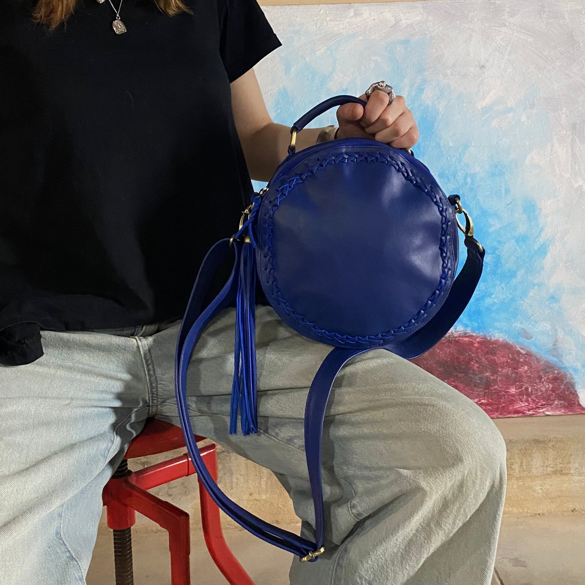 1. a leather handbag shaped like a circle or cylinder, disc-shaped, disc-like.