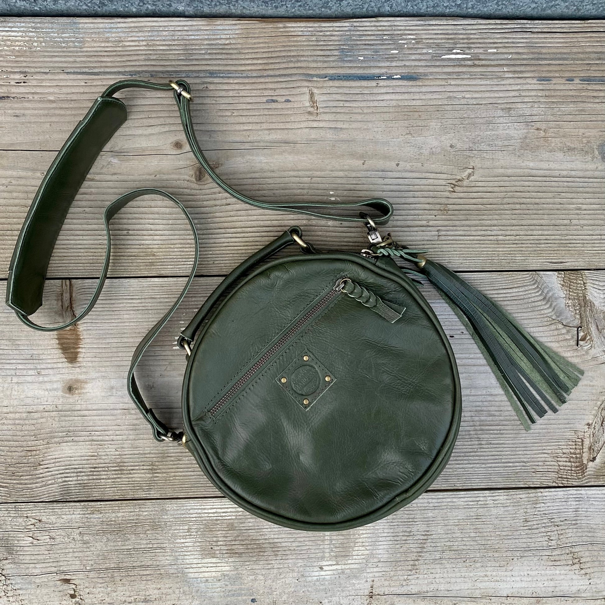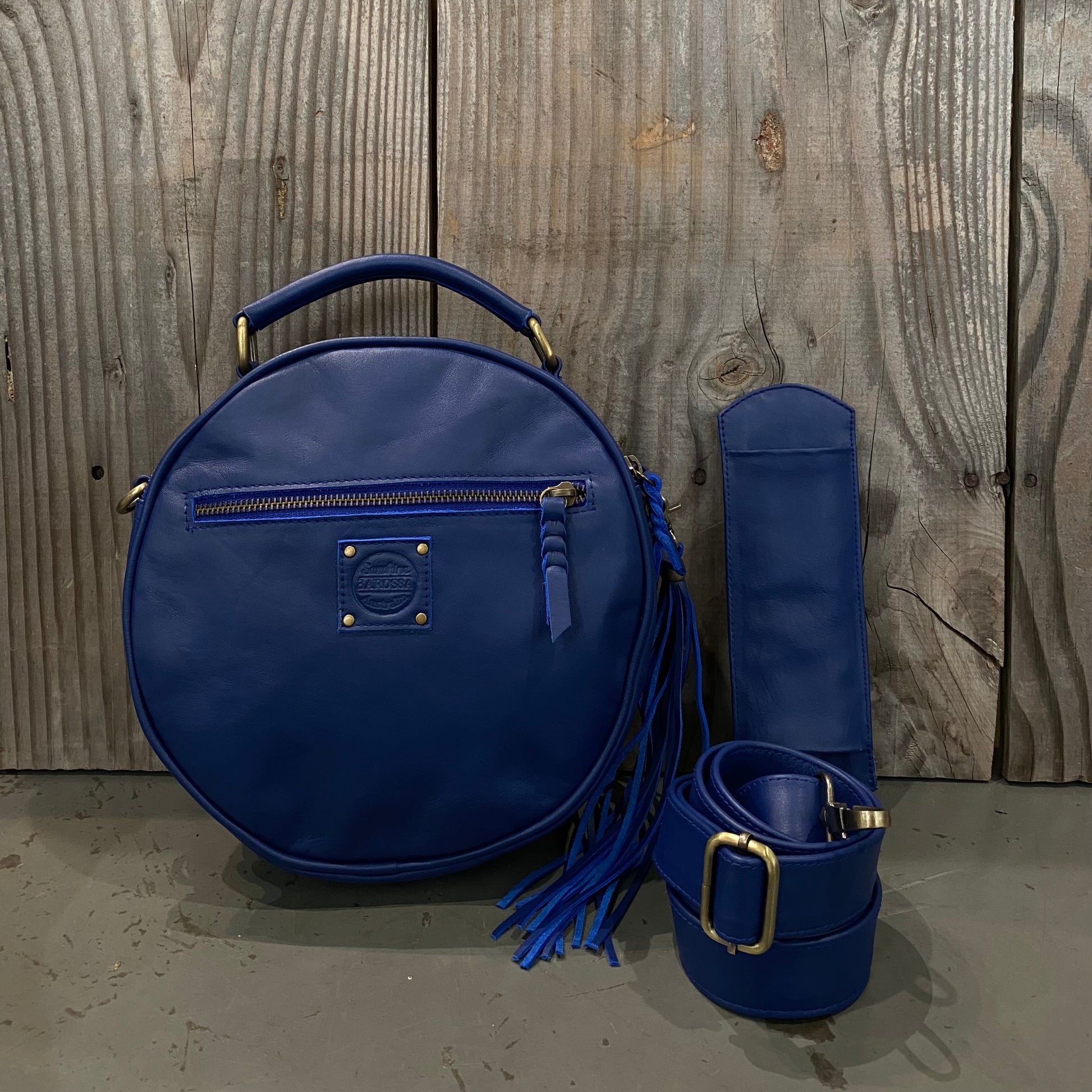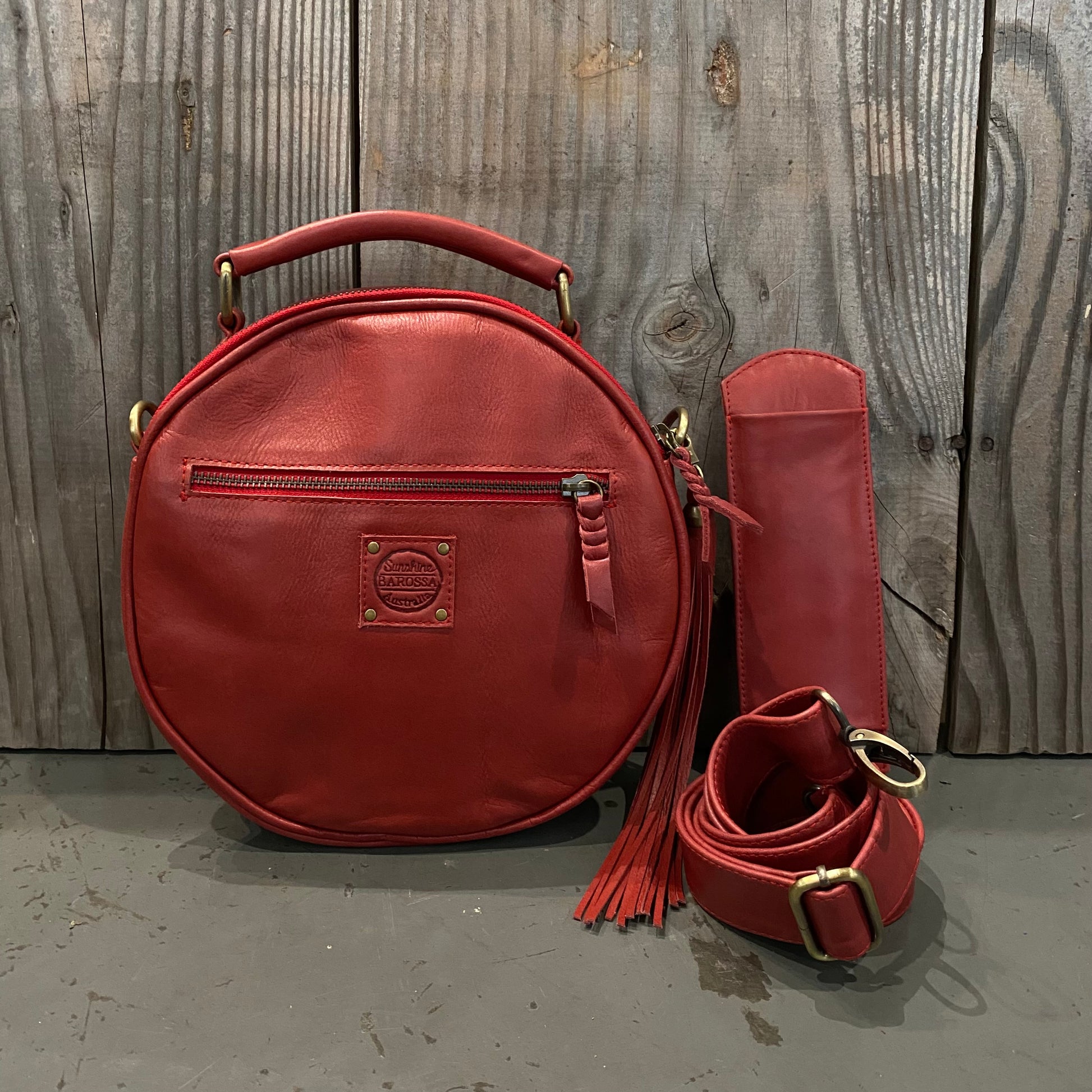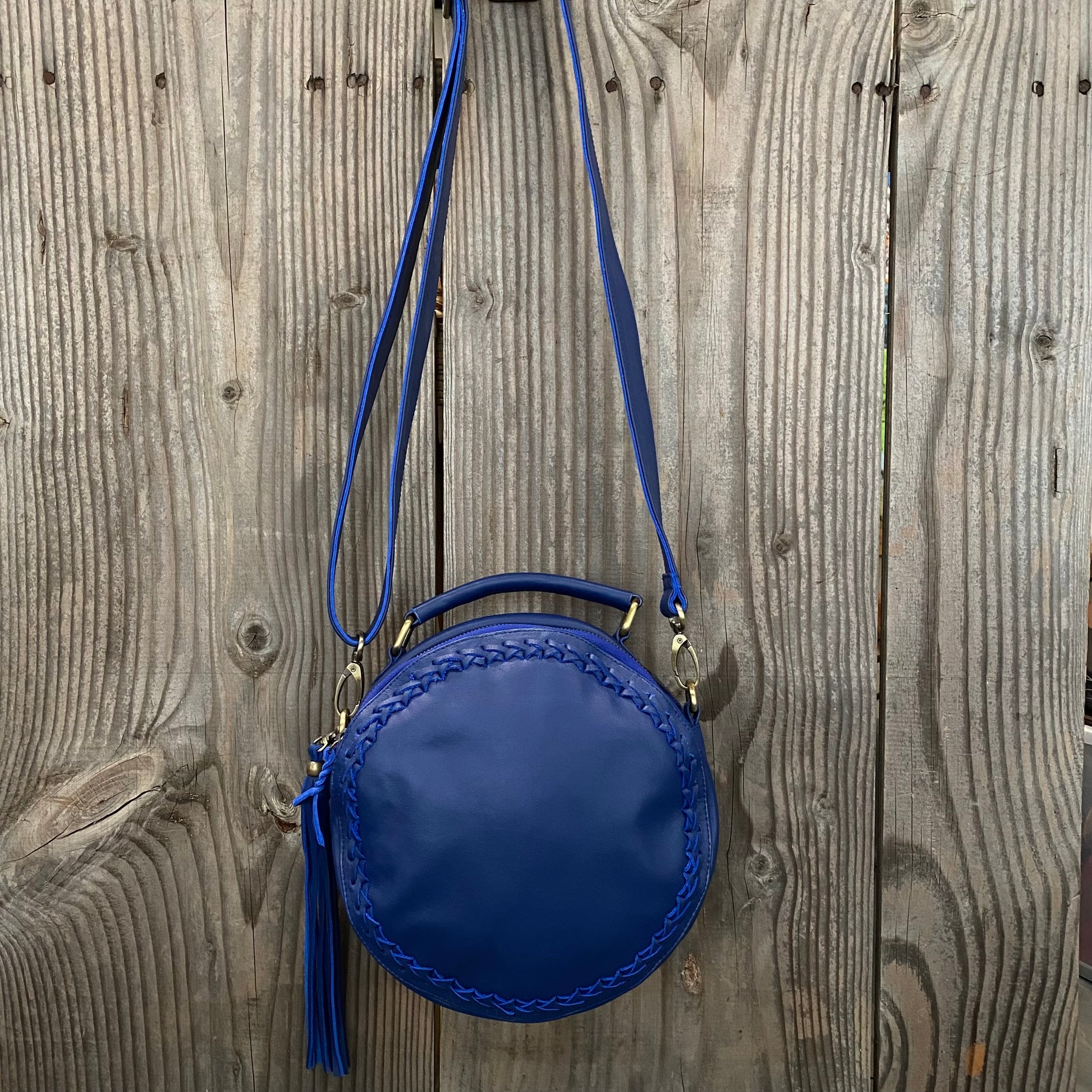 1. a leather handbag shaped like a circle or cylinder, disc-shaped, disc-like.