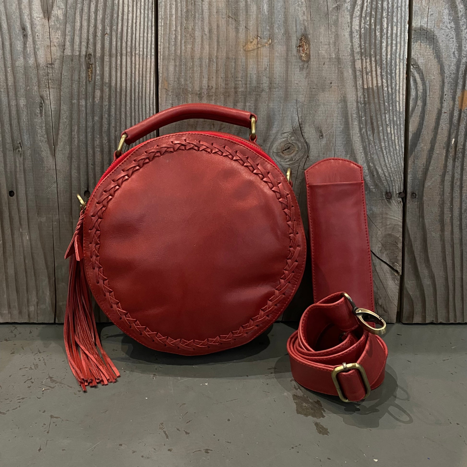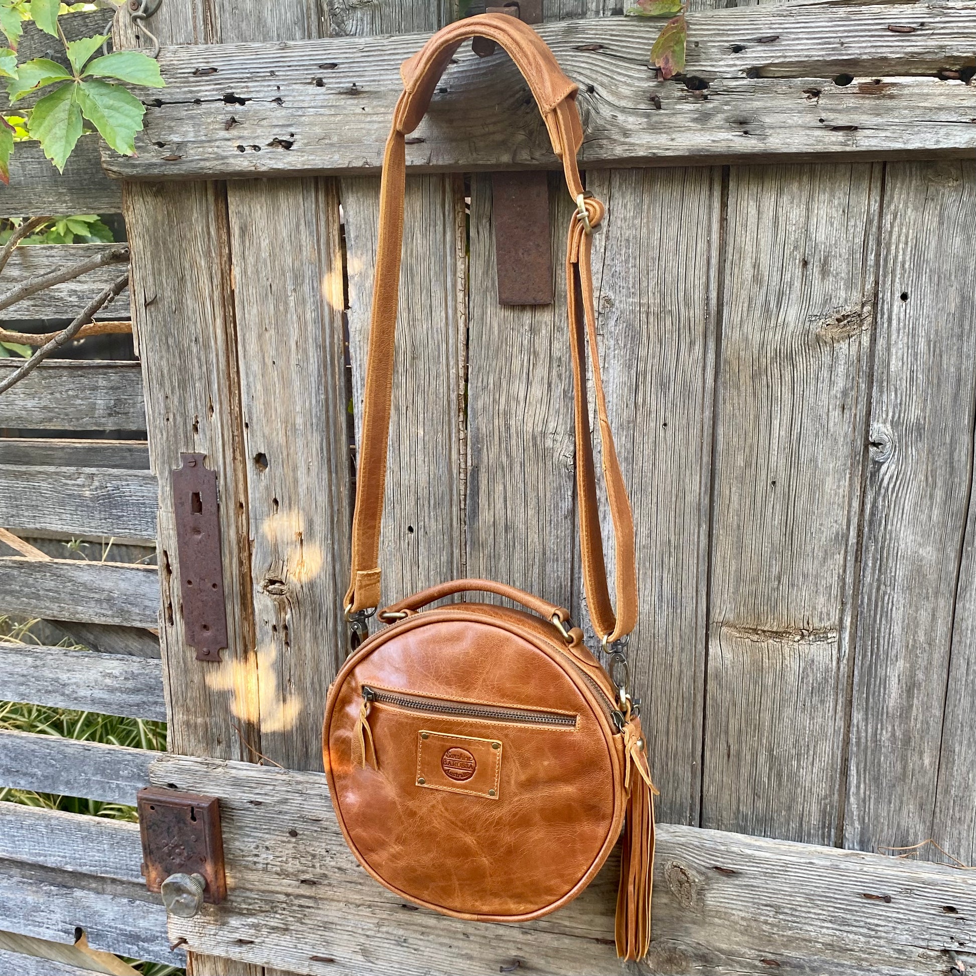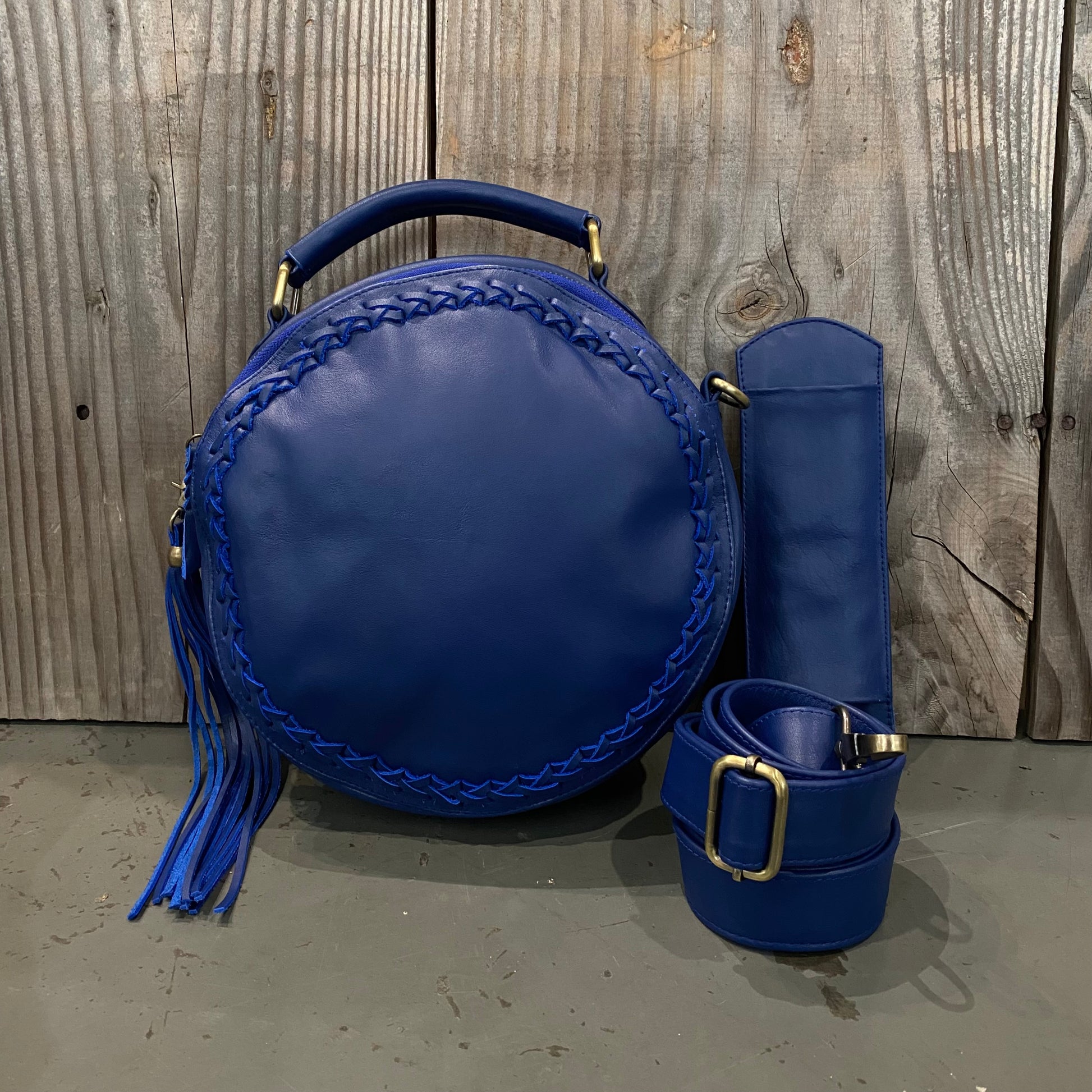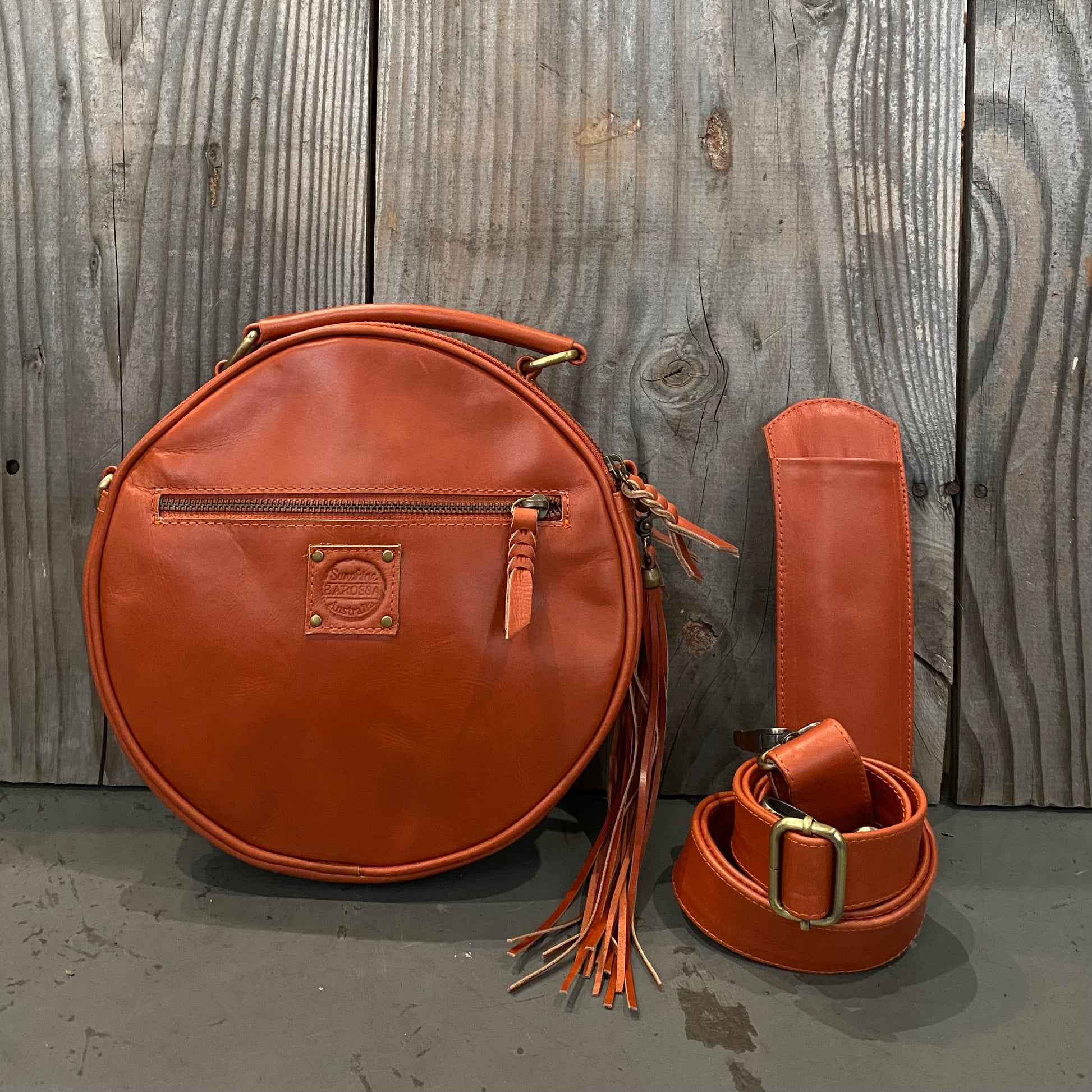 1. a leather handbag shaped like a circle or cylinder, disc-shaped, disc-like.