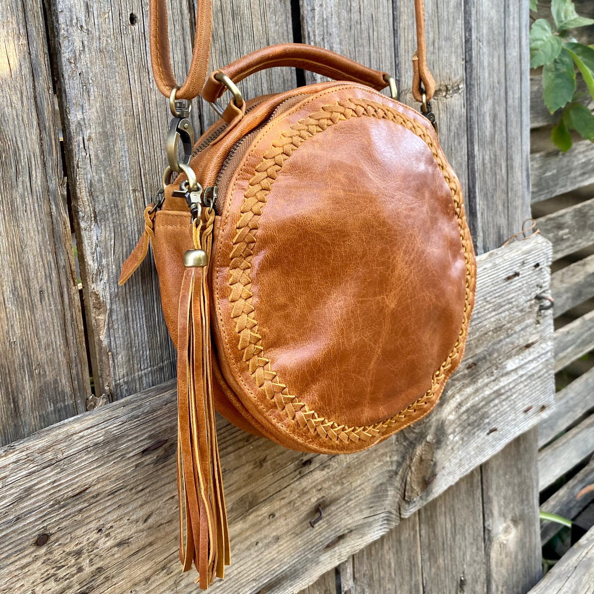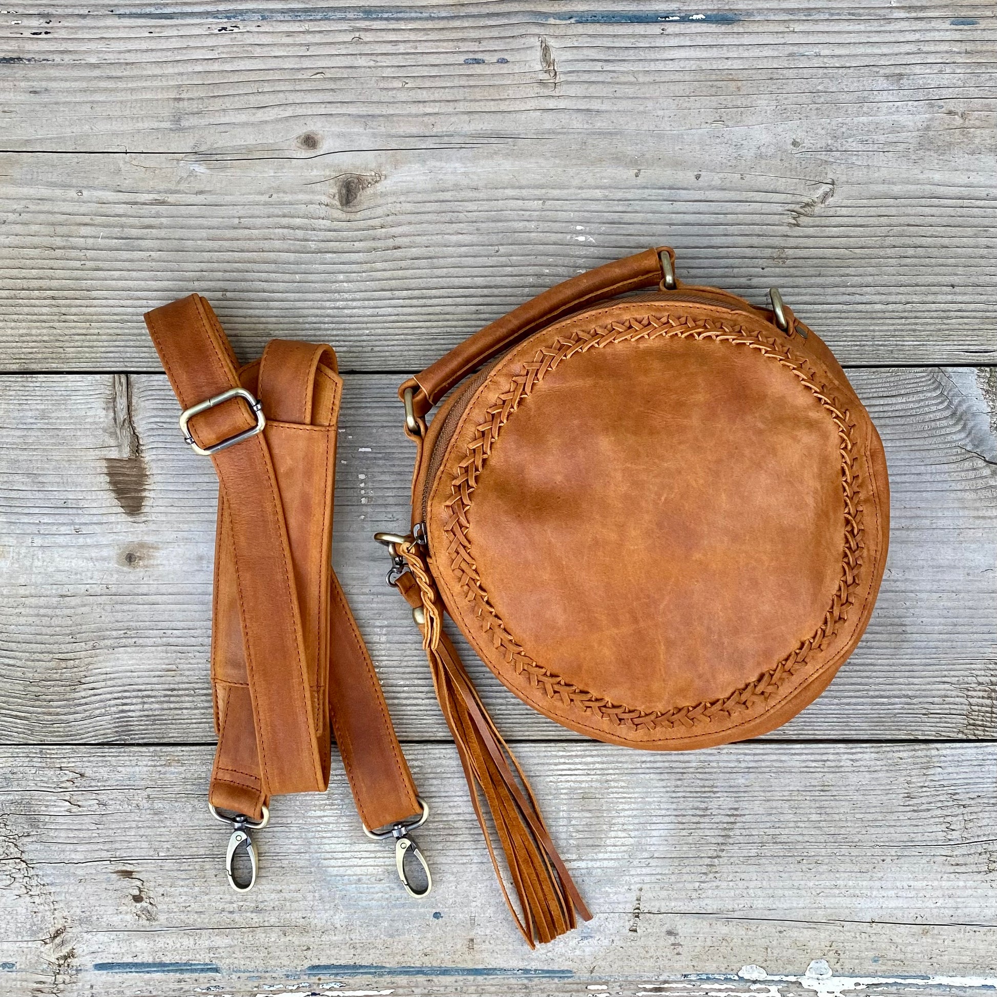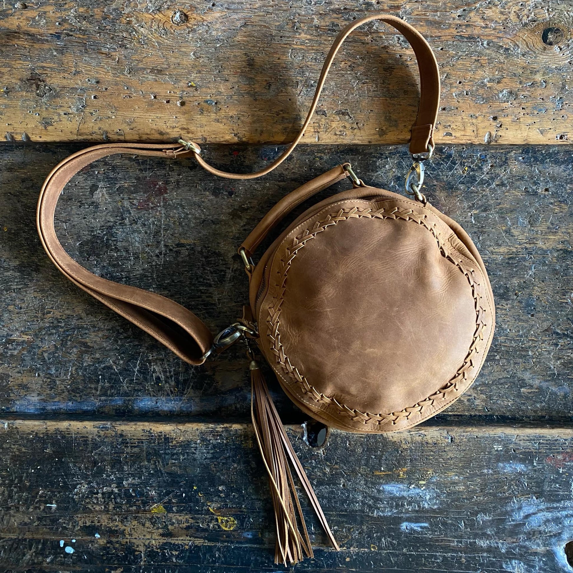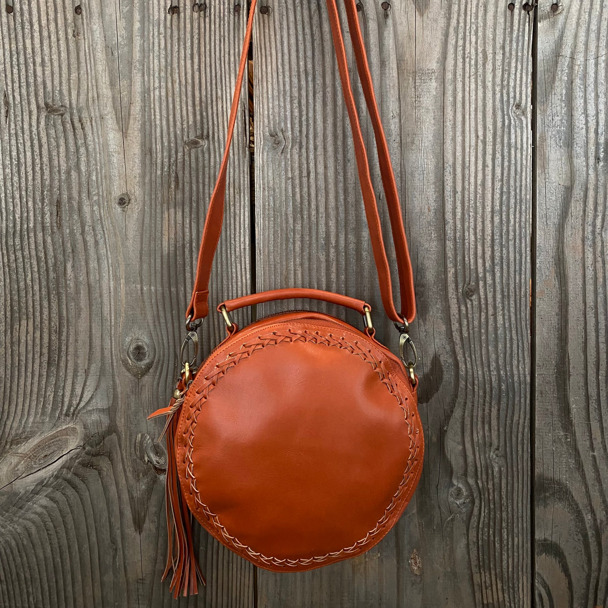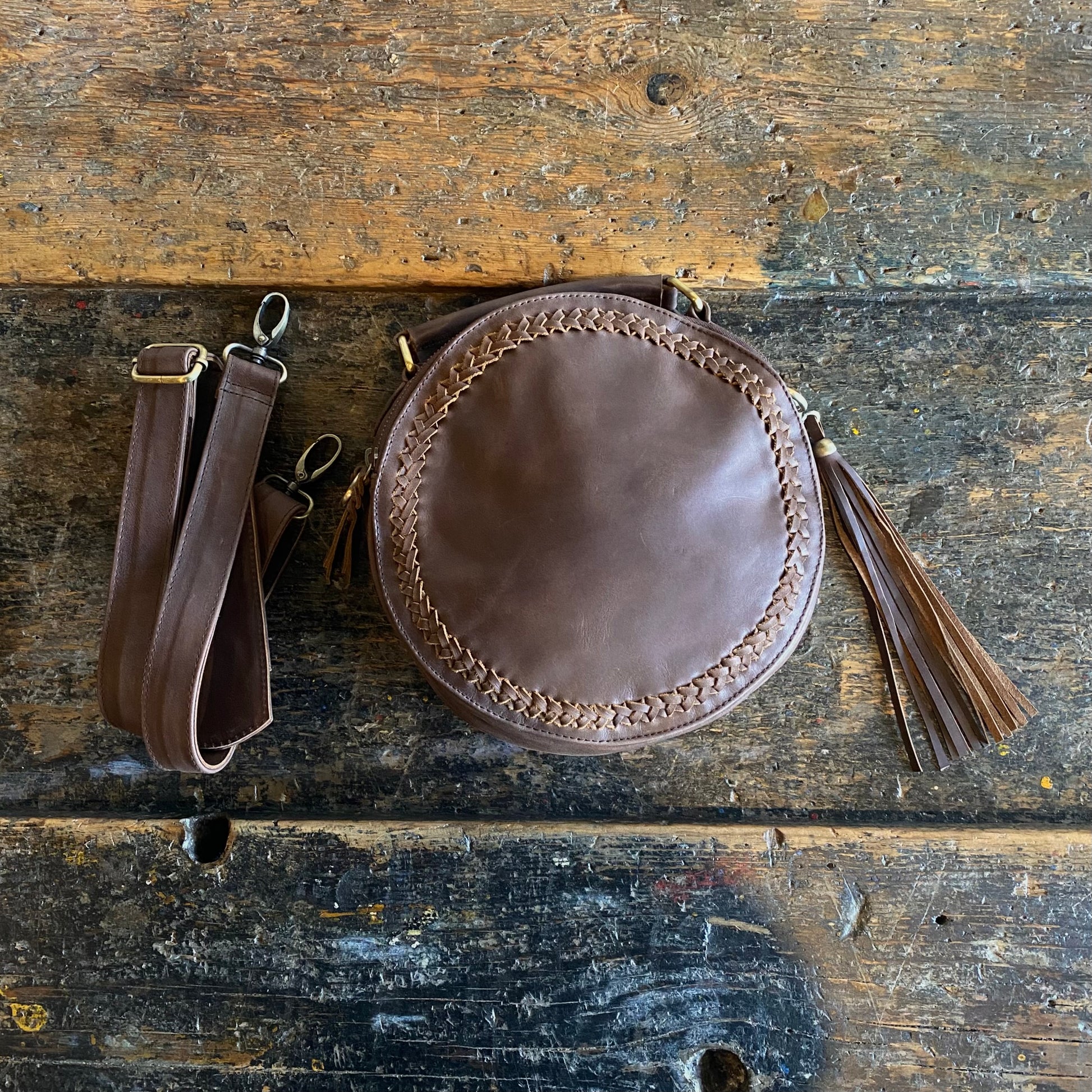 The Leather Round bag is a stunning, elegant yet classic design with its beautiful plain leather front and criss-cross leather stitching around the edge. Making this a definite head-turner with any outfit.