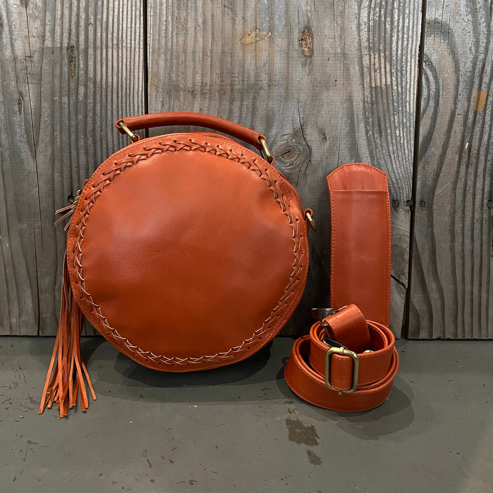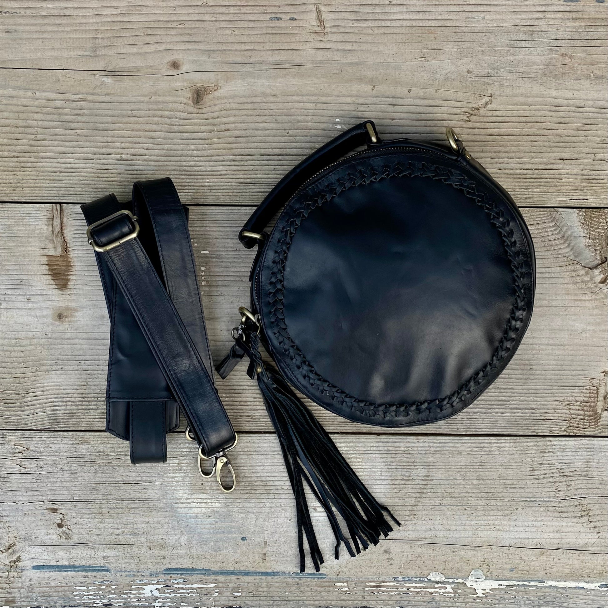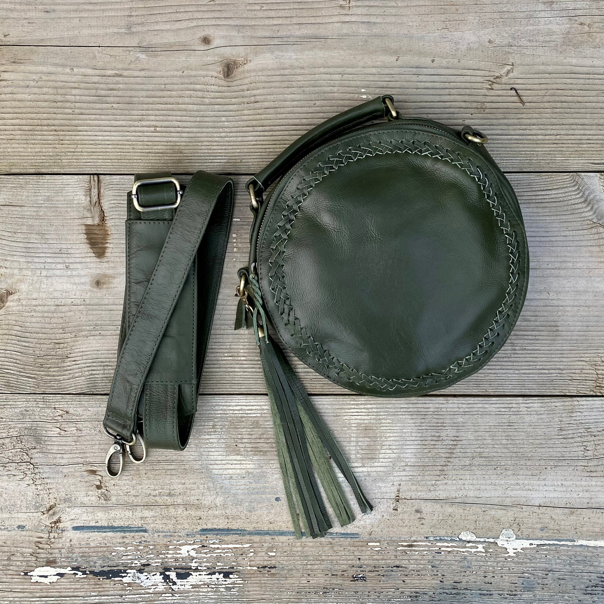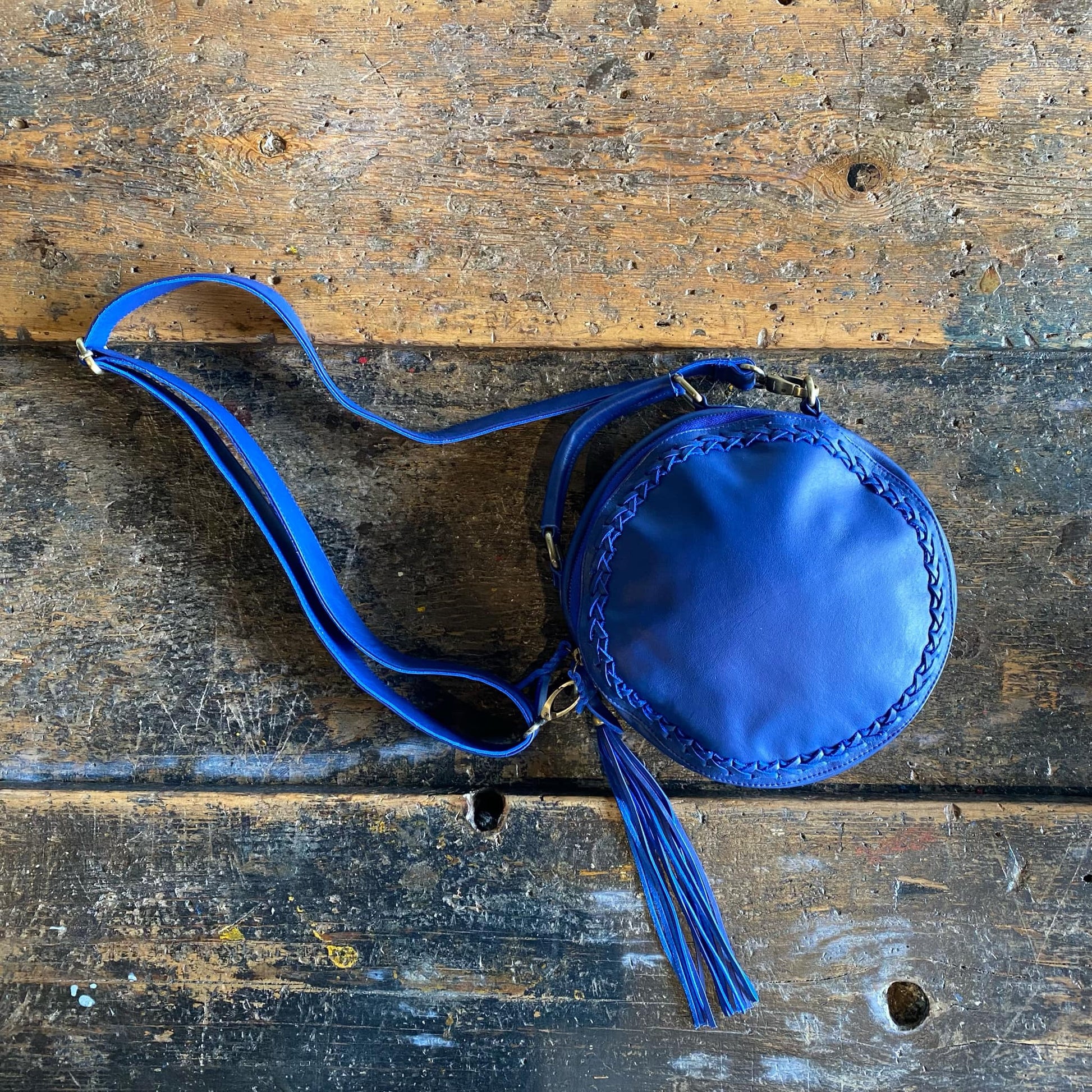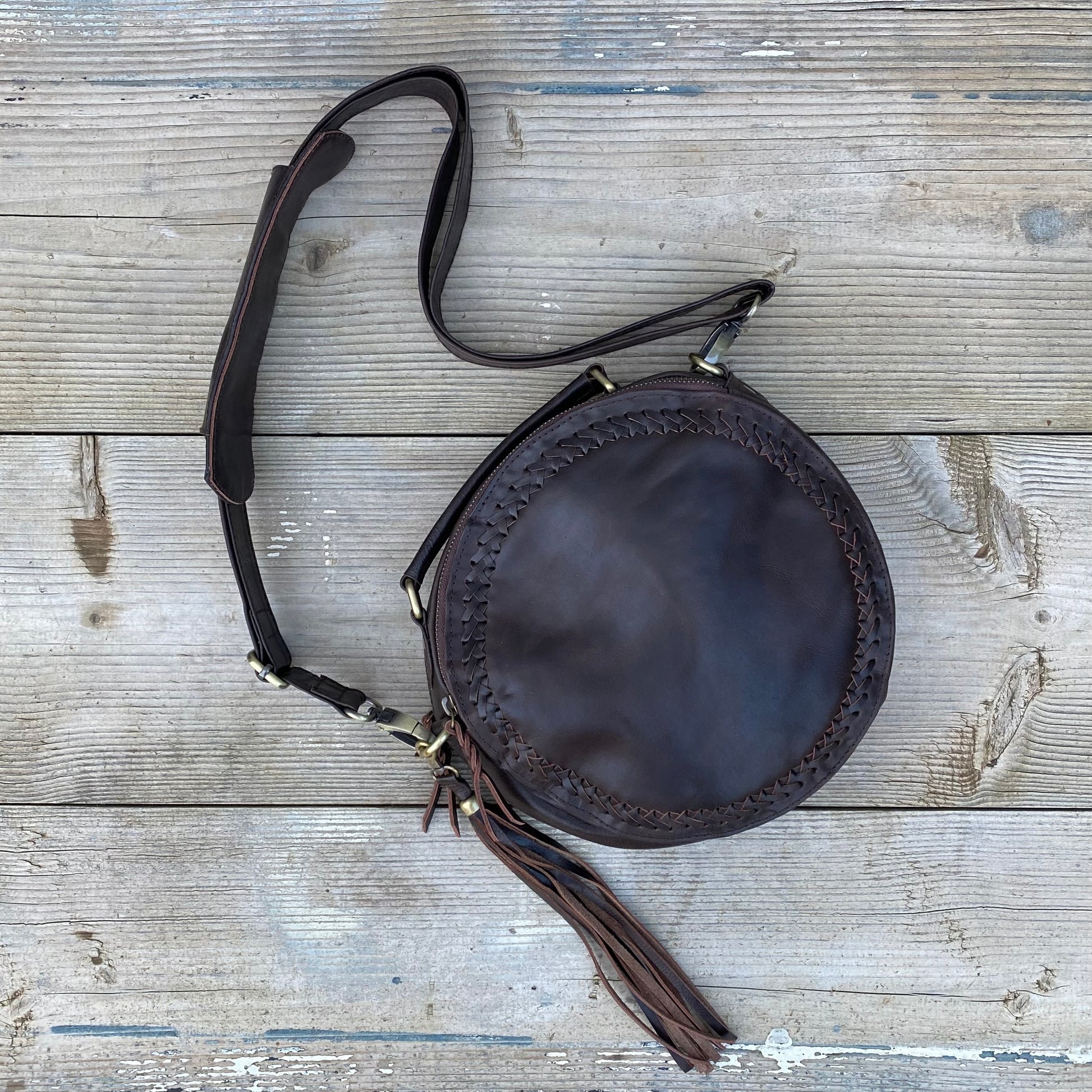 The Leather Round bag is a stunning, elegant yet classic design with its beautiful plain leather front and criss-cross leather stitching around the edge. Making this a definite head-turner with any outfit.