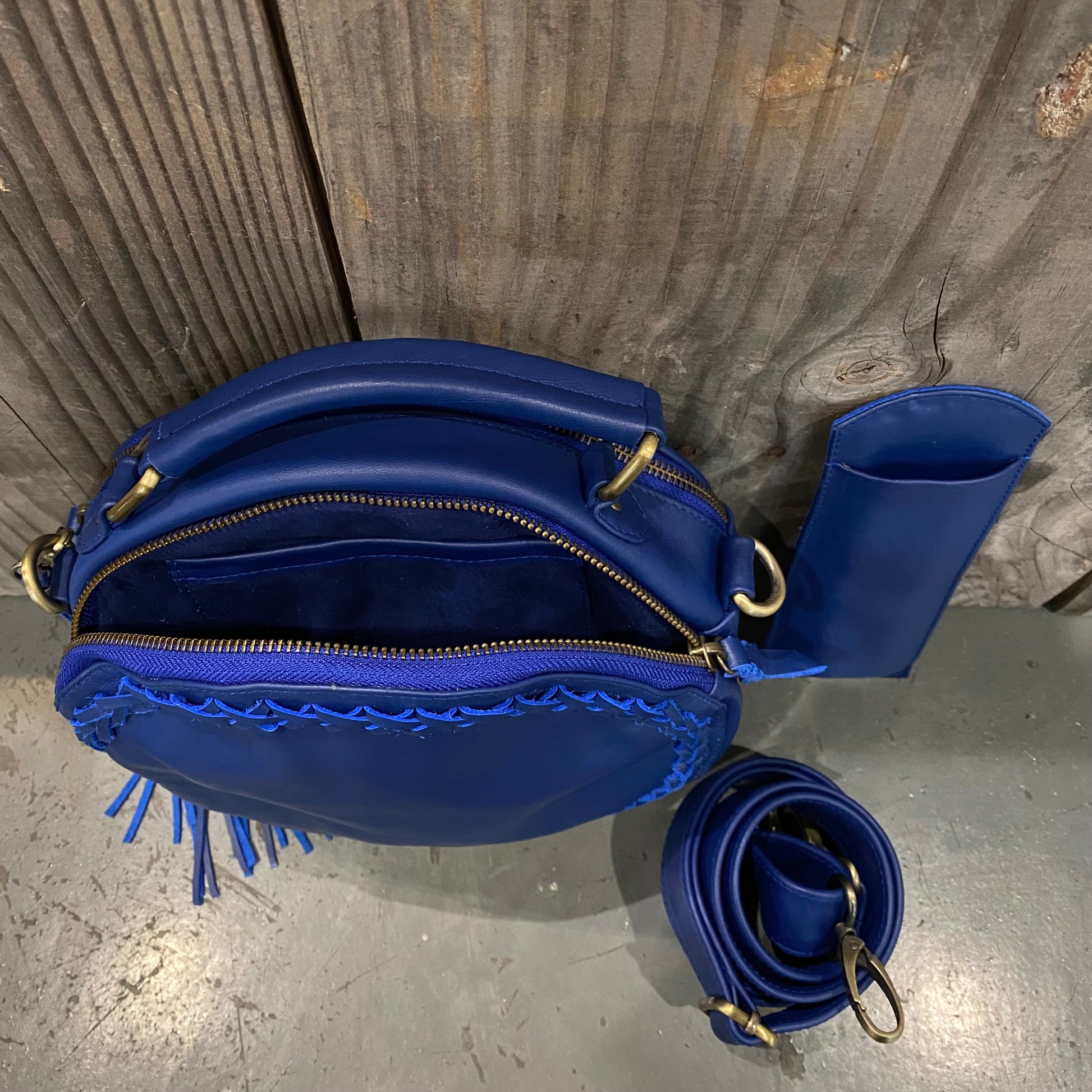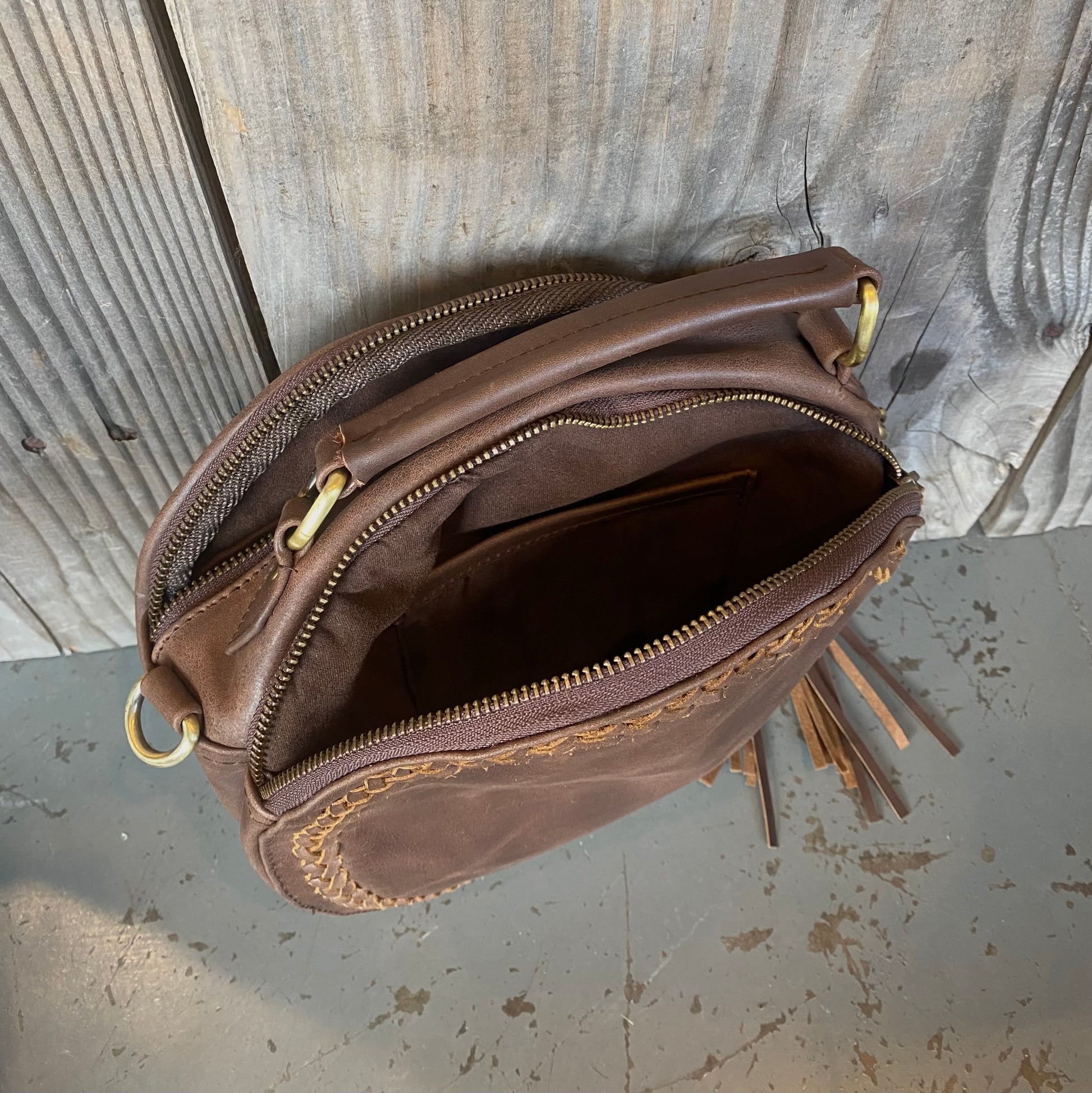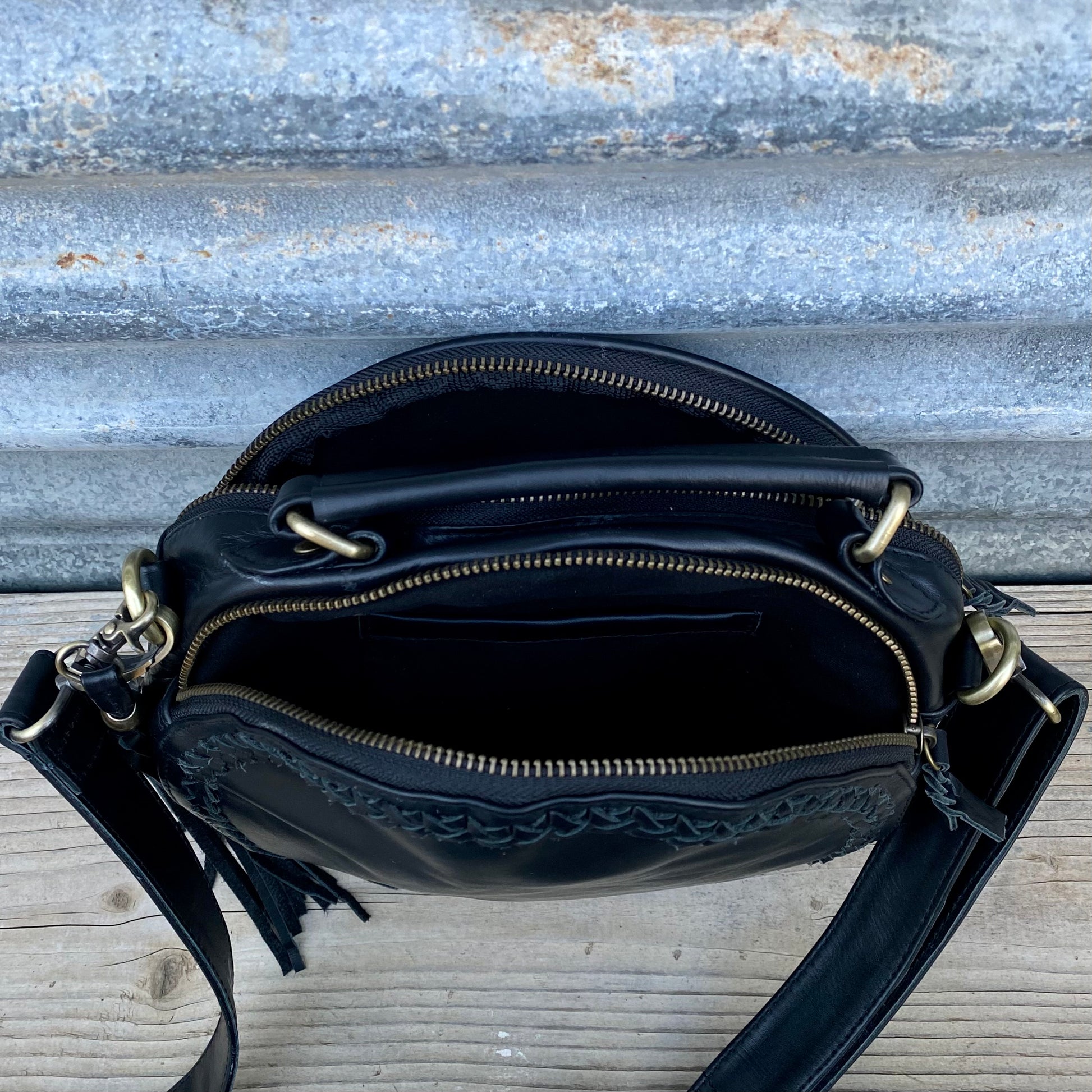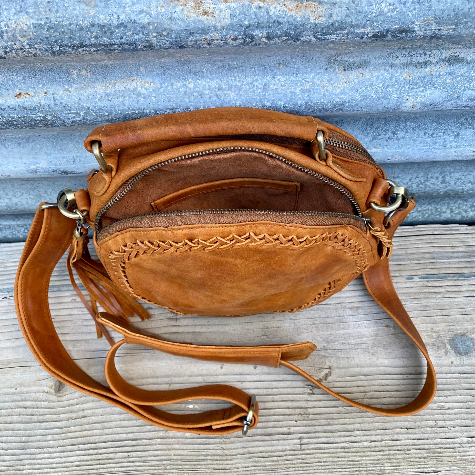 The Leather Round bag is a stunning, elegant yet classic design with its beautiful plain leather front and criss-cross leather stitching around the edge. Making this a definite head-turner with any outfit.
