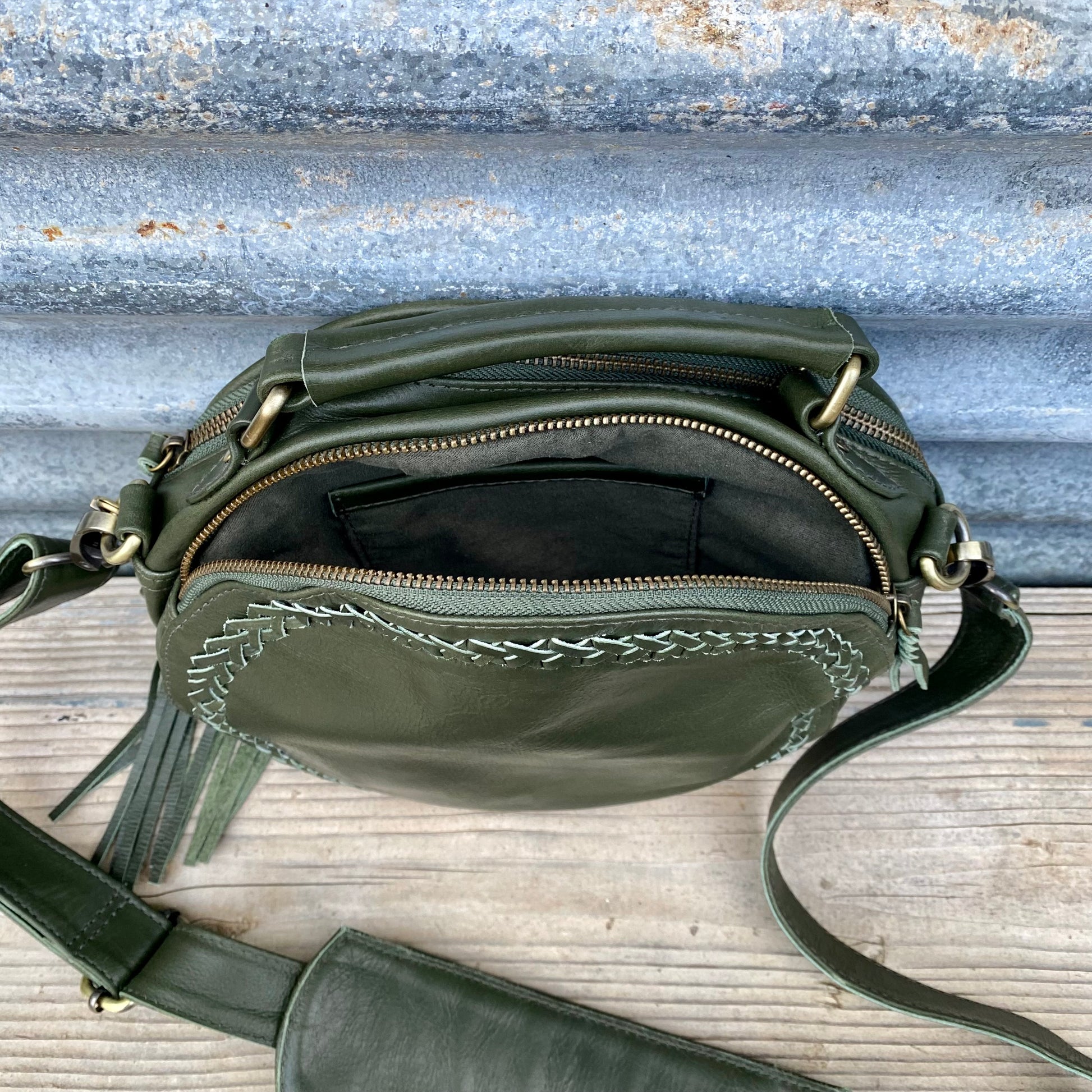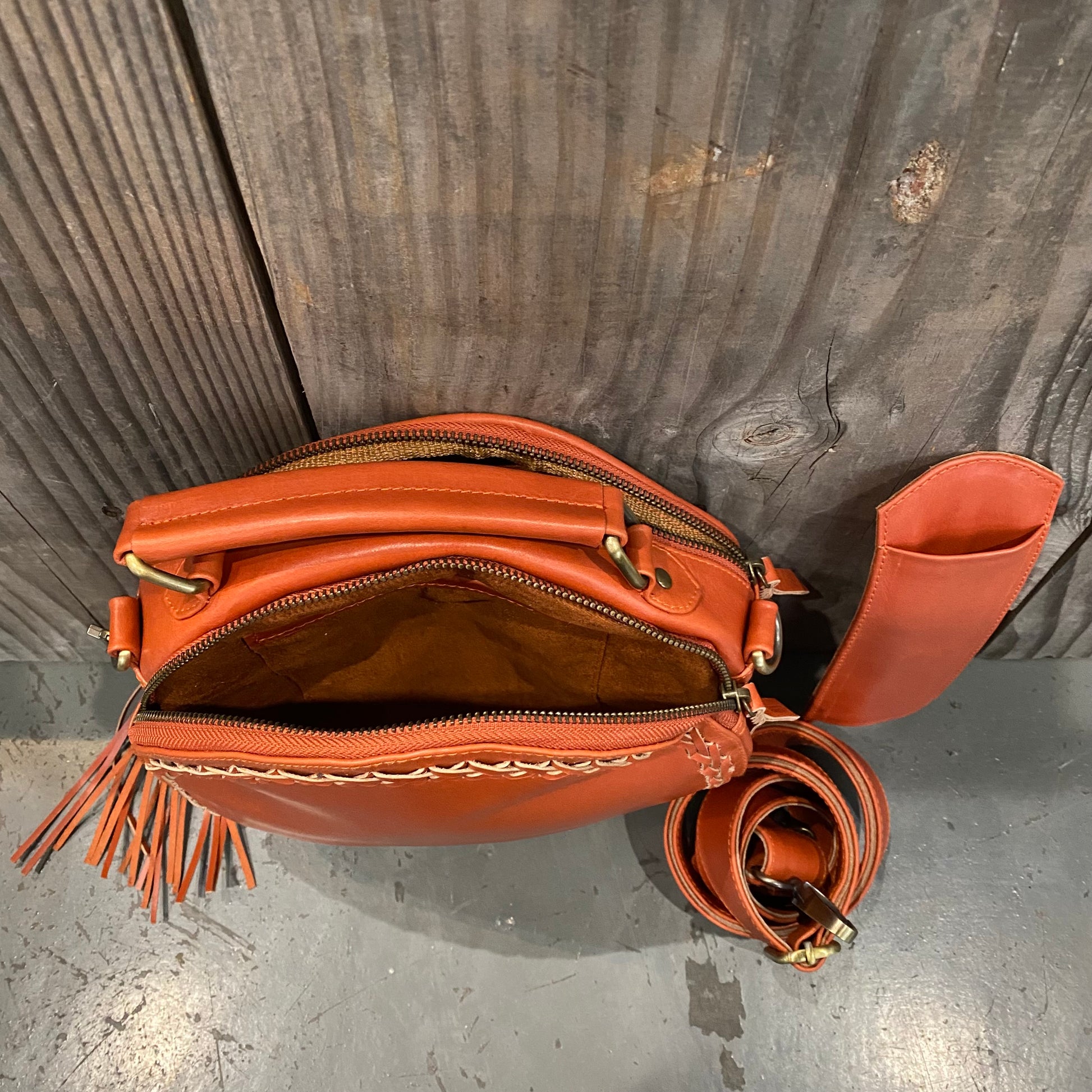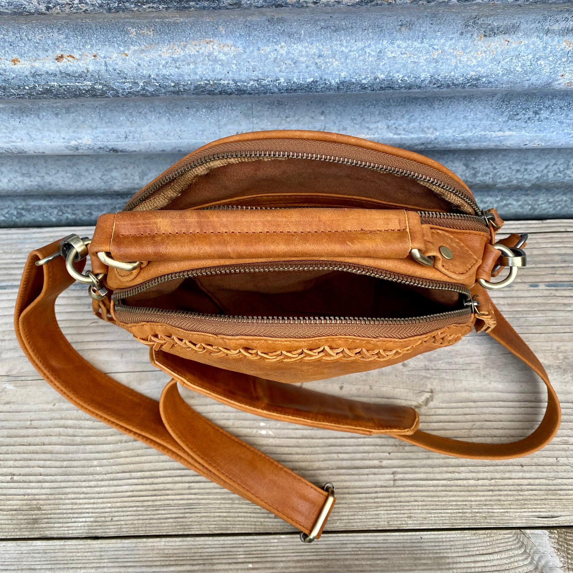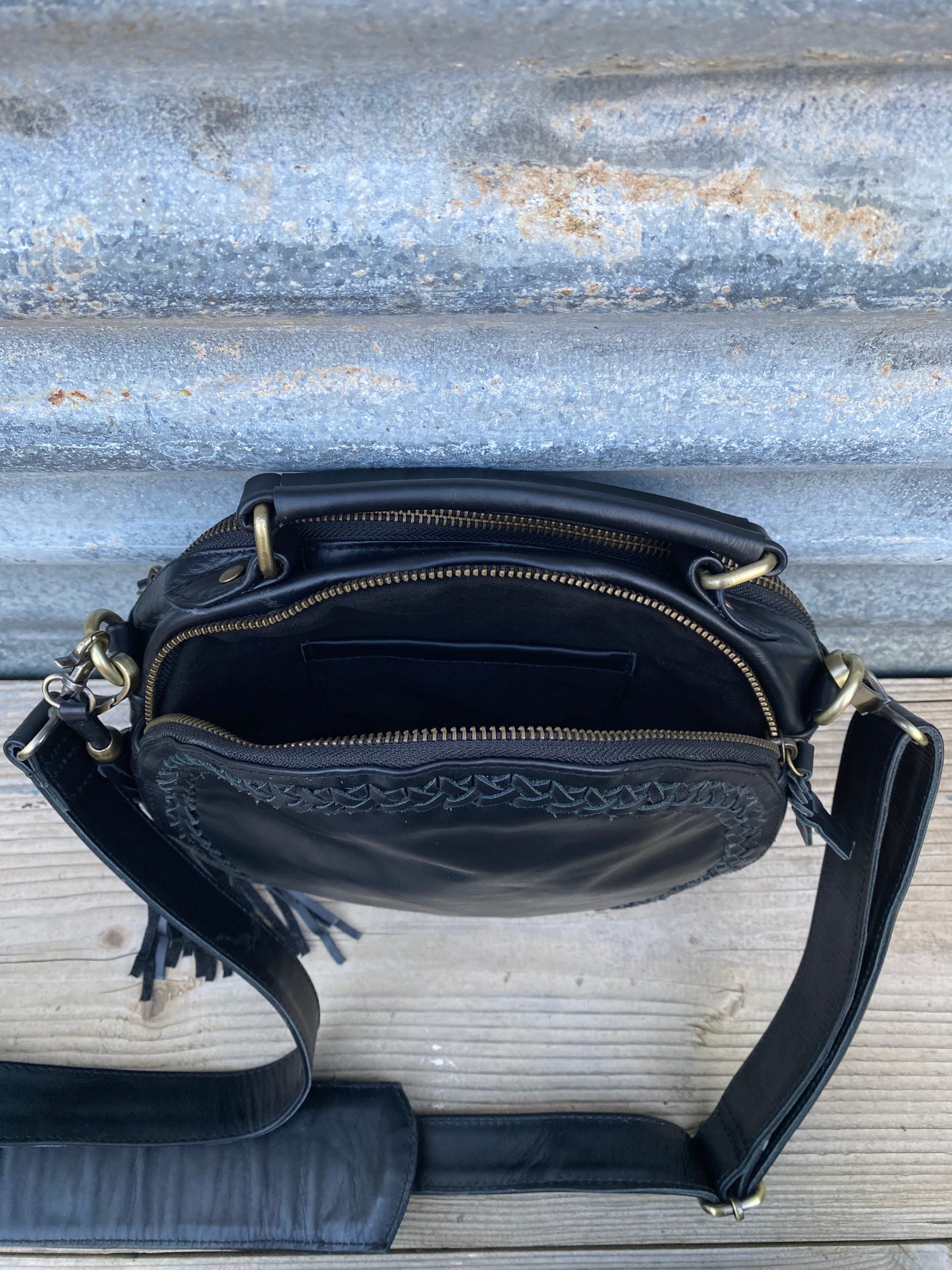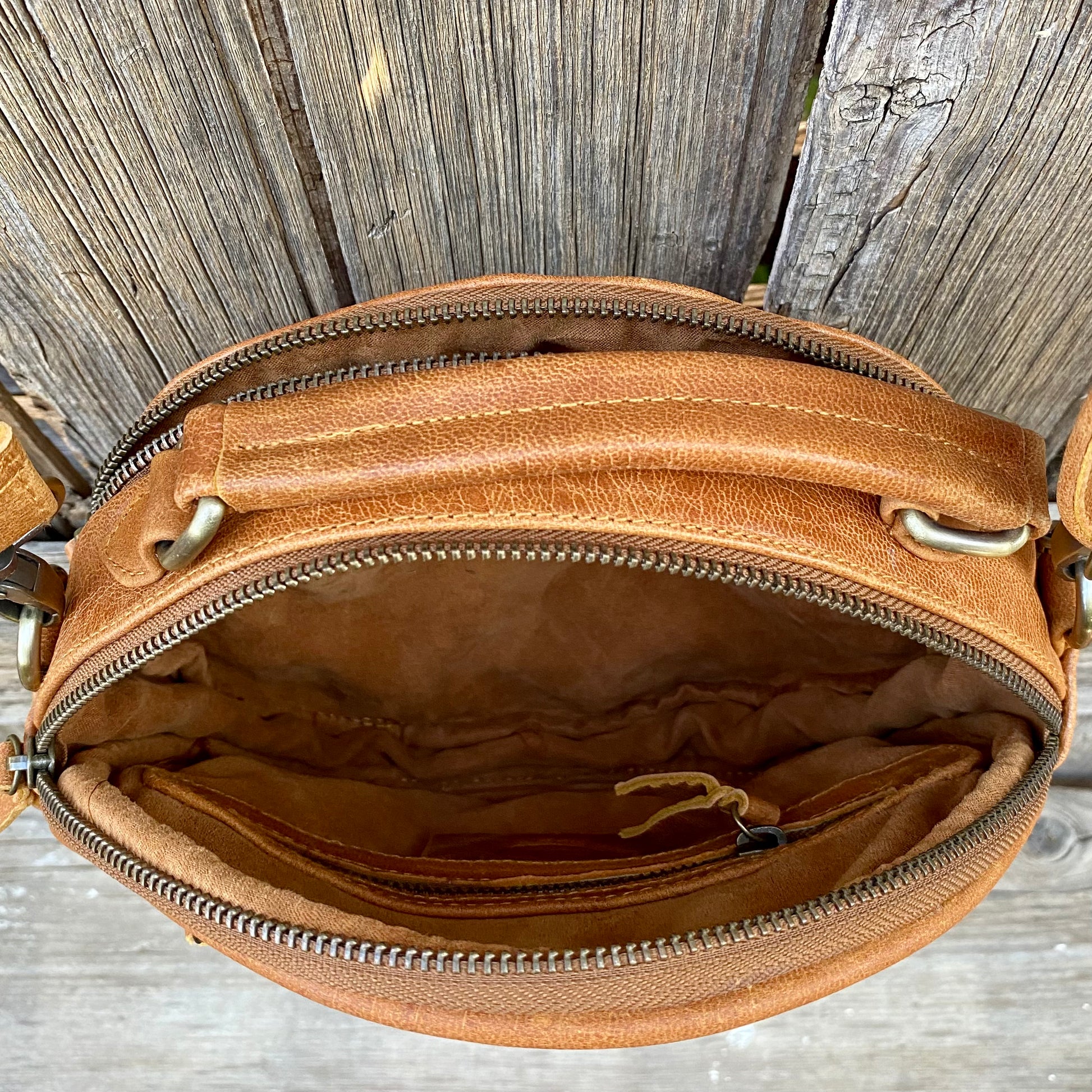 The Leather Round bag is a stunning, elegant yet classic design with its beautiful plain leather front and criss-cross leather stitching around the edge. Making this a definite head-turner with any outfit.