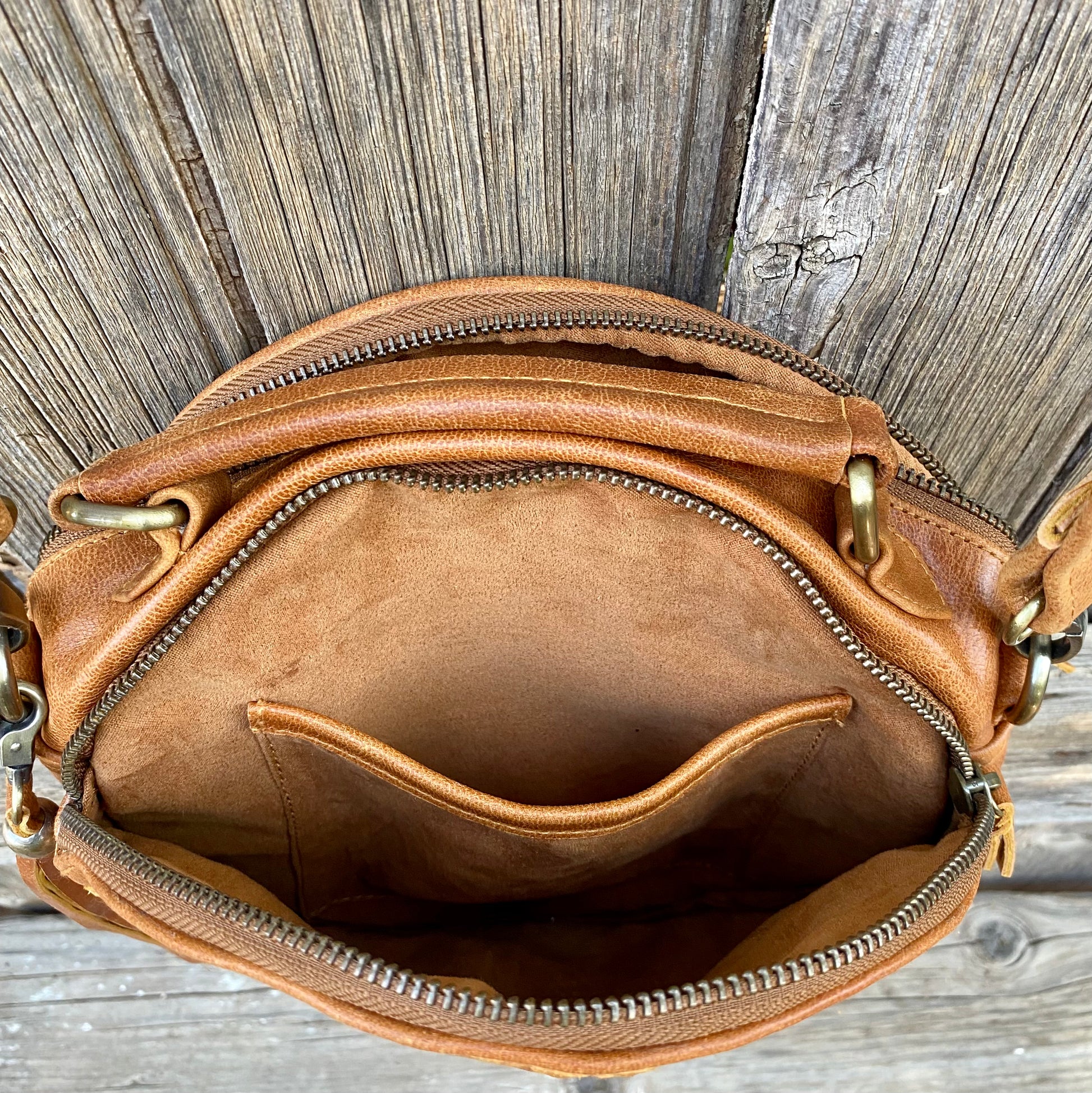 It is perfectly used with the little hand strap for evening time or with the adjustable long strap with shoulder protector for the lunch date and a spot of shopping. The inside is very deceivingly roomy with 2 x separate zippered compartments. One with an internal zipper and the other side with an open pocket. It can fit the Soft Wallet with no trouble.