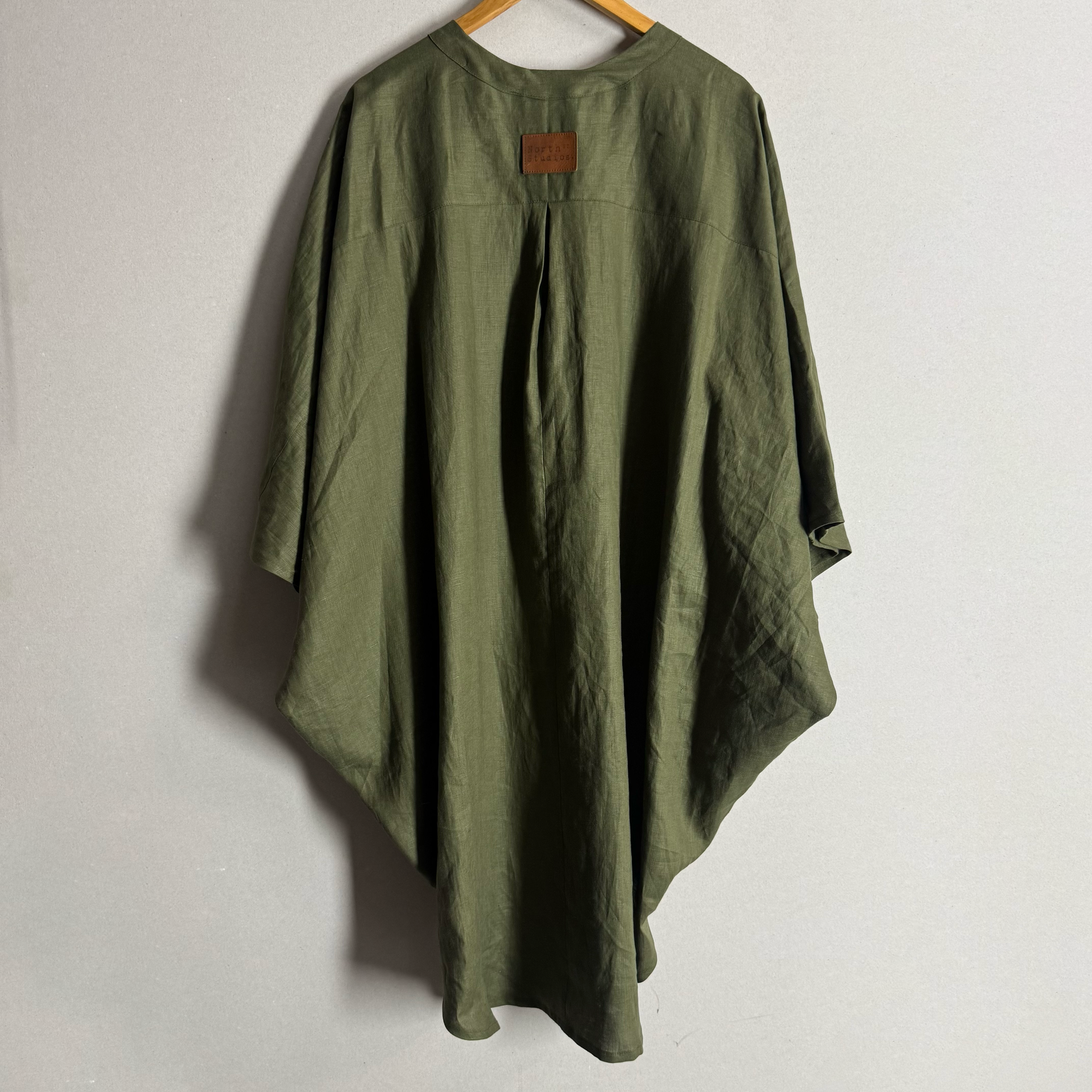 1. a natural fibre button-up cloak handcrafted in the Barossa Valley from fabrics made of the flax plant. a flowing shape to suit any sized figures.