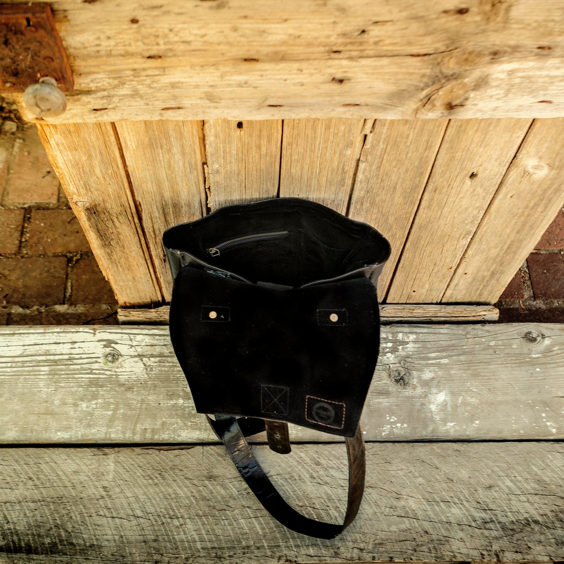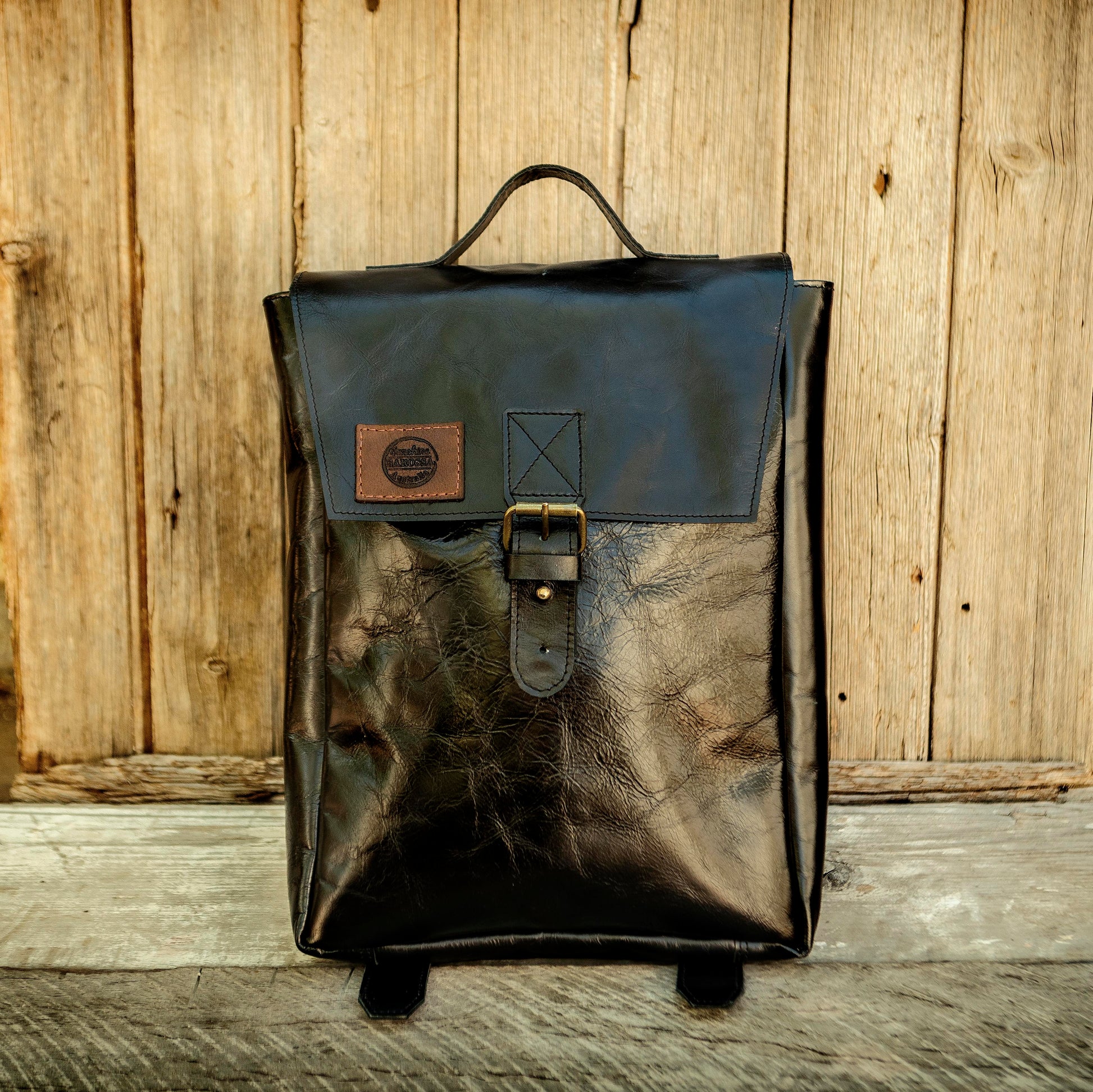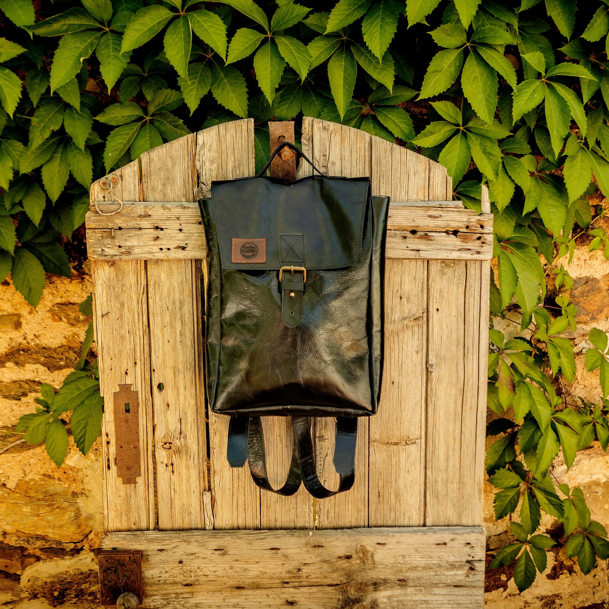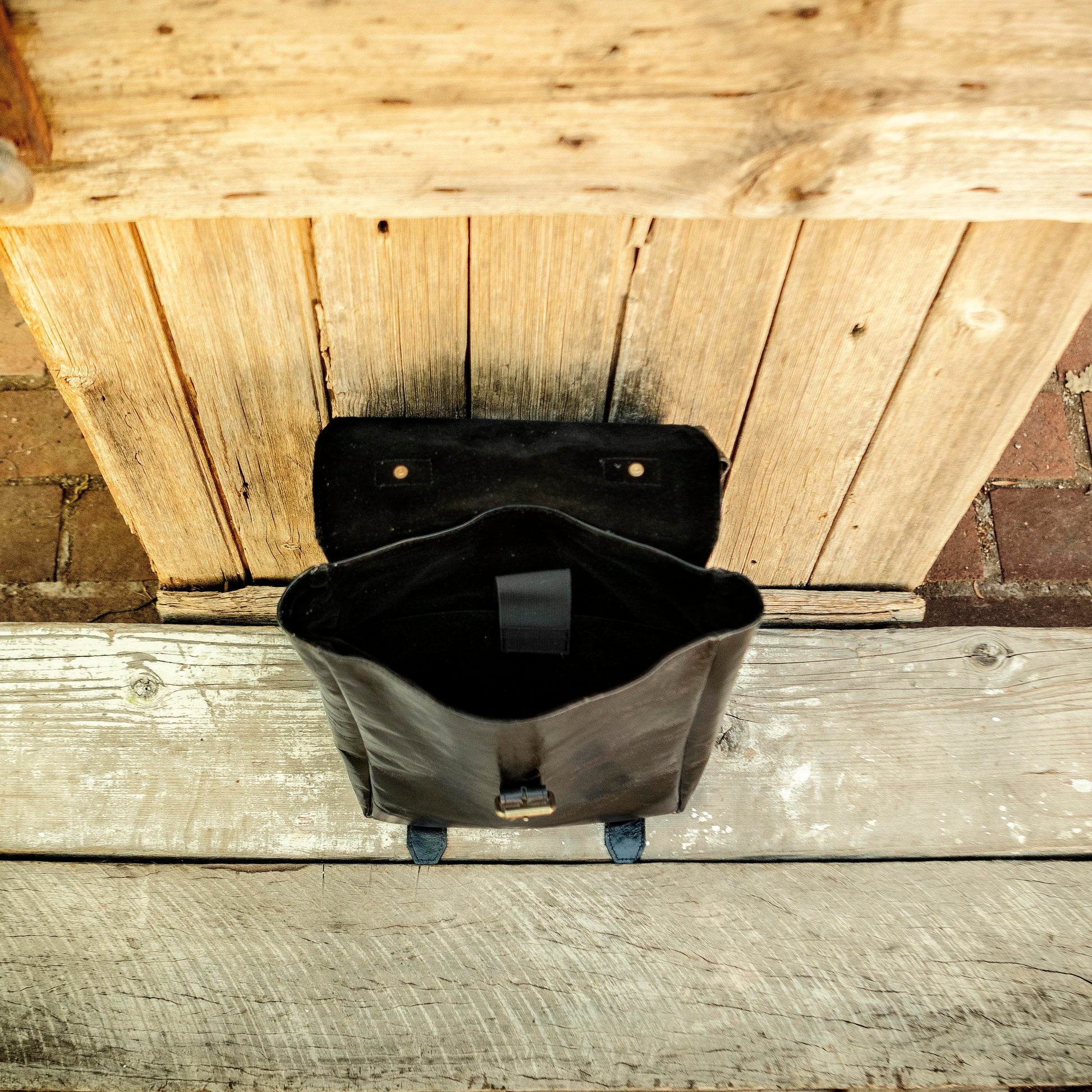 The leather is hard wearing, with sturdy belt like straps adjustable with antique brass buckles. A robust leather handle on top for a carry all. Fastened at the front with an antique brass buckle and also a button stud for added strength or ease.