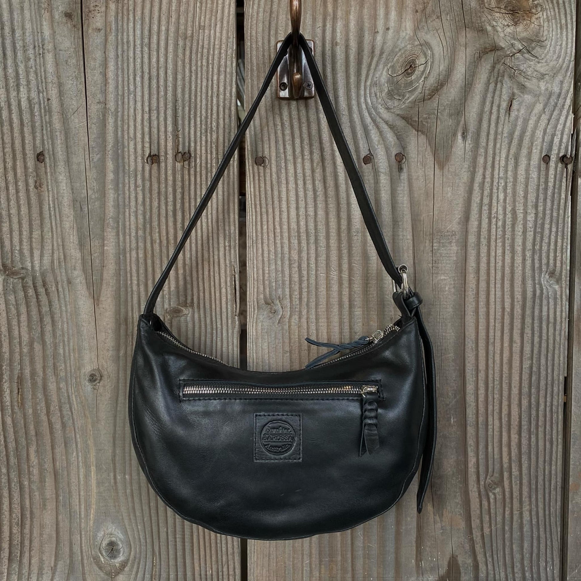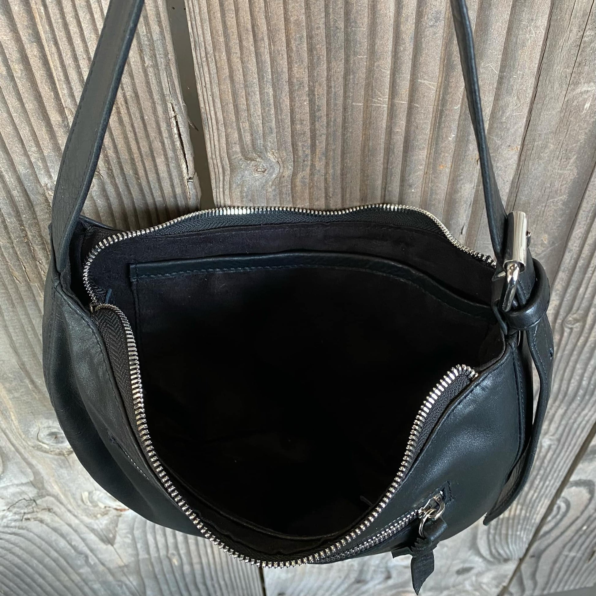 An adjustable strap that is fixed with a slide buckle at the side, is met with a zip along the top to open the main compartment.
