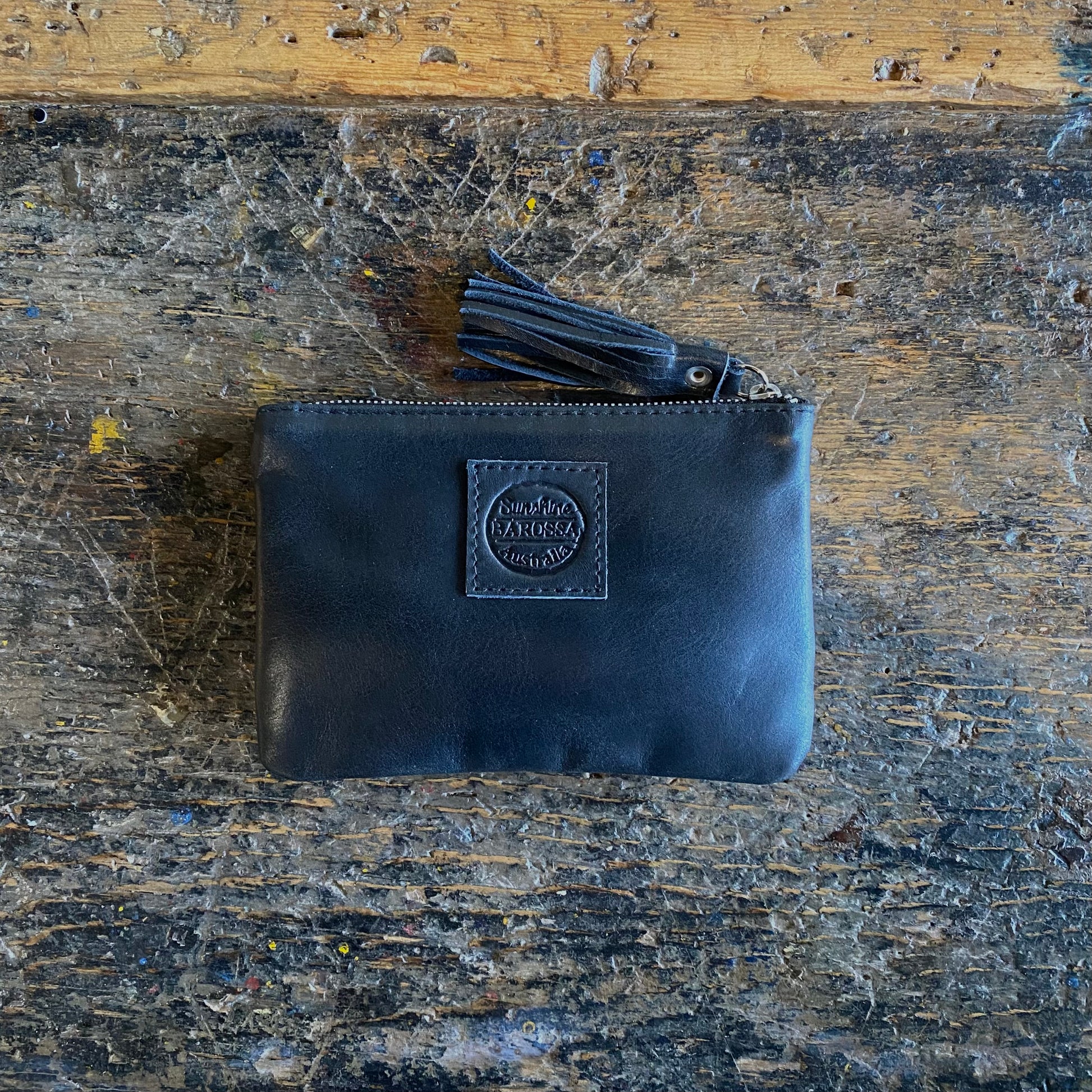 External vertical metal zippered back pocket 16cm with plaited leather pull