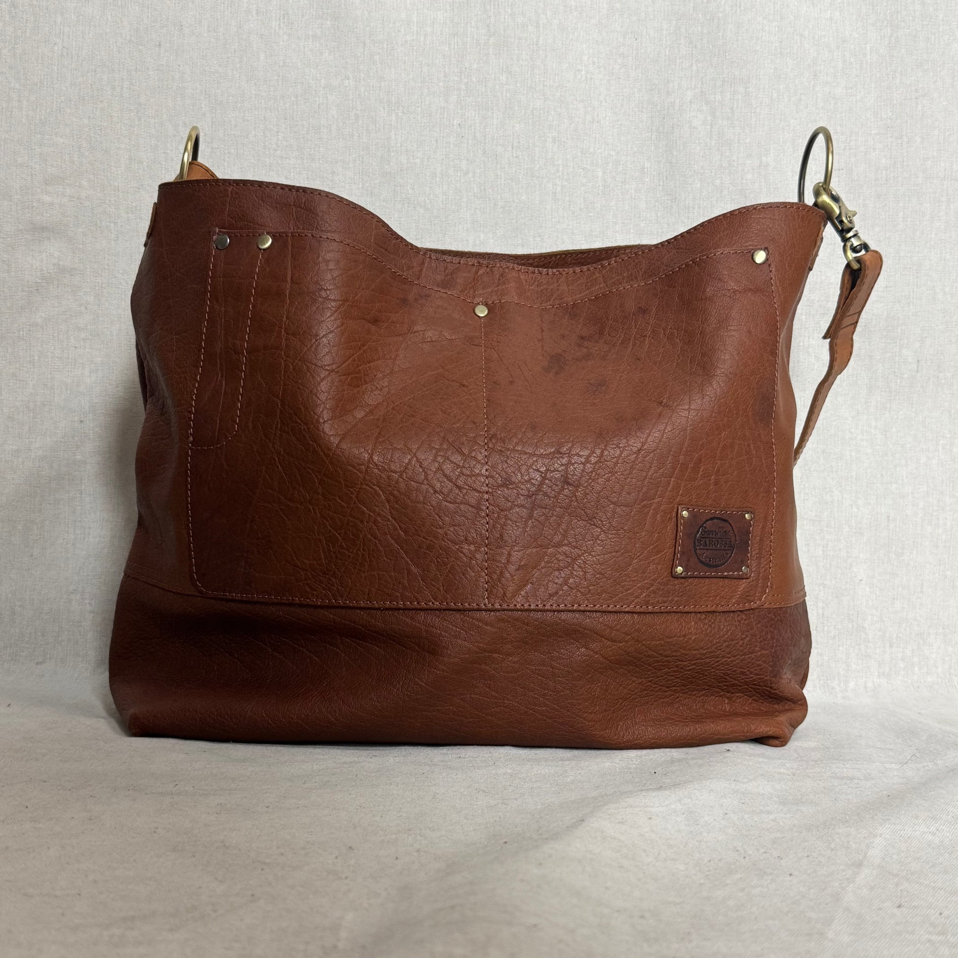 1. a unique slouchy tote-style bag crafted from a beautifully aged tan leather, completed with external and internal pockets, contrast stitching, and antique brass hardware. the numerous pockets and wide structure make the bag large enough to have no issues fitting as much or as little as you need. the bag sits comfortably like a slouch, but has a single strap like a classic tote, connected to the bag with stunning antique brass clip closures.