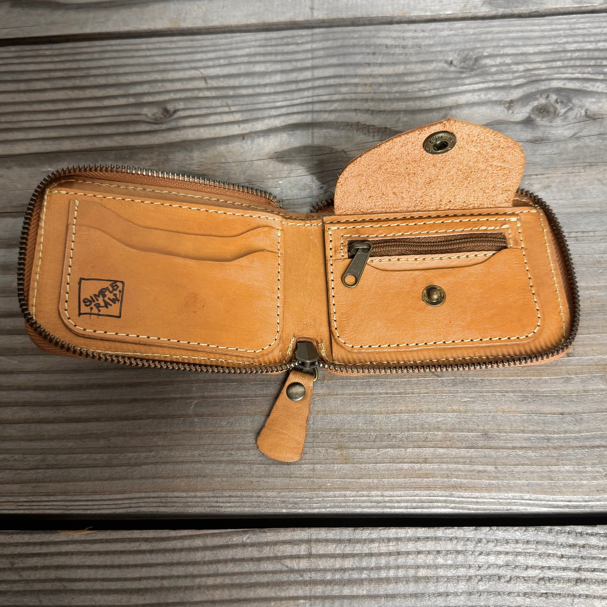 1. a zip-up wallet crafted from a vegetable tanned leather.